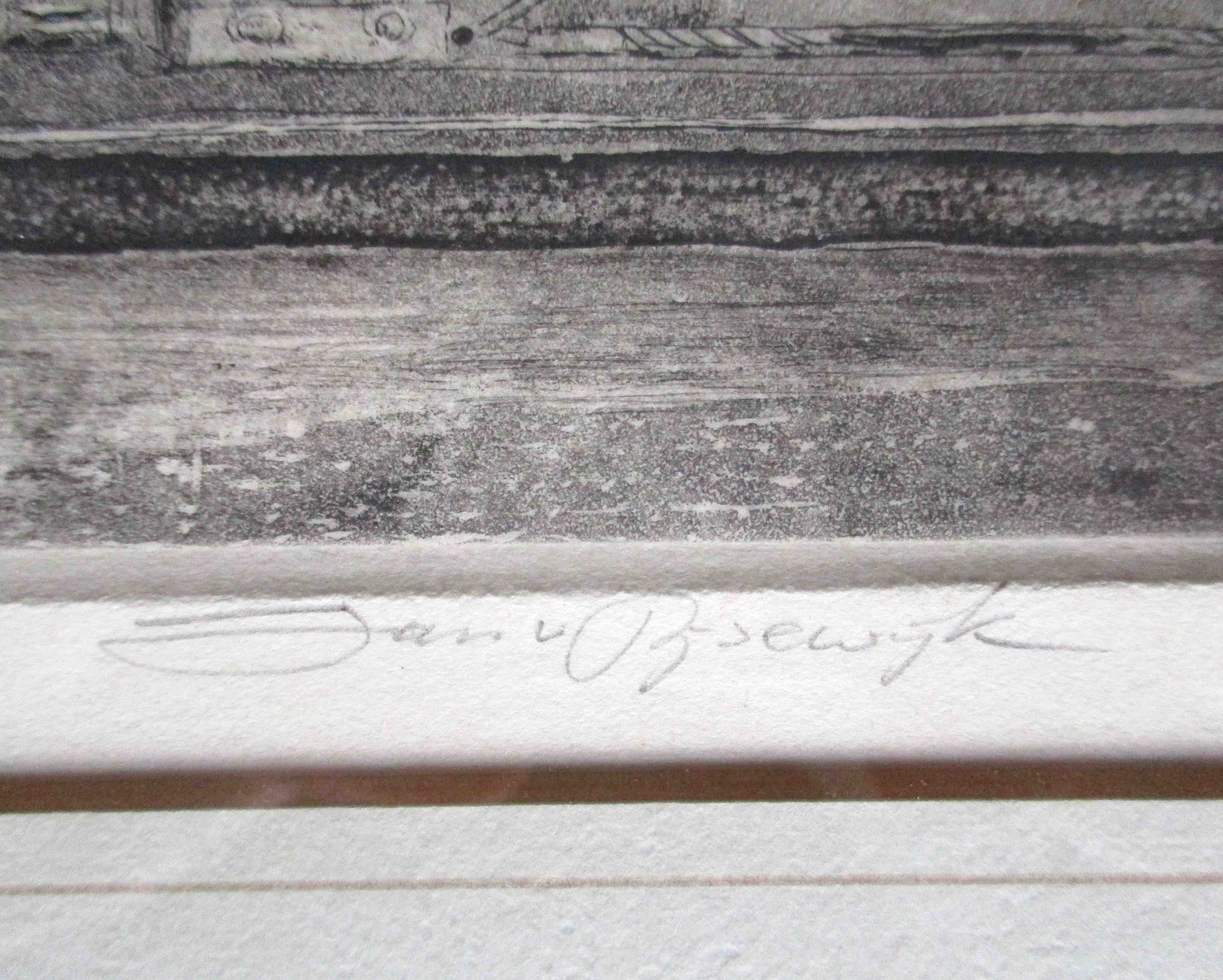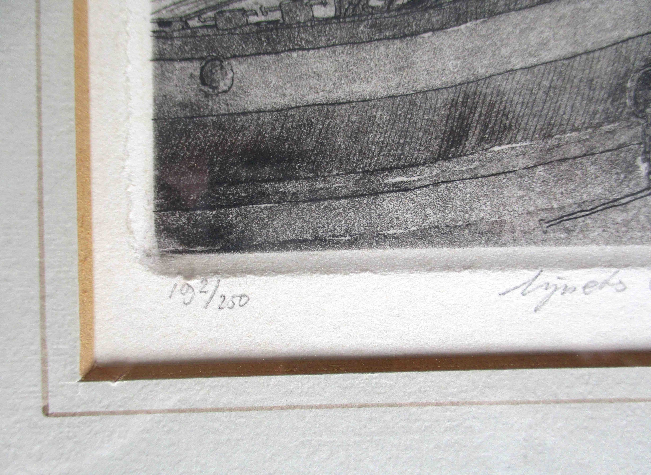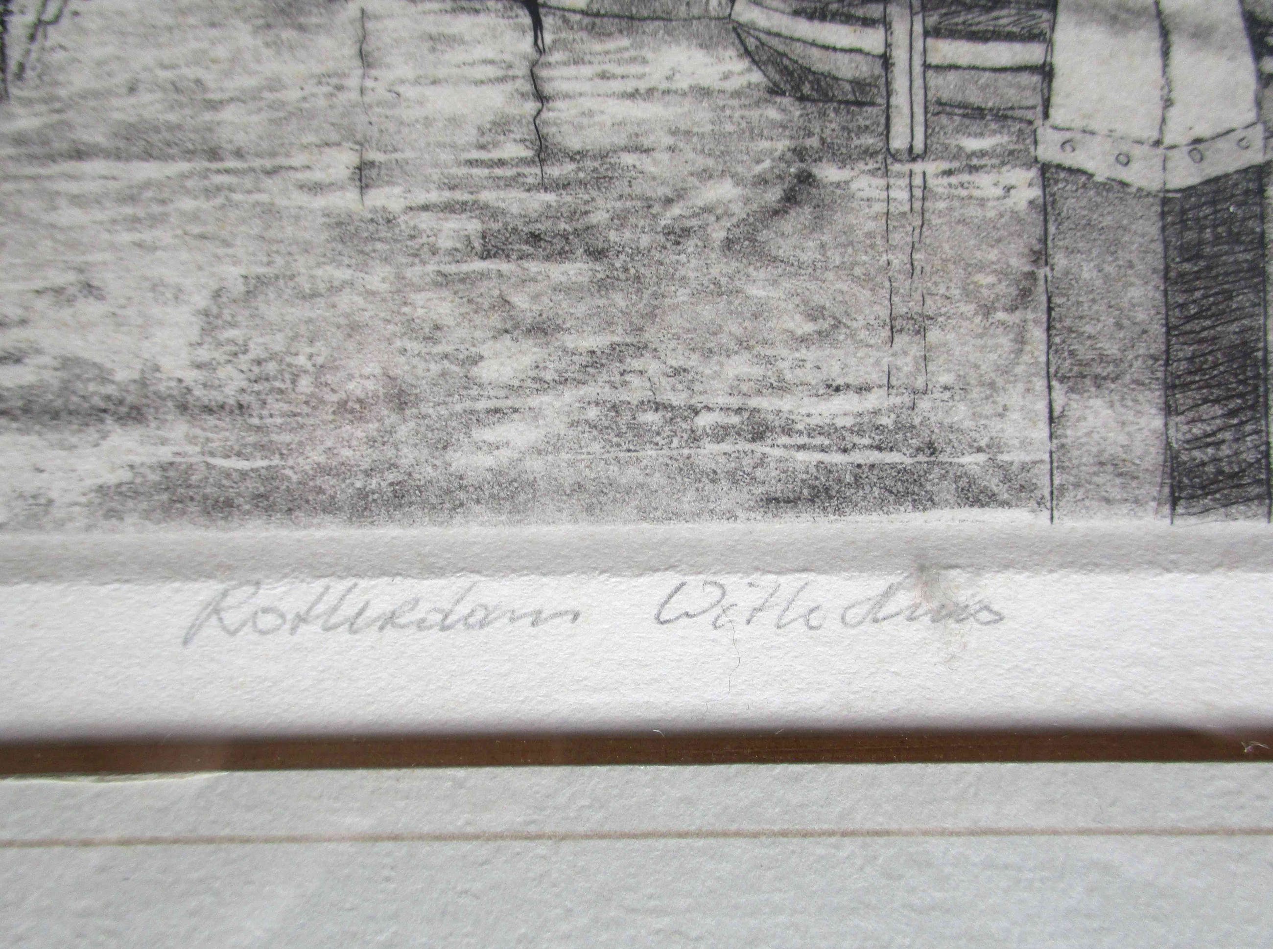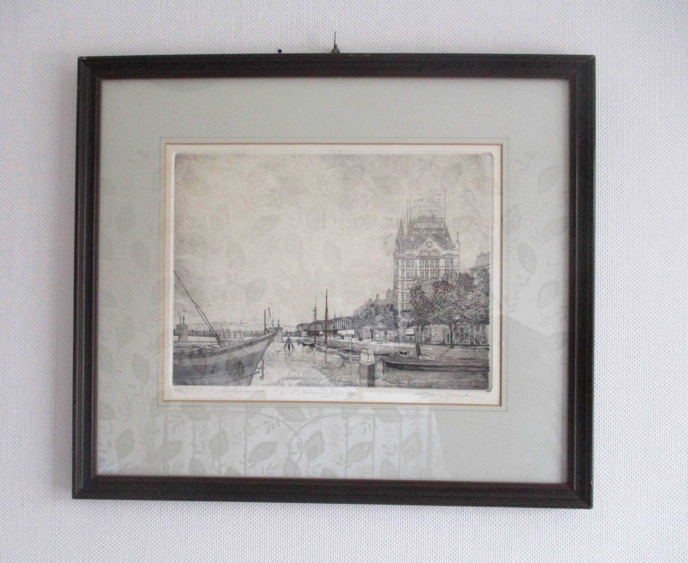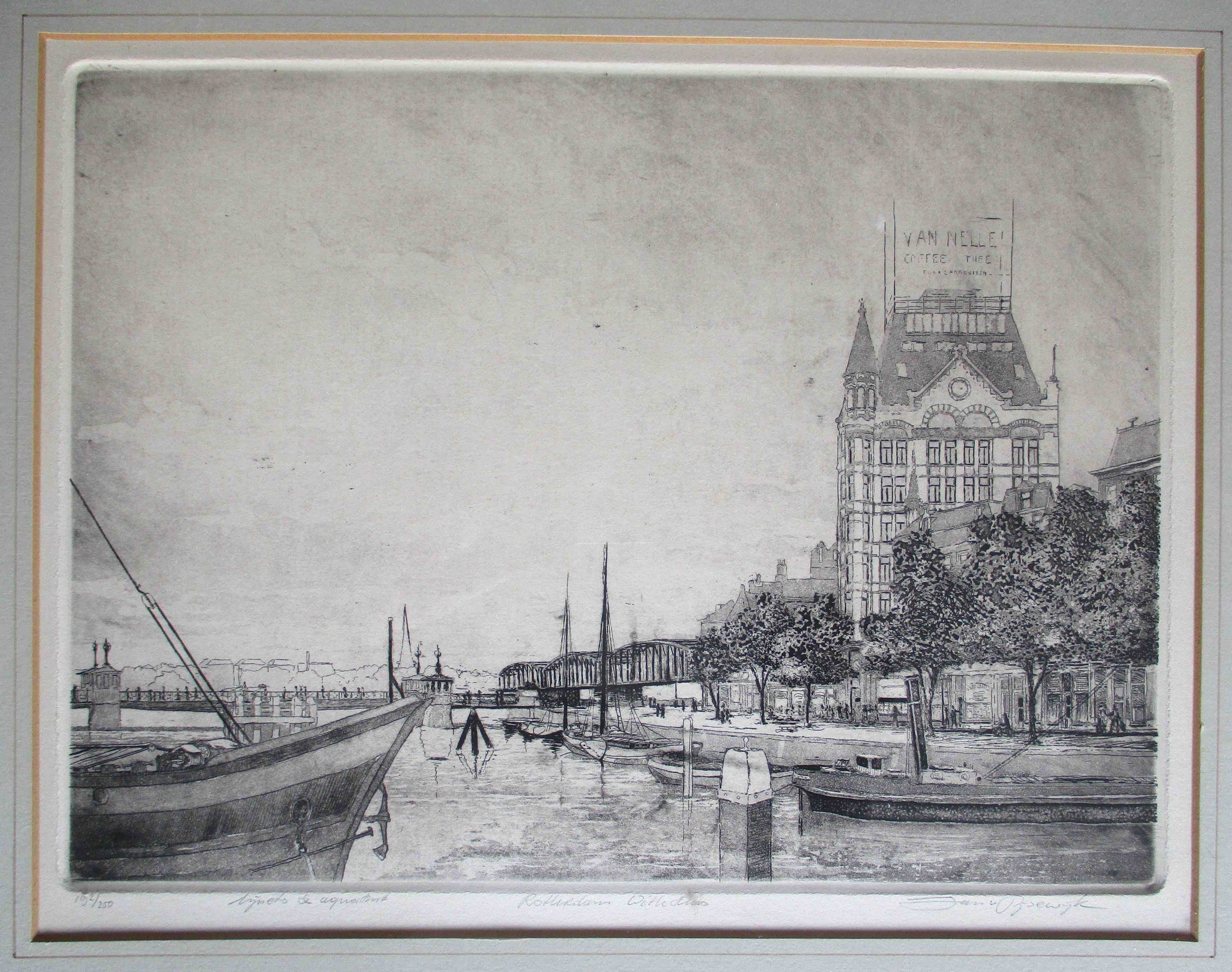 Ets en aquatint van Jan van Rijsewijk, voorstellende het Witte Huis te Rotterdam, niet gedateerd. Handtekening in potlood, rechtsonder. Oplage: 192/250. Ingelijst en in passe-partout.