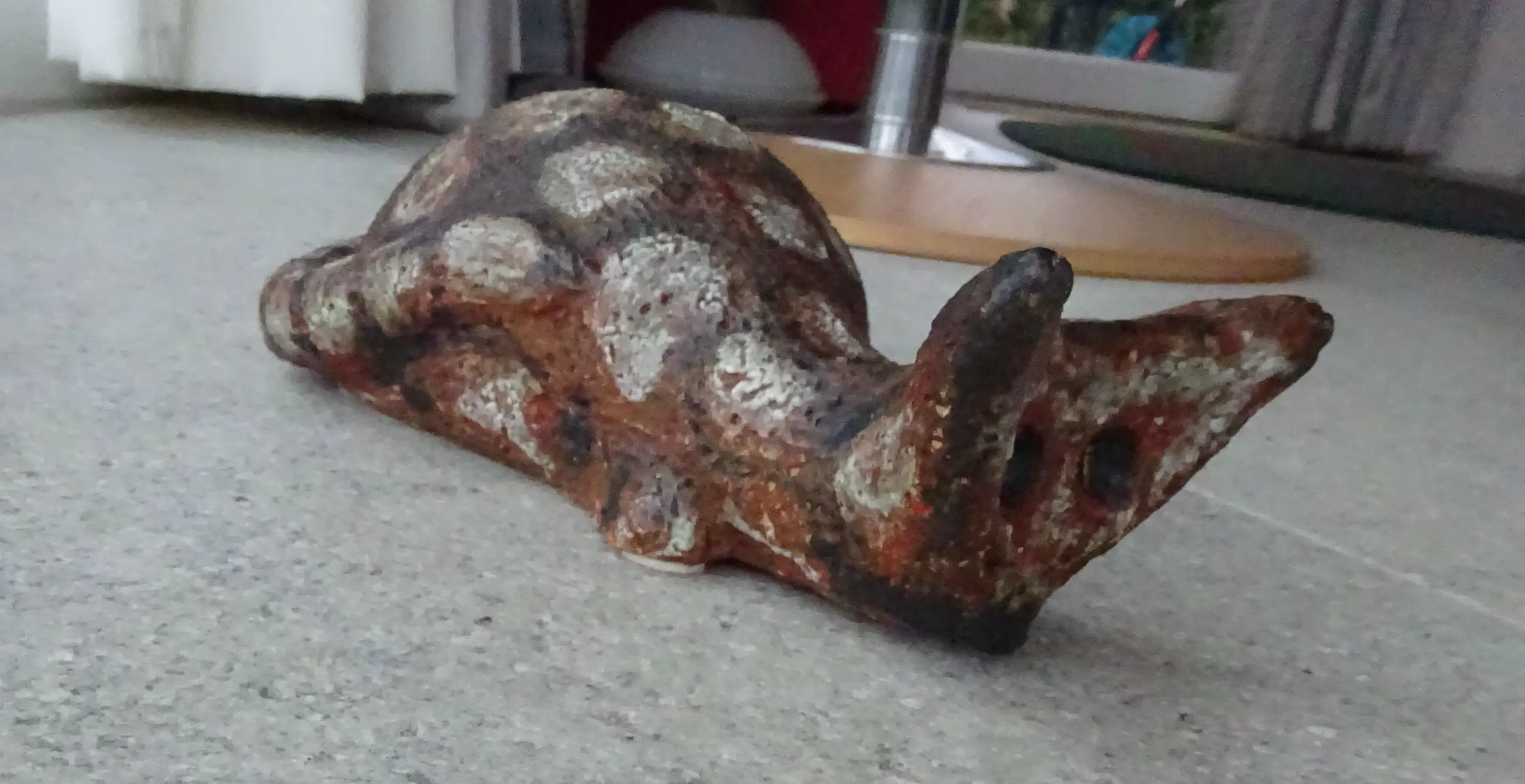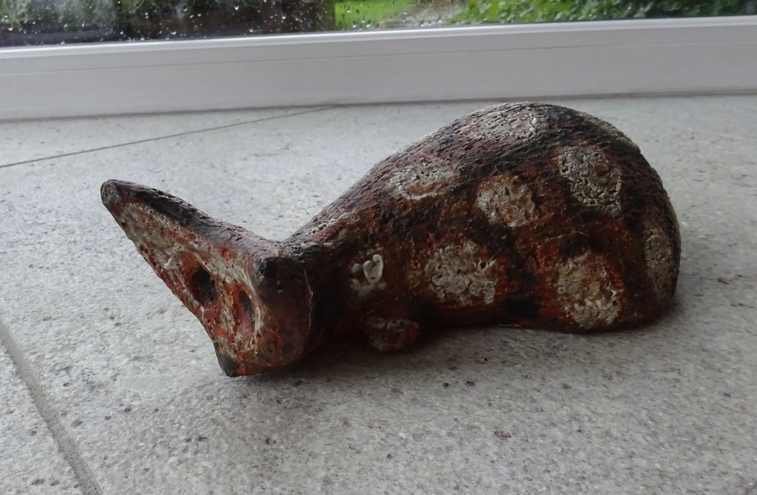 Plastiek: van een op de loer liggende kat- zeldzaam Keramist: Jan van Stolk (1920-1997) Afmetingen: 30 x 15 x 10 cm Materiaal: chamotte klei Jaar: ca 1960 Signatuur binnenzijde: VS geschilderd ( zie foto's) Conditie: prachtige staat, klein ruw puntje aan een van de oren