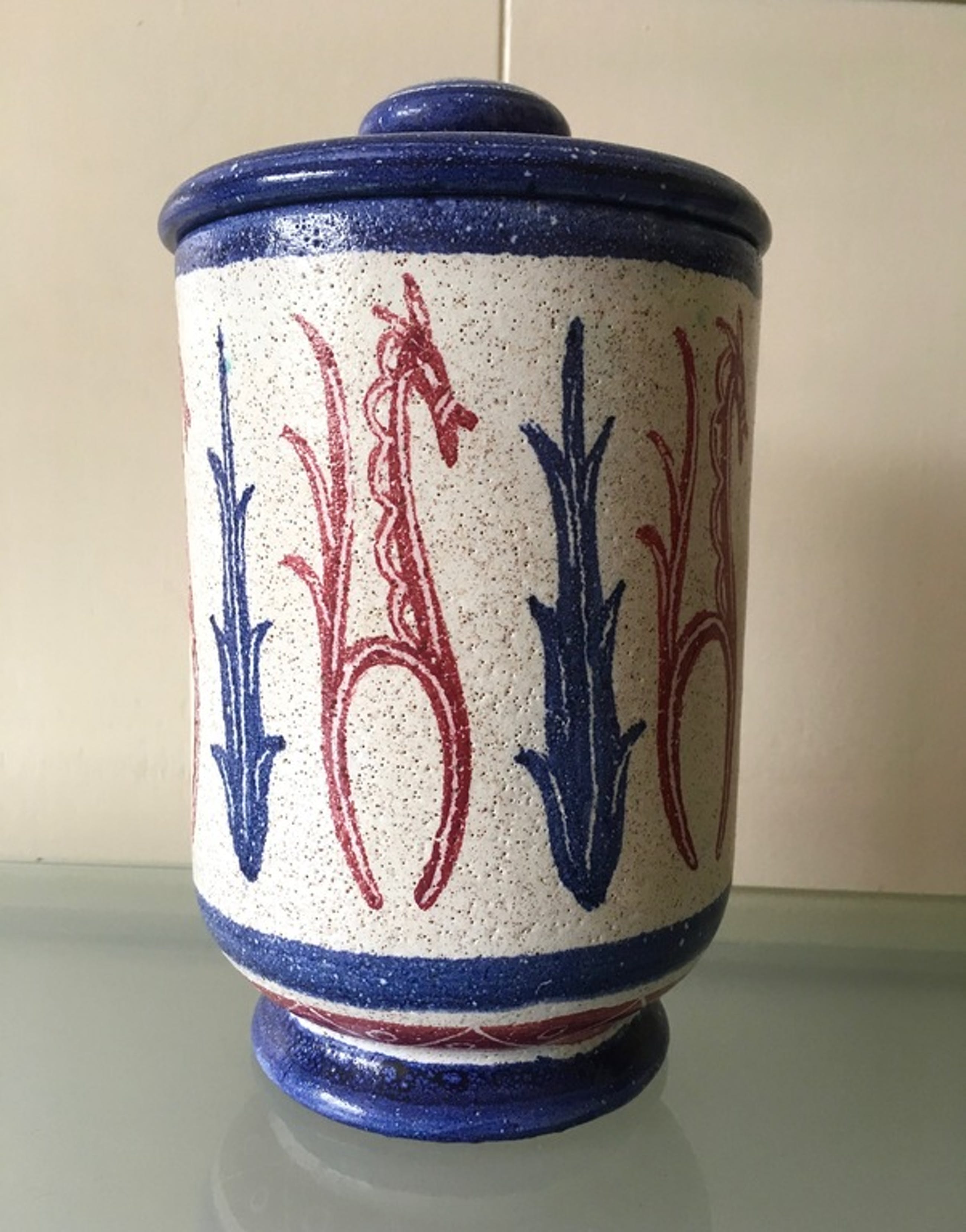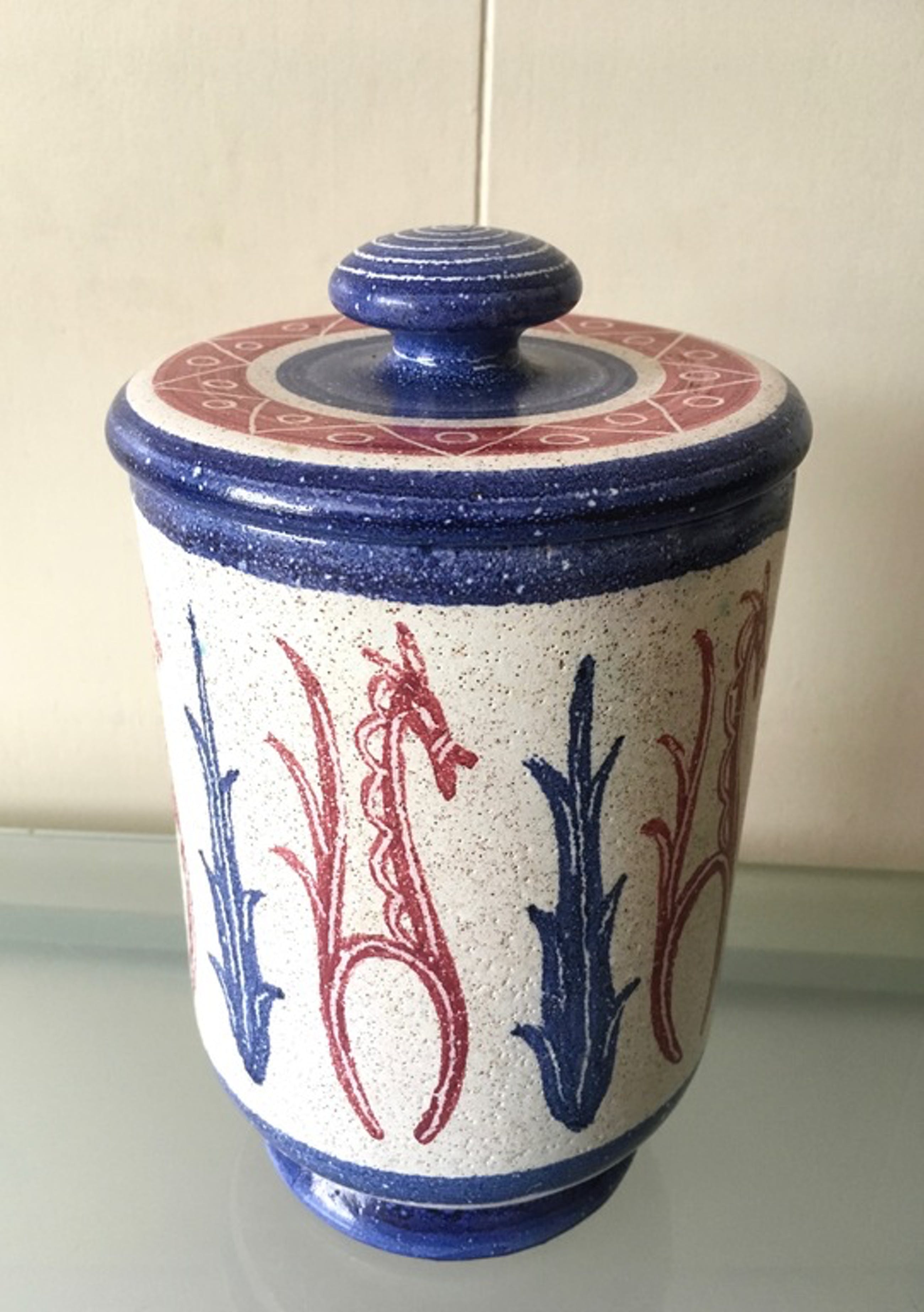 Grote deksepot vervaardigd door Jan van Stolk met decoratie van gestileerde paarden door Simon Engelhard, ca. 1950-1952.
