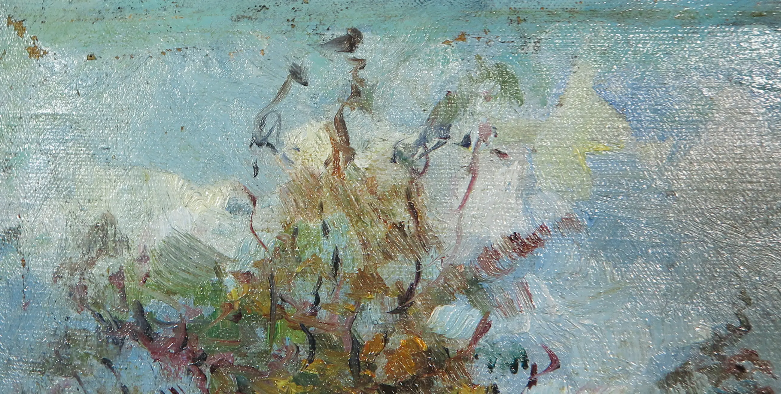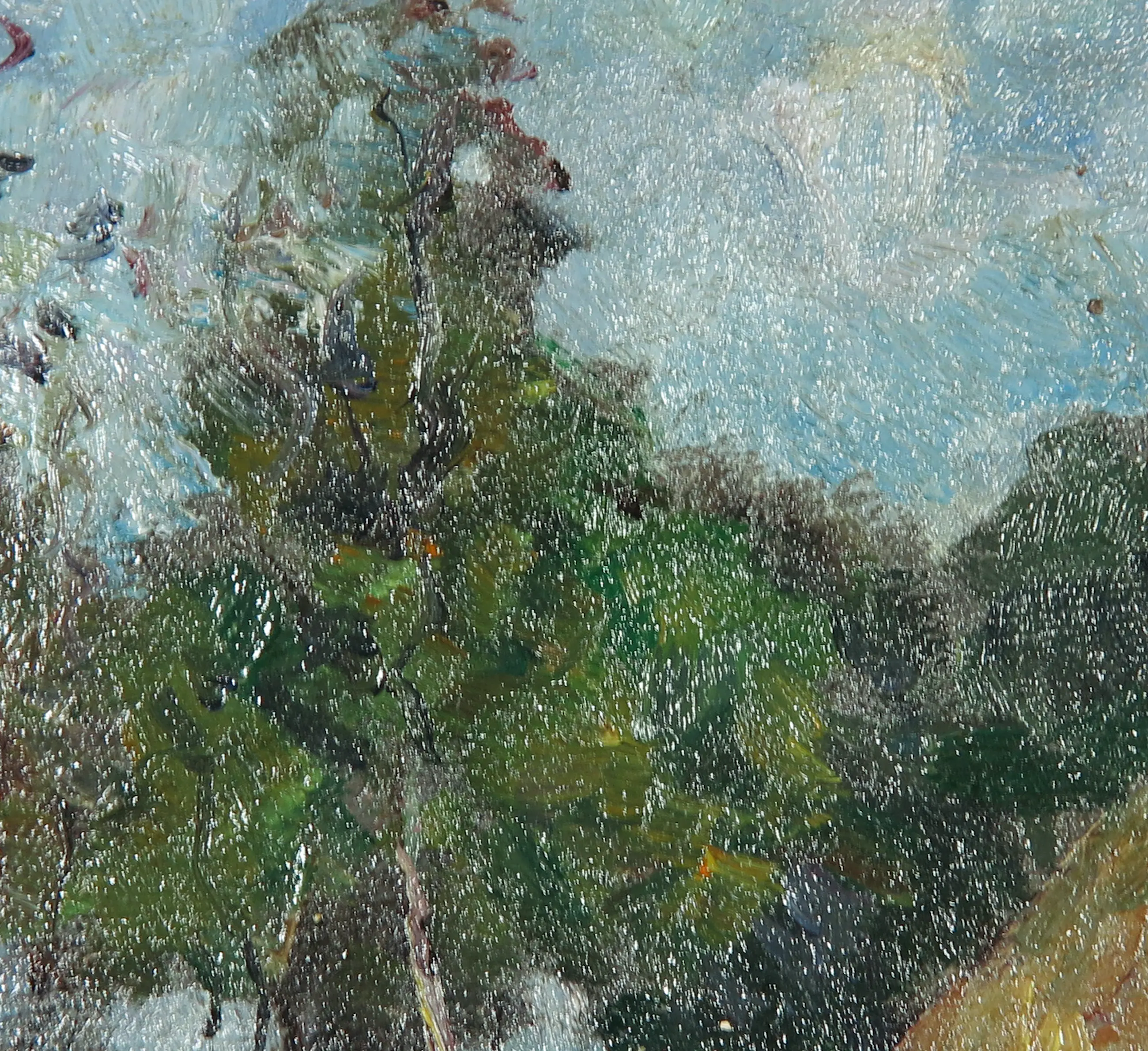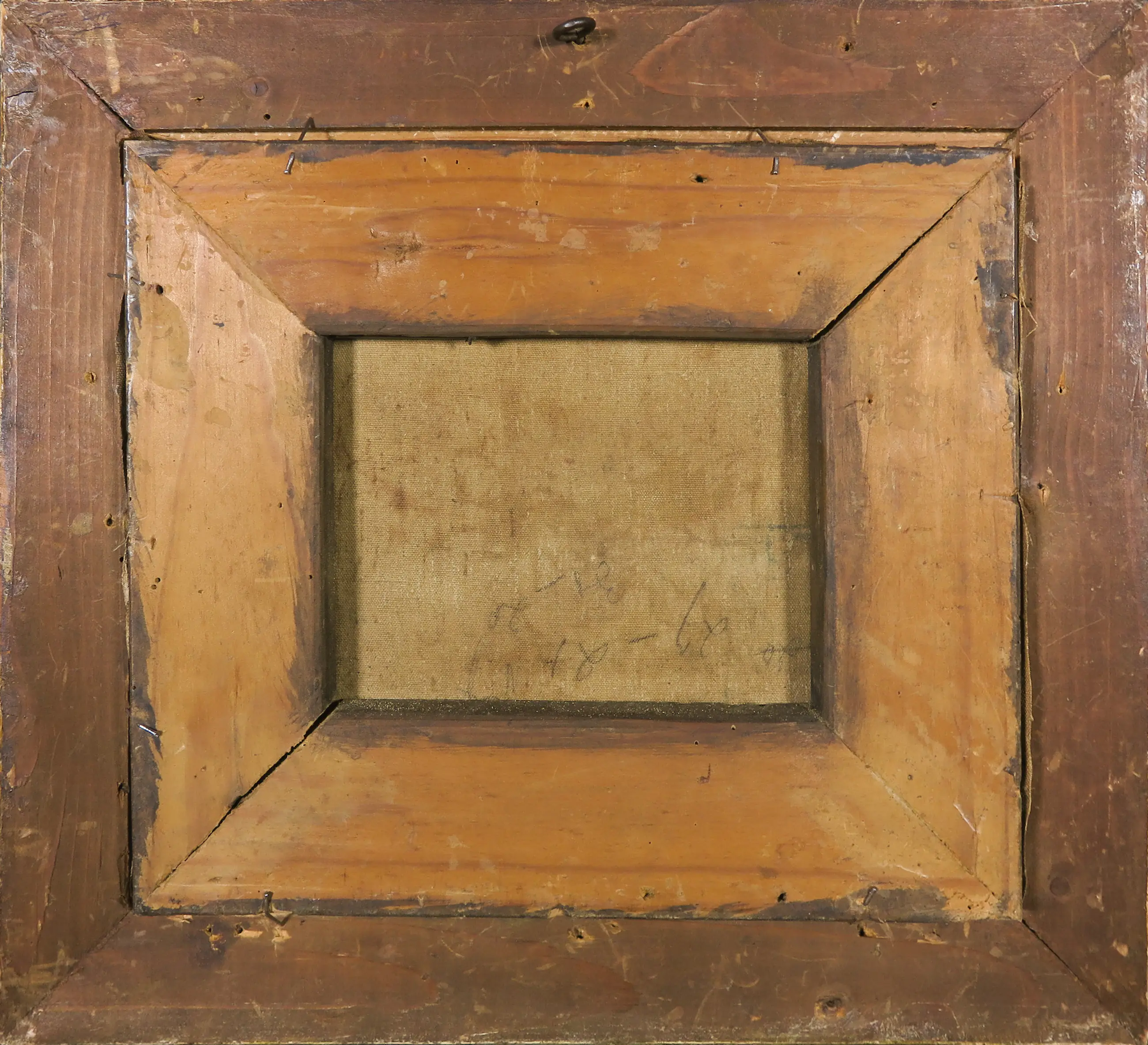 | Het werk dient opnieuw te worden gespannen. En heeft aan de bovenzijde op enkele plekjes met verfschade. (Zie detailfoto's) Daarnaast is de lijst aan vervanging toe. | |