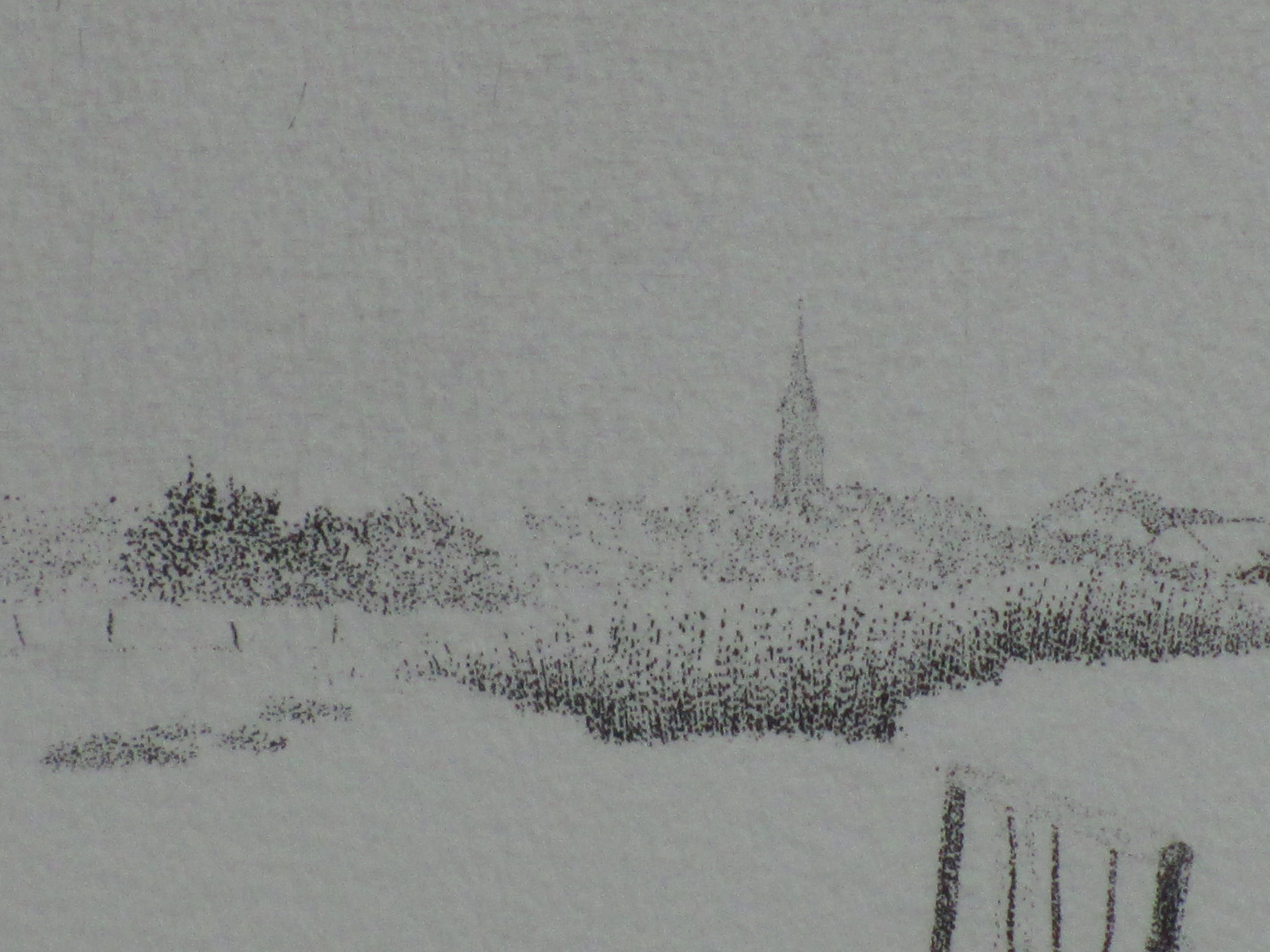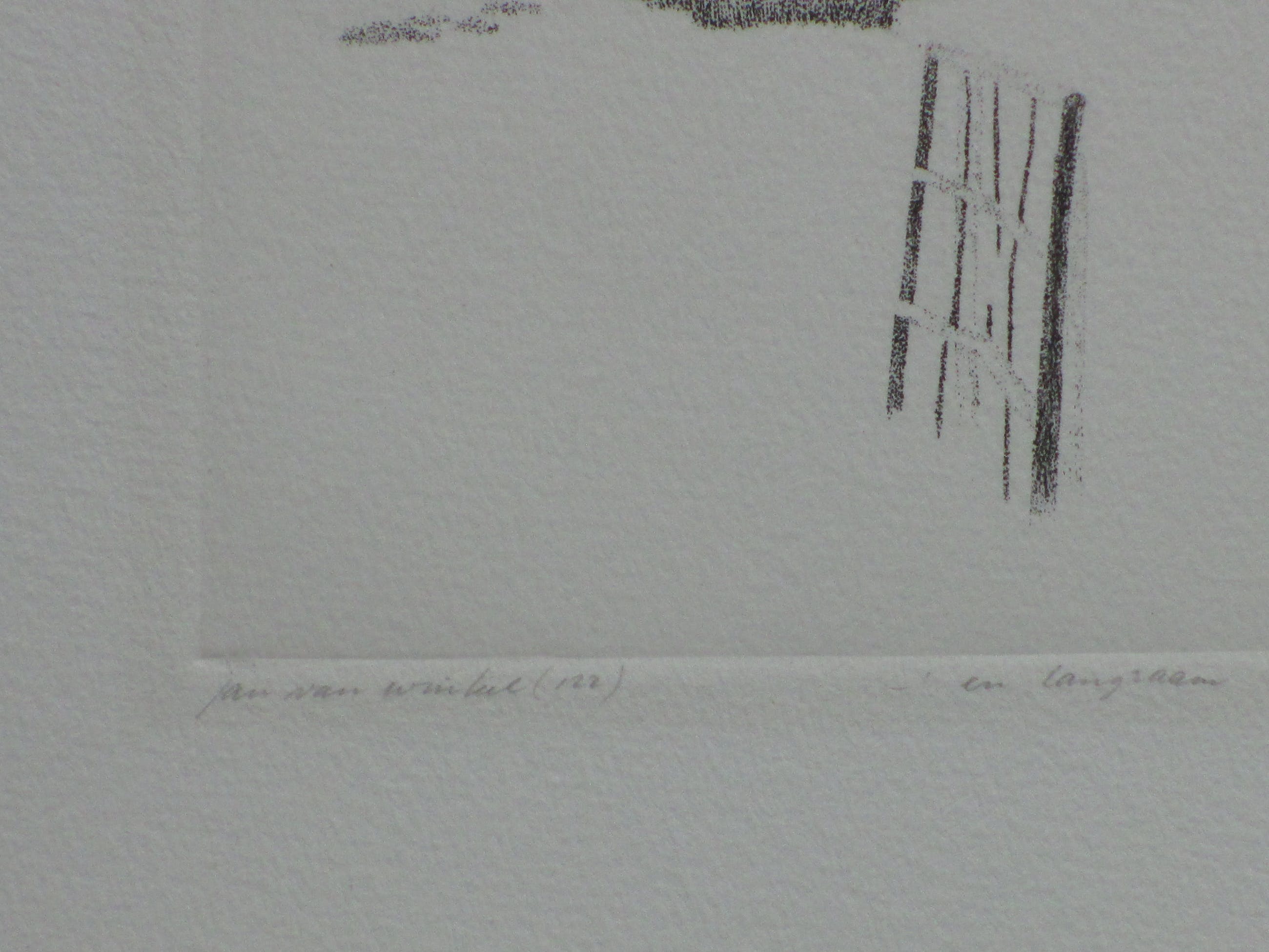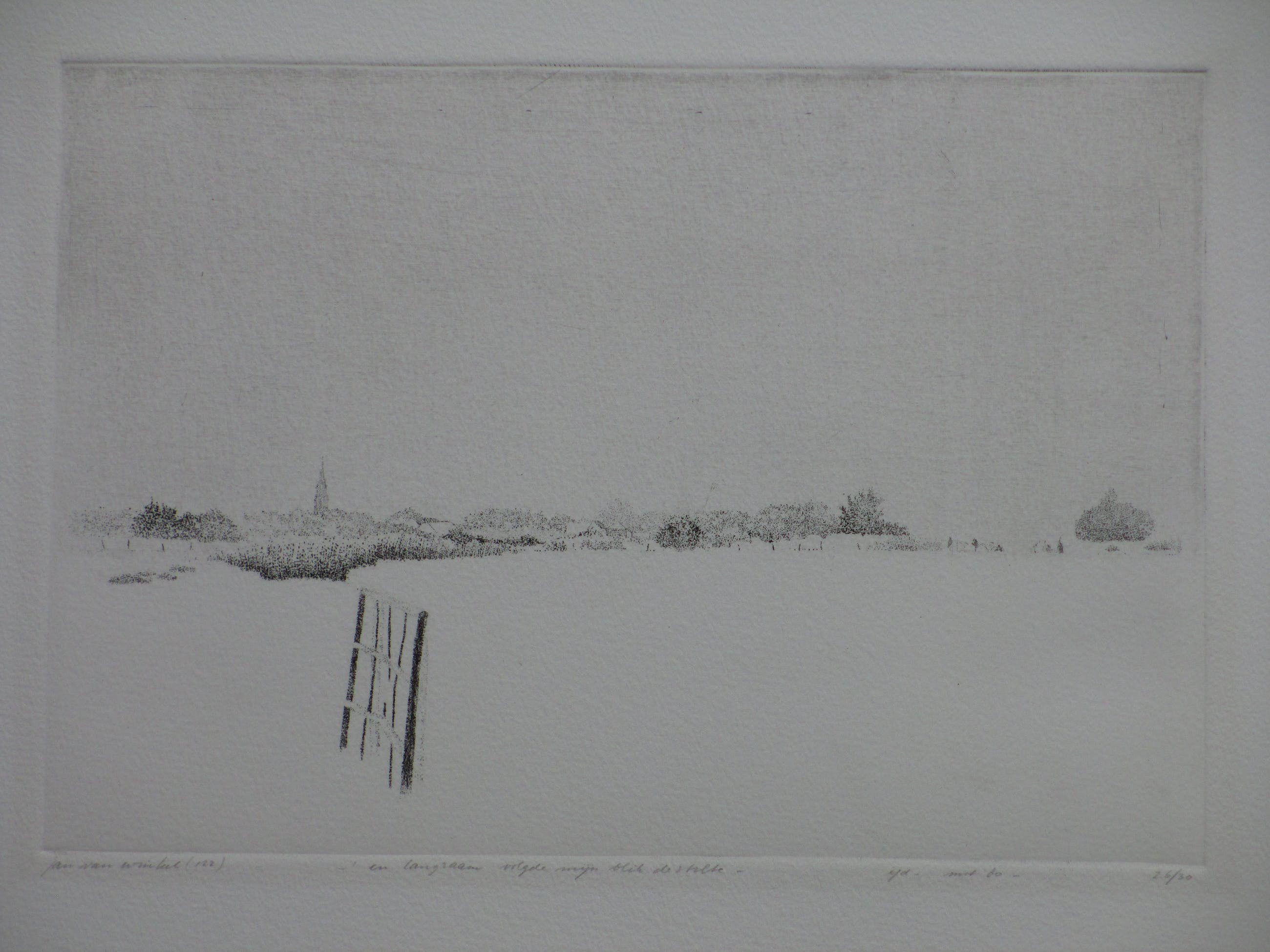 Ets door Jan van Winkel Voorstelling van een landschap met een kerk op de achtergrond en een hek op de voorgrond. Losbladig, beeldmaat 18x25, bladmaat 26x33 Gesigneerd in potlood l.o.: 'Jan van Winkel' Getiteld m.o.: 'En langzaam volgde mijn blik de stilte' Annotatie, datering en nummering r.o.: 'e/d mei 80. 26/30' Authenticiteit volledig gegarandeerd