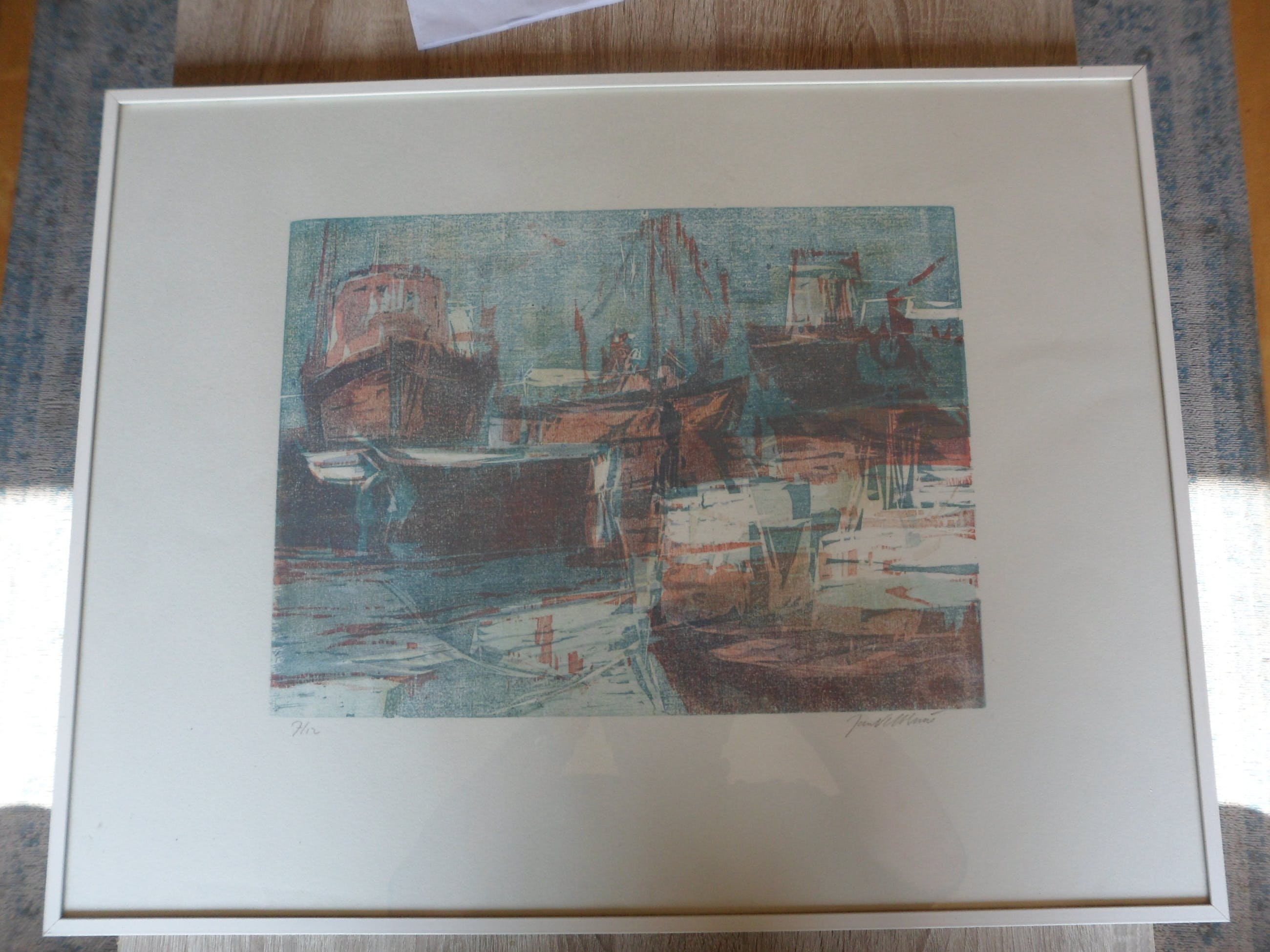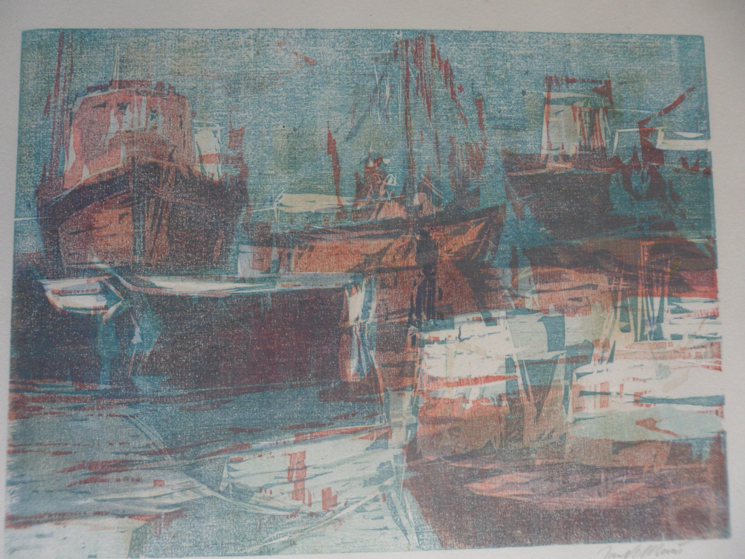Titel: Geen titel. Een werk uit de beginperiode van Jan Velthuis (1949), schilder en aquarellist van vooral water, wadden, havens en schepen.
