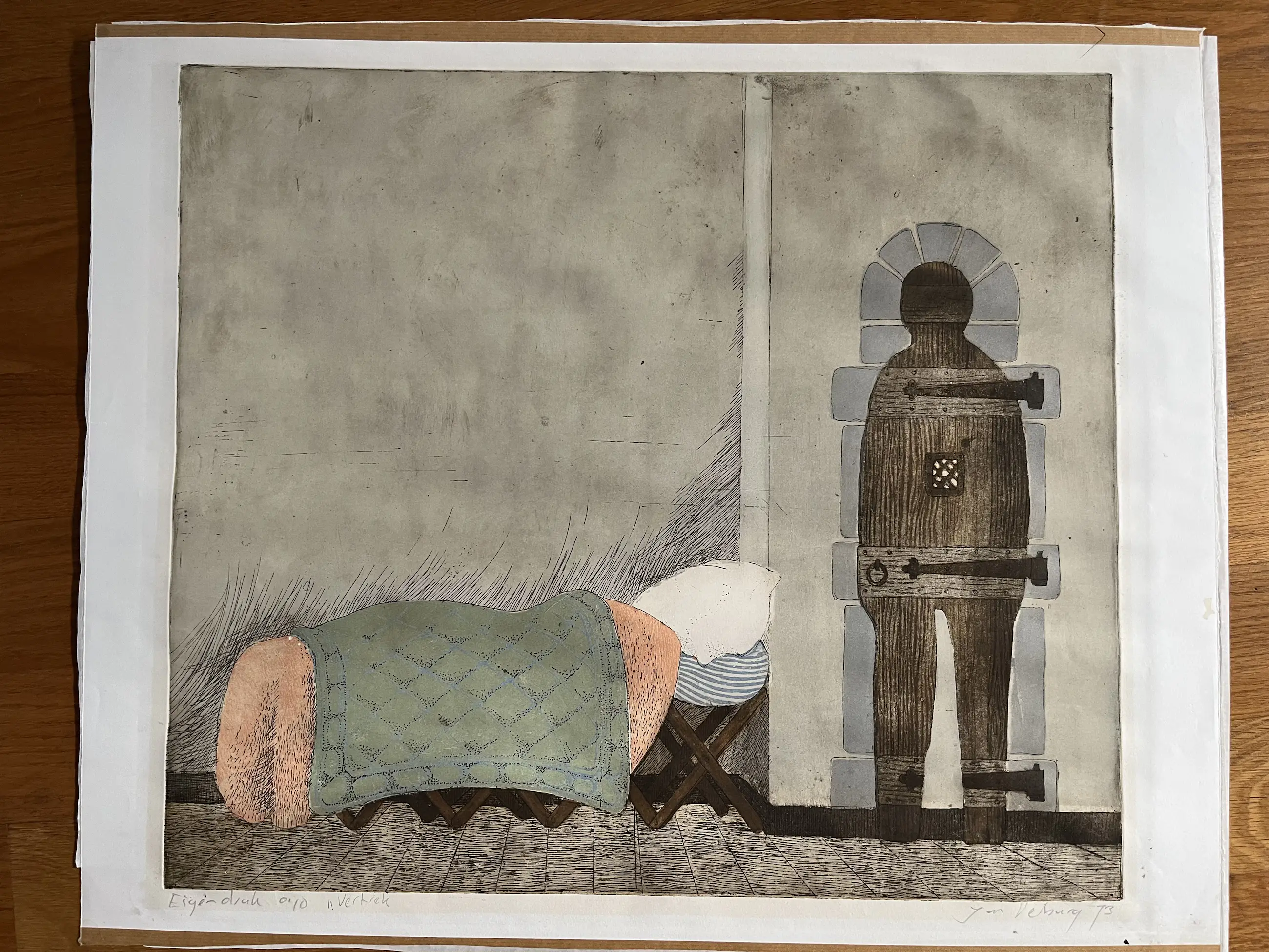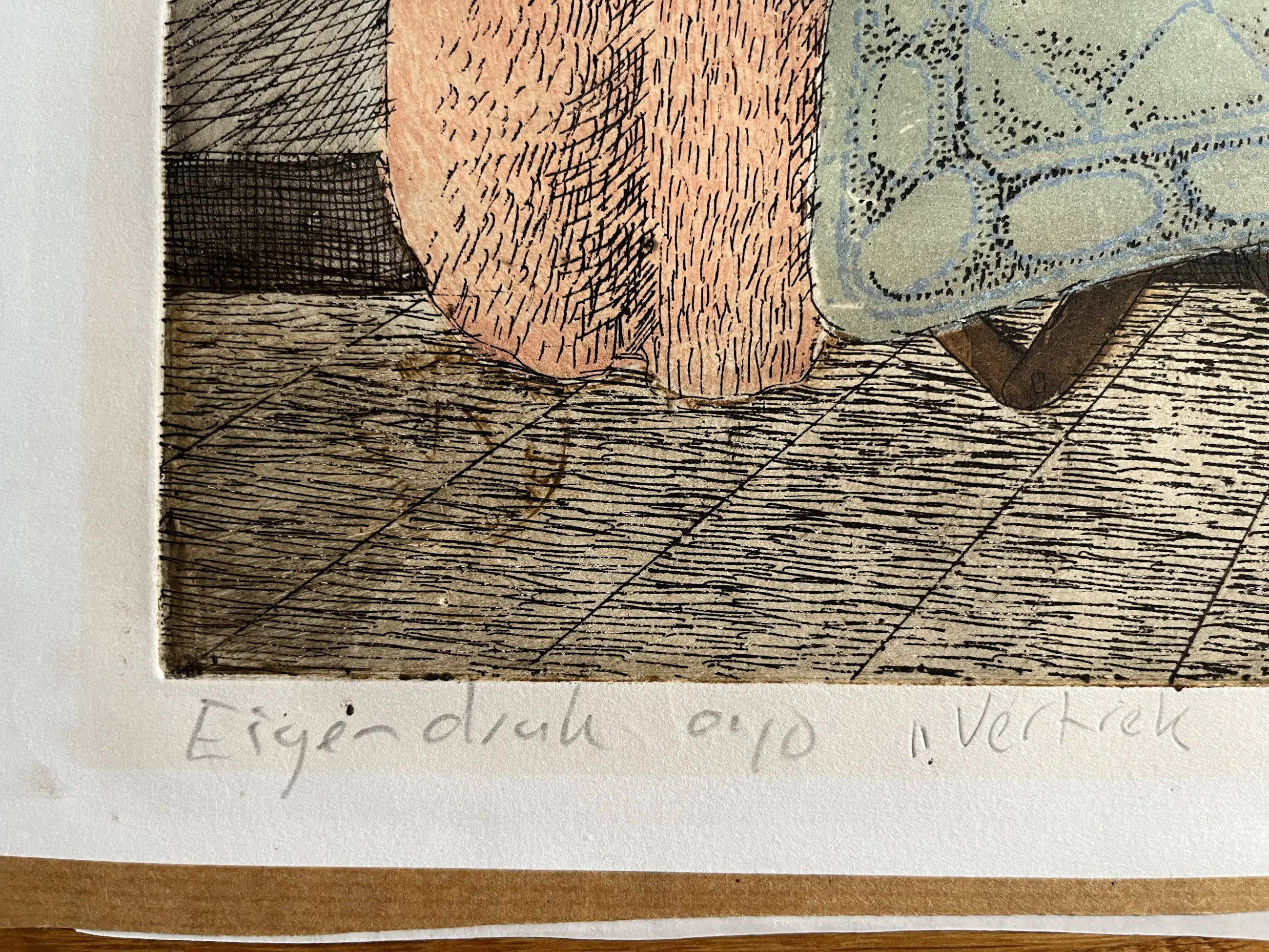 Fraaie kleurenets uit 1973. Eigen druk. Oplage is moeilijk te ontcijferen, ik meen het getal 10 te ontwaren. Het blad is gelijst geweest getuige de tape aan de zijkanten. Het blad is rondom de afbeelding ook enigszins verkleurd. Afmeting afbeelding 49 x 56 cm. Bladmaat 56 x 68 cm.