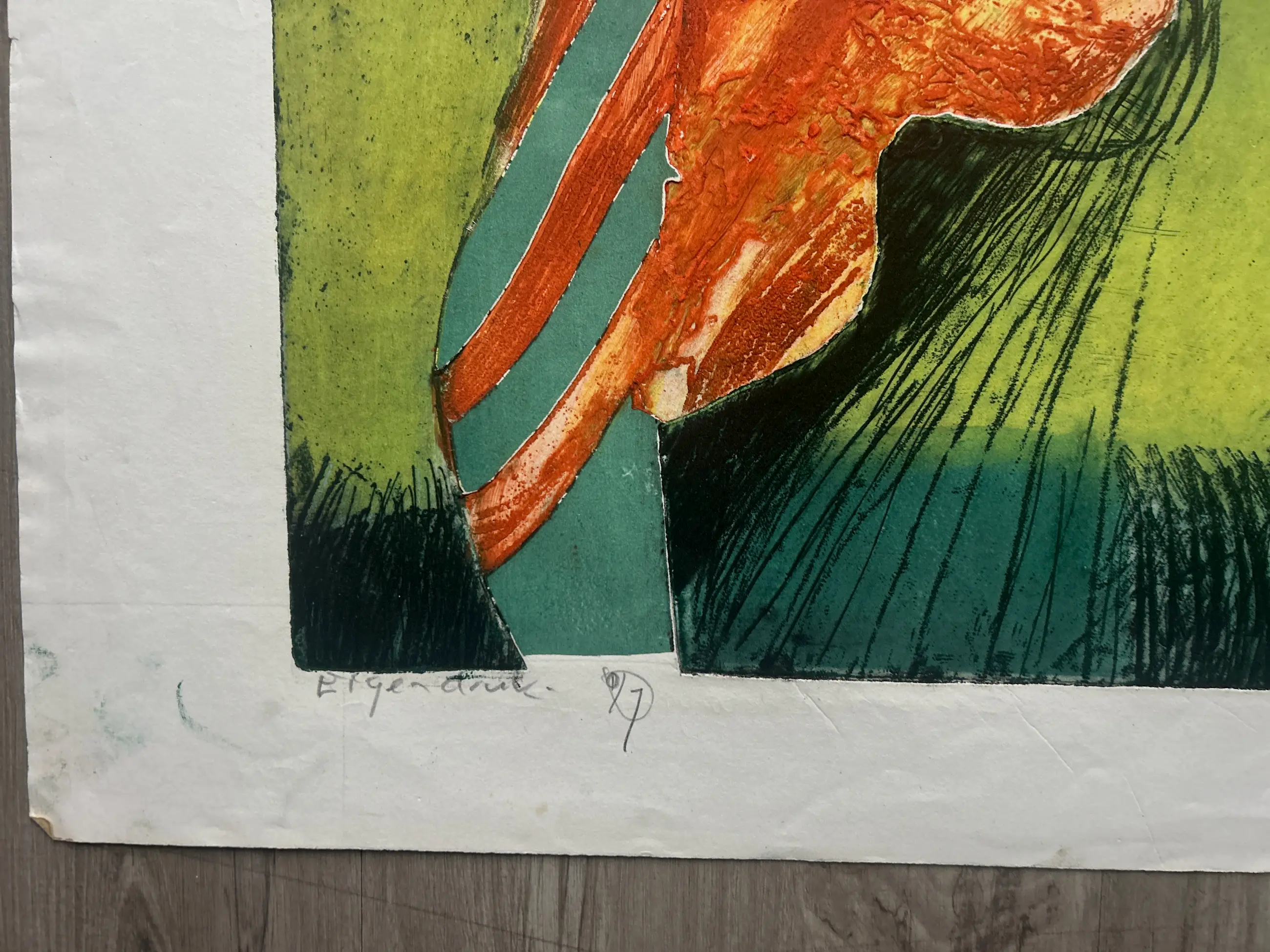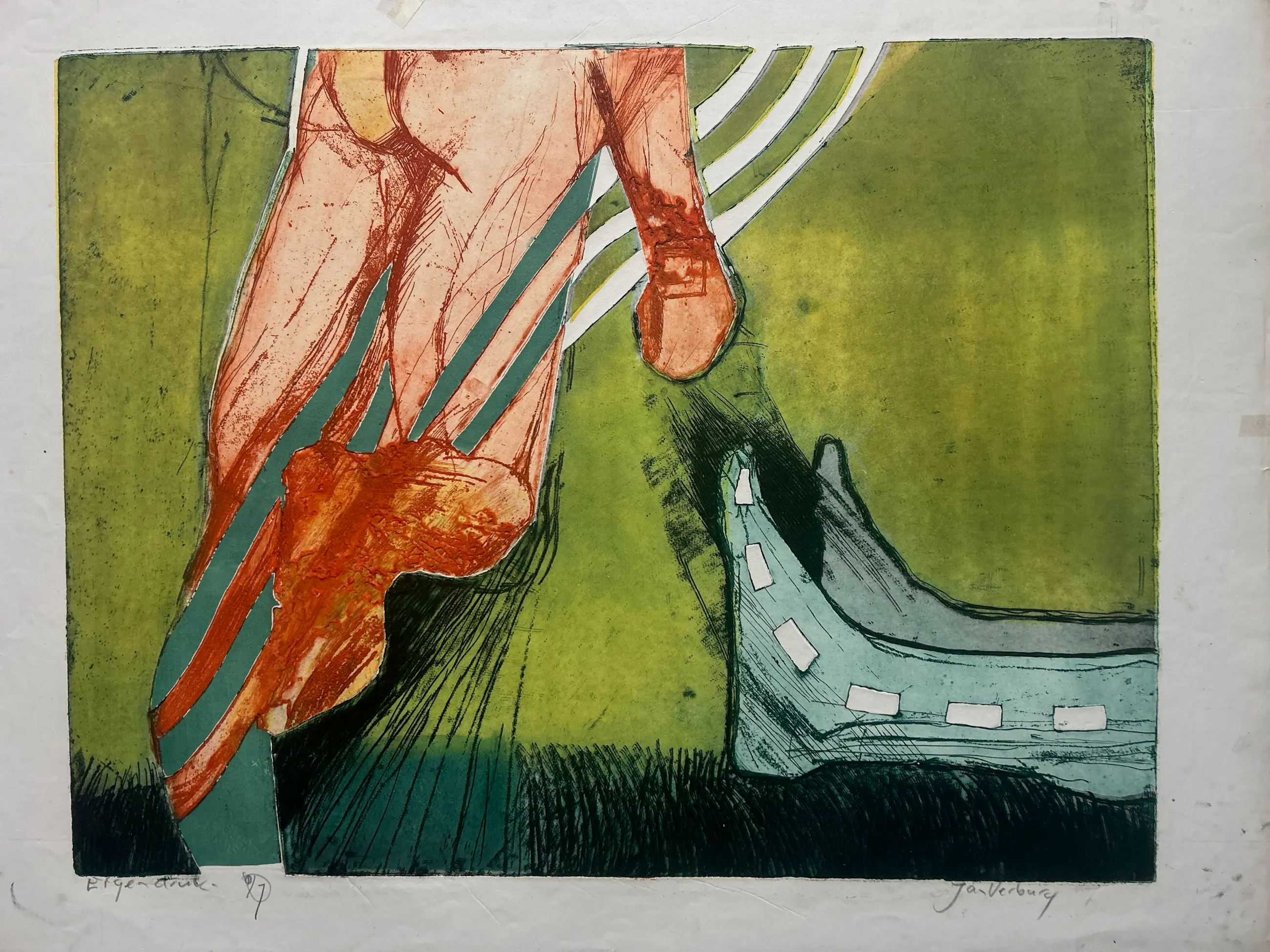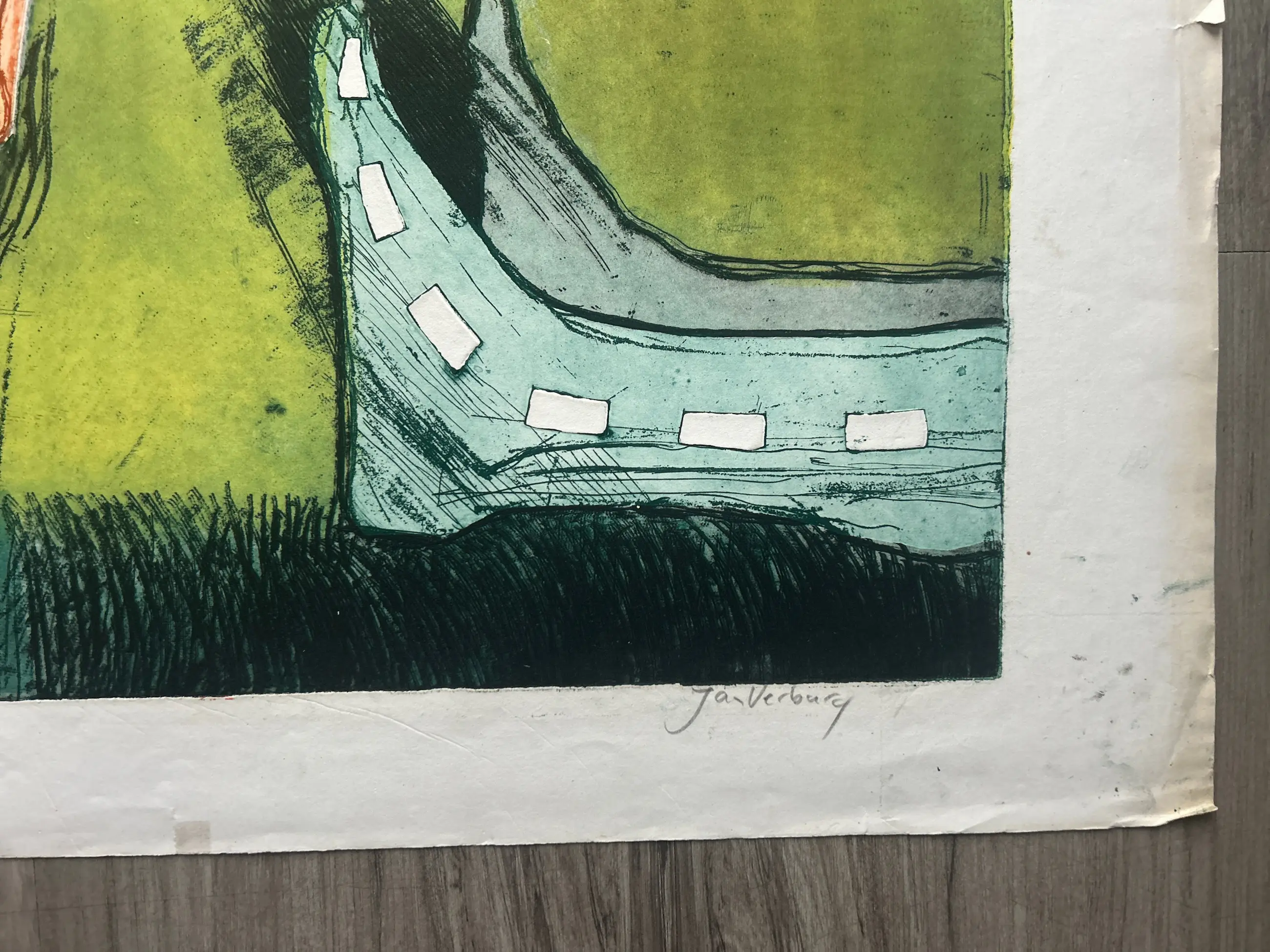Conditie: goed, Vel heeft vlekjes en plakband van inlijsten , zie foto's. Afmeting: ets 46 x 60 cm. Wordt zorgvuldig verpakt en verzekerd verzonden.