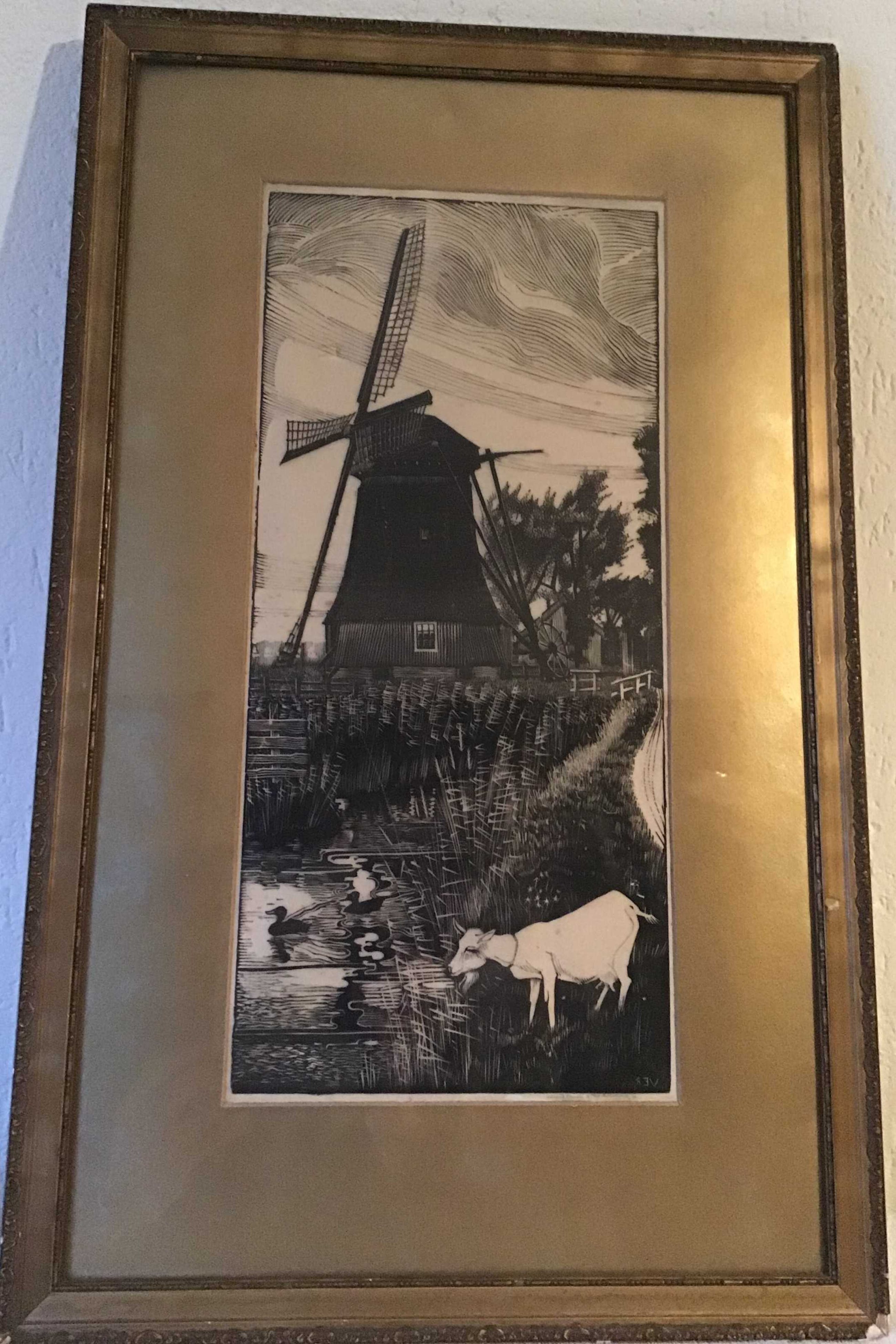 Jan Veringa 1907-1982Houtsnede, Molen met geitje aan de waterkant21x45Gesigneerd rechtsonderKlein deukje in het papier linksboven, zie foto