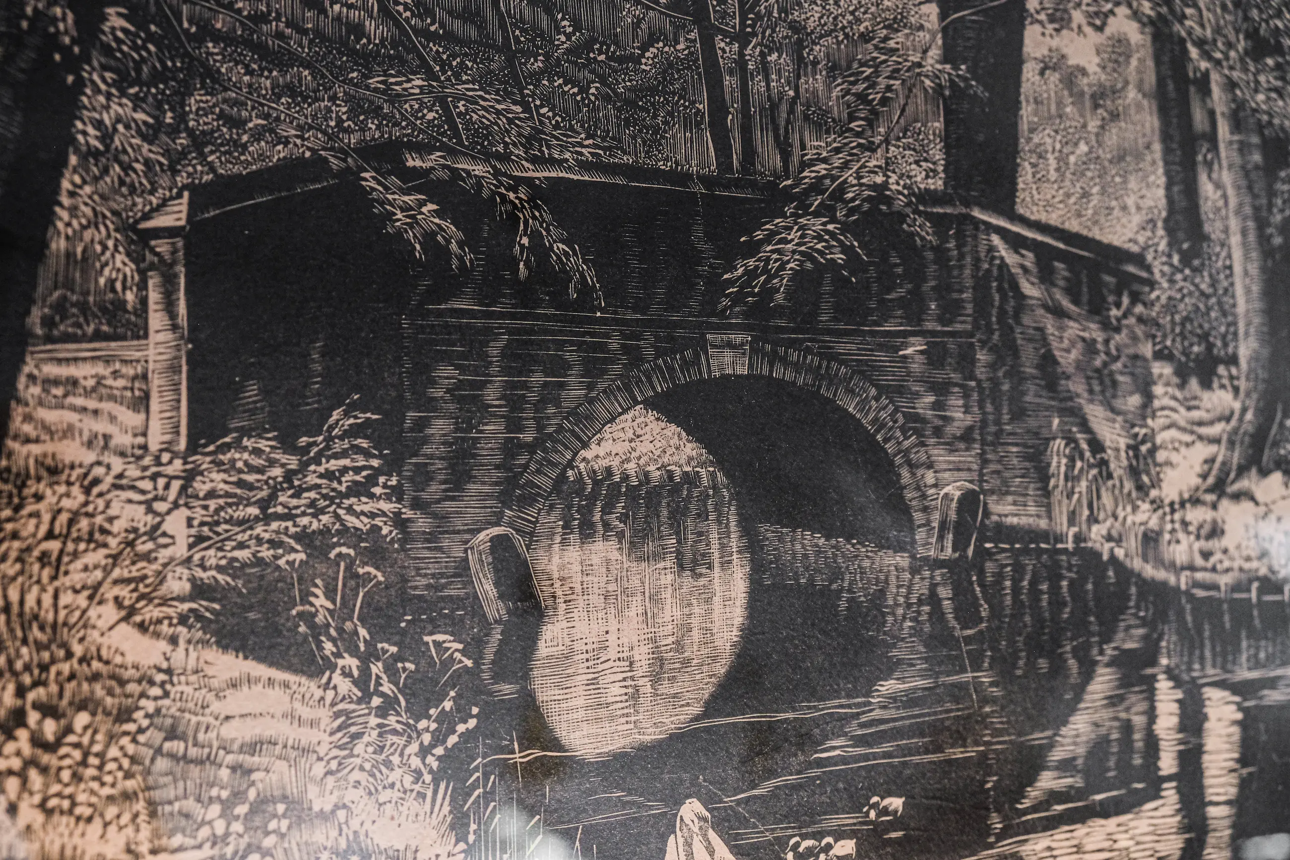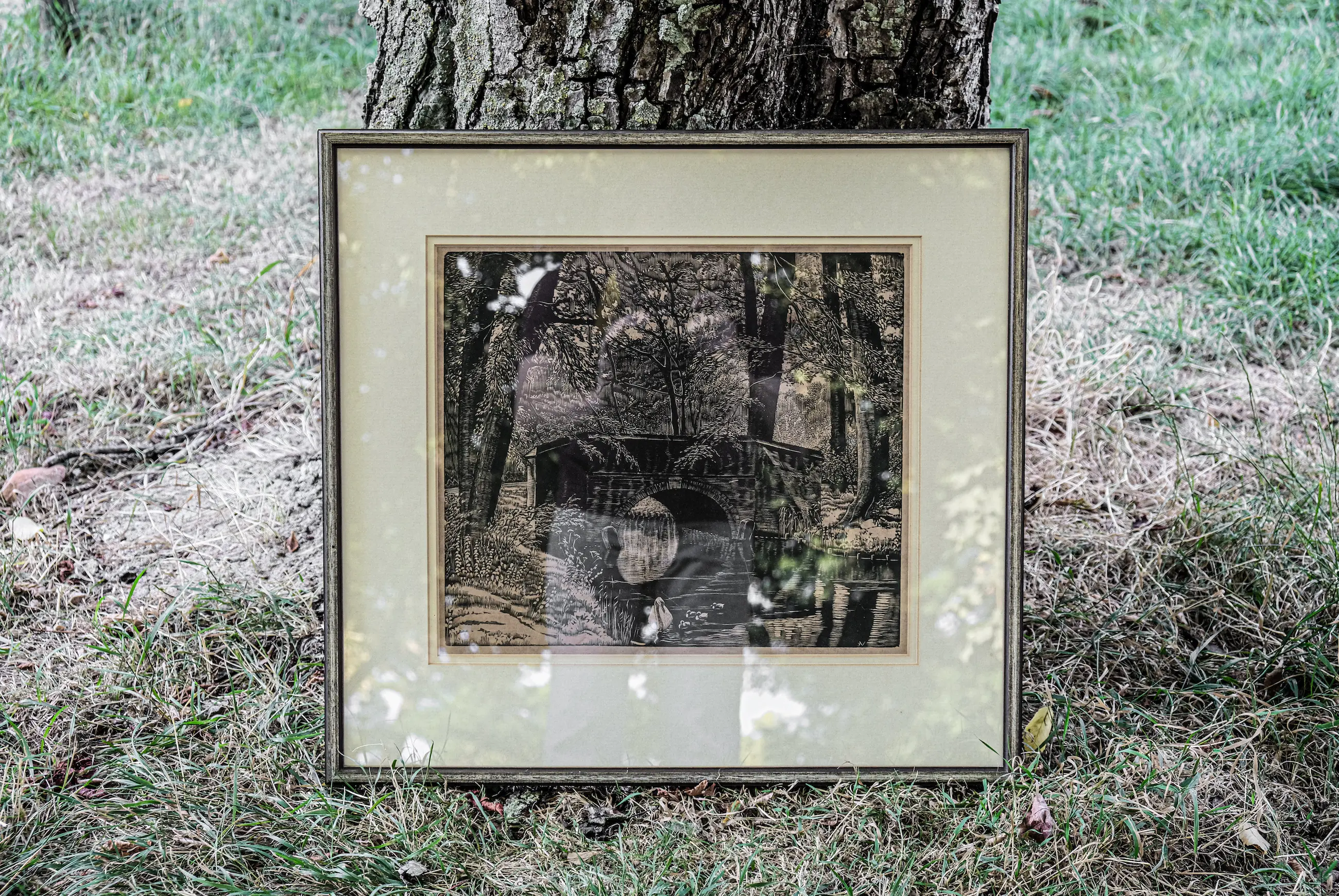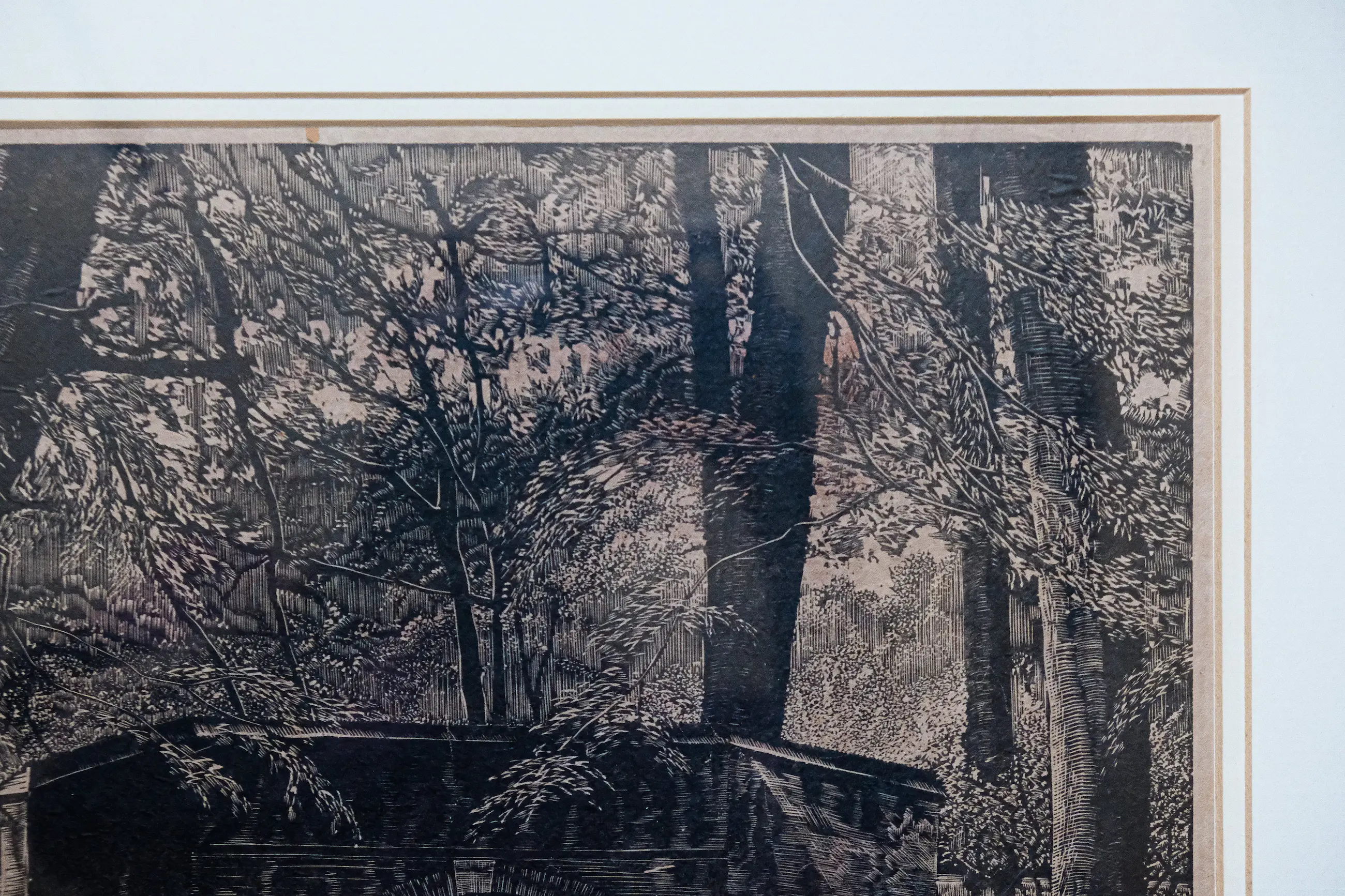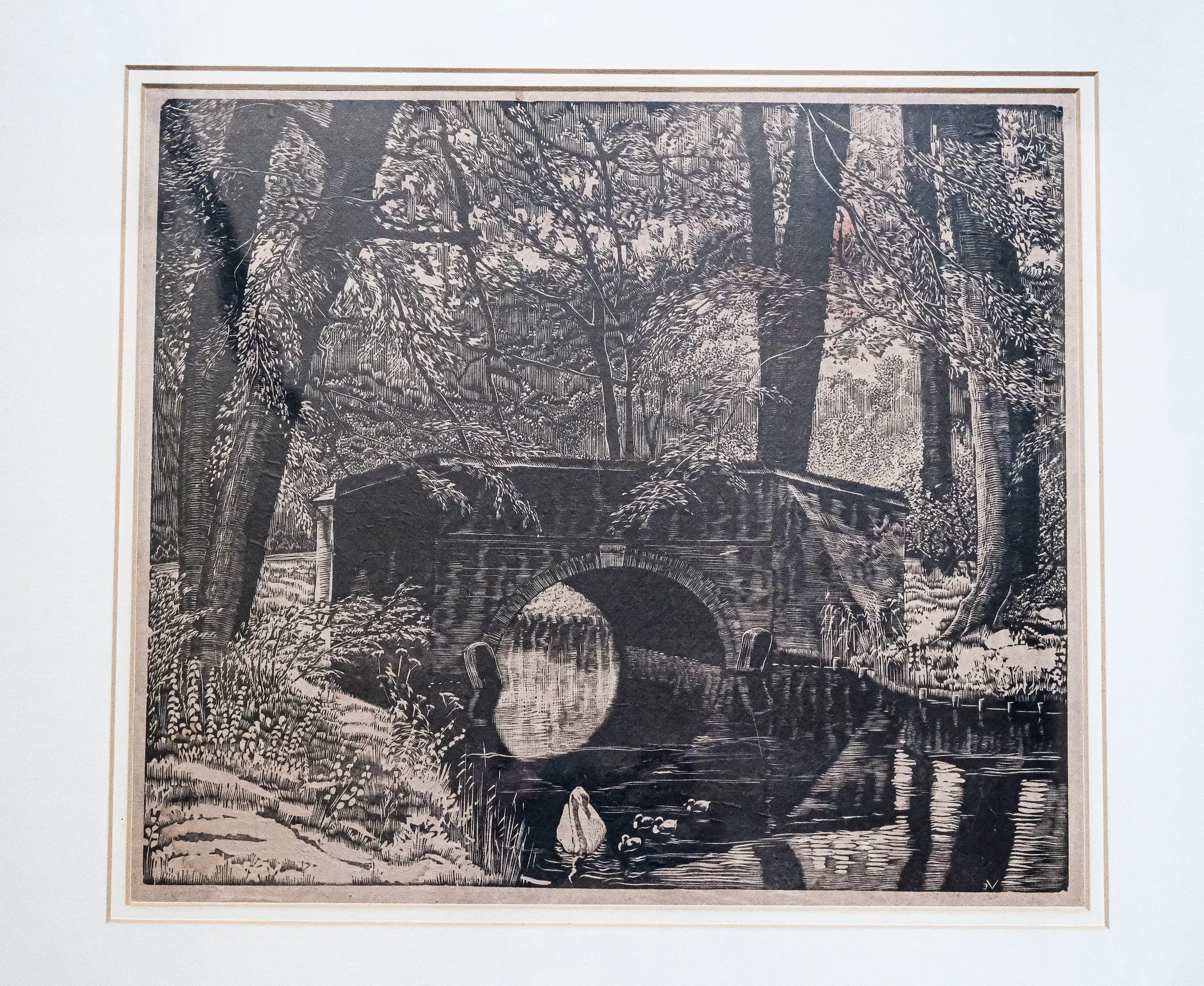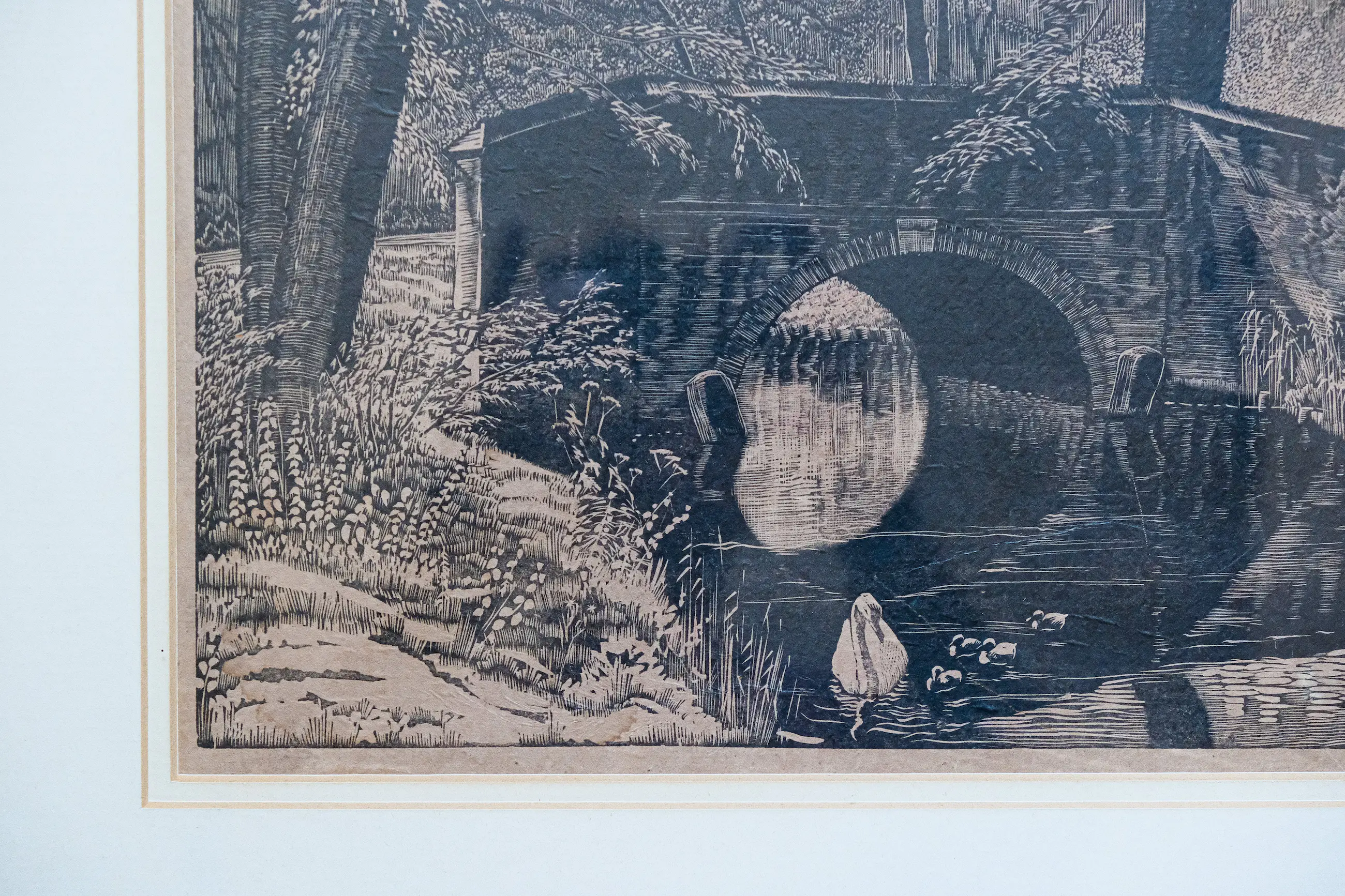 Mooie houtsnede op papier, in een grote lijst achter glas. Zowel de houtsnede, het glas, als de lijst zijn in gebruikte, maar zeker goede conditie. De achterzijde van de lijst is mooi professioneel afgewerkt en voorzien van een ophangsysteem. Zie laatste foto voor een goed overzicht van het geheel.