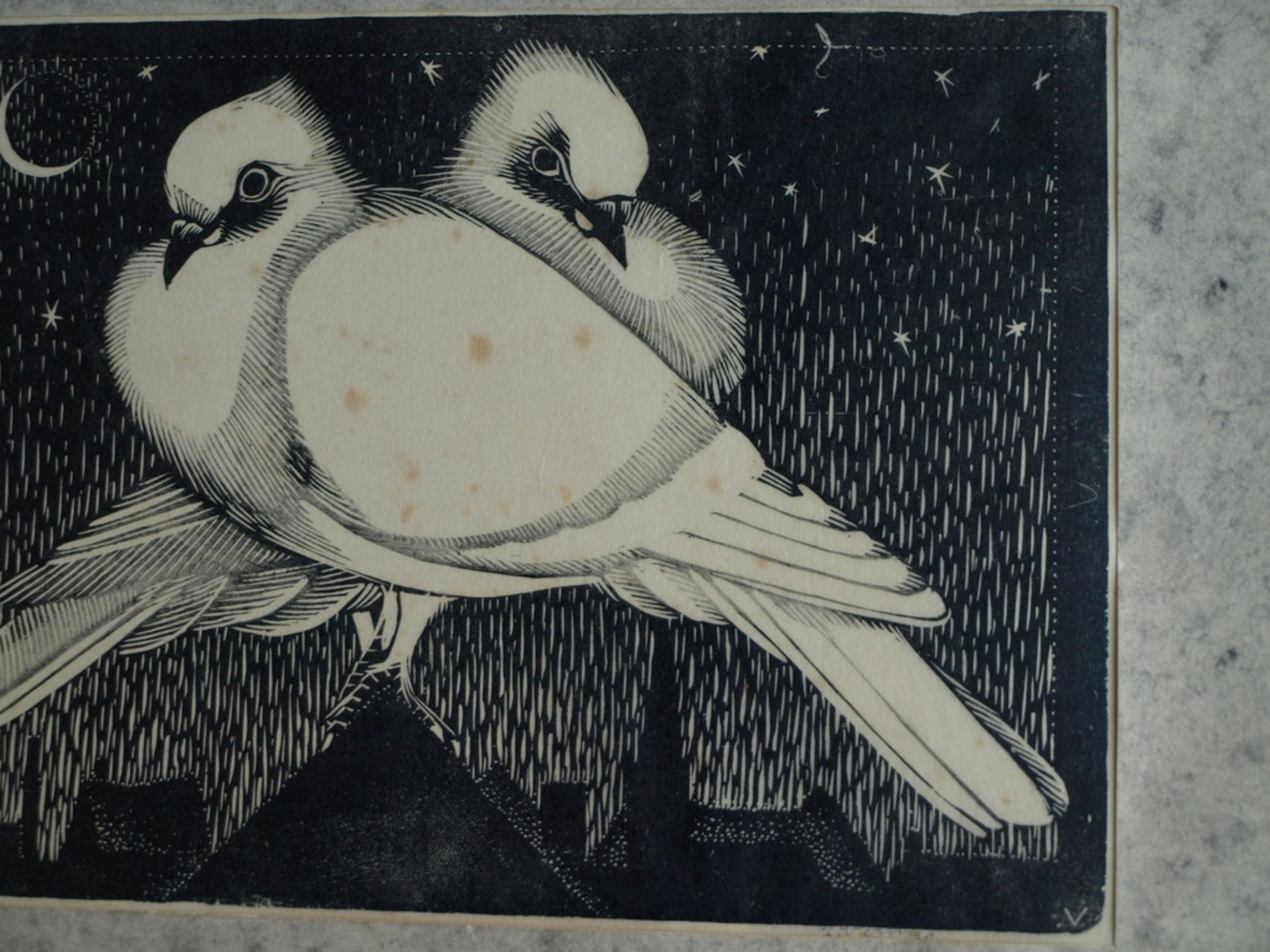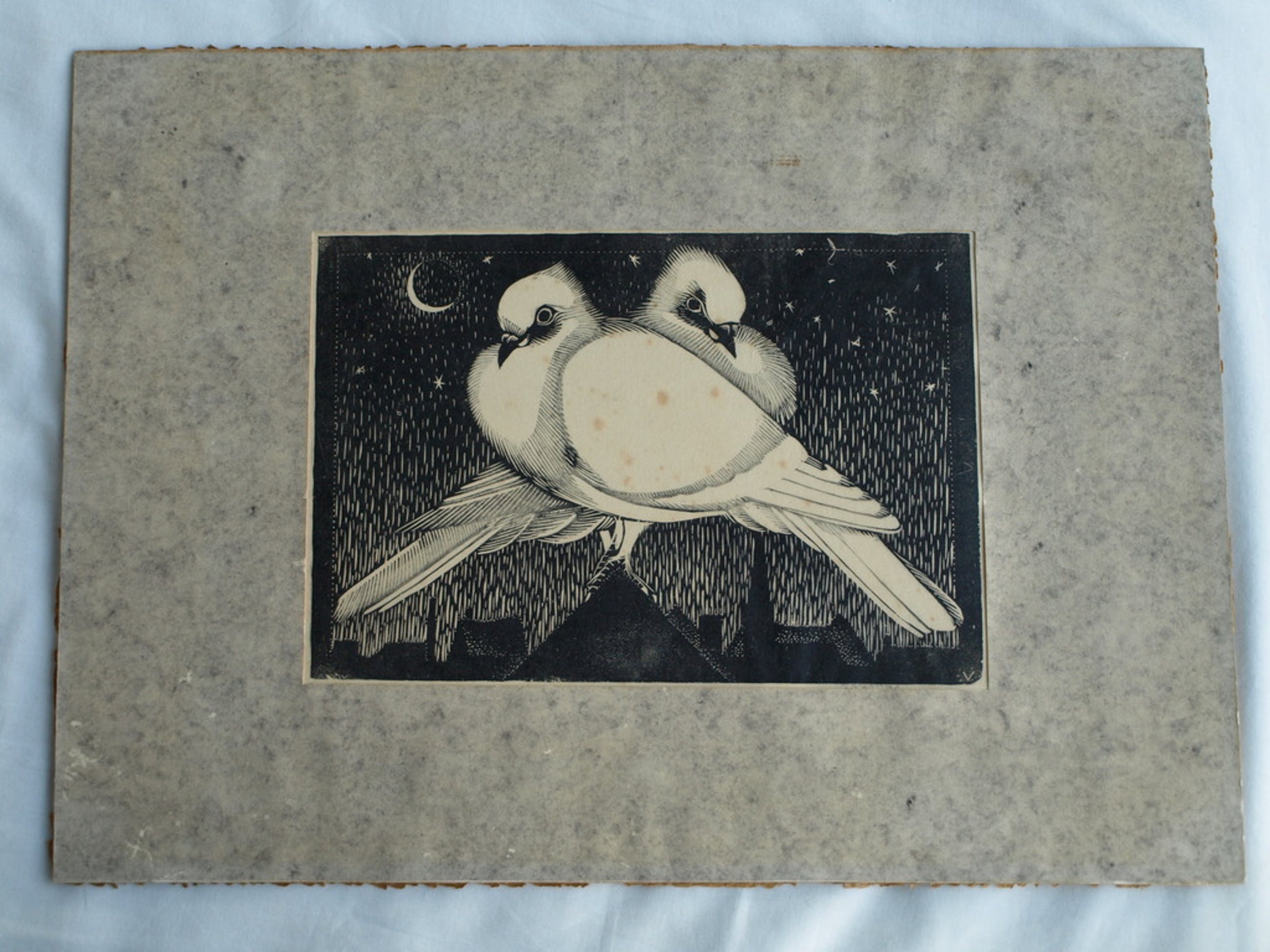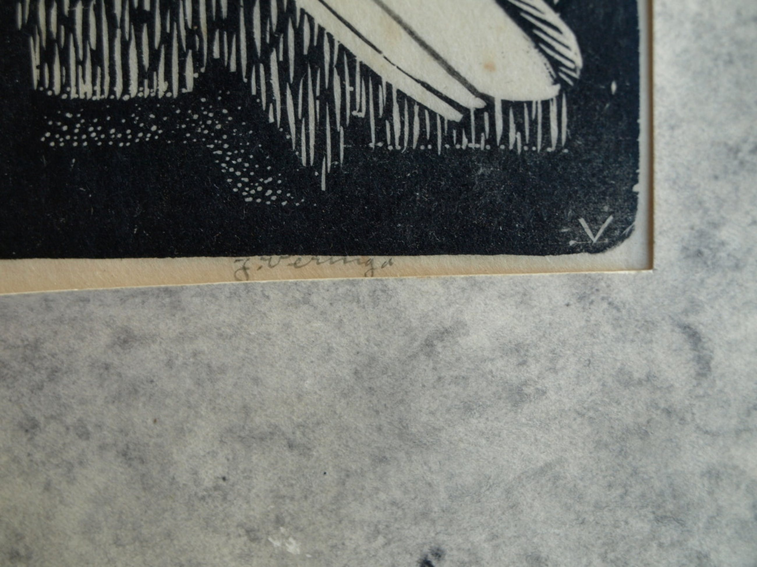 Conditie: Het papier van de houtsnede heeft ‘zuurvlekjes’ en het passe-partout heeft slijtplekjes.