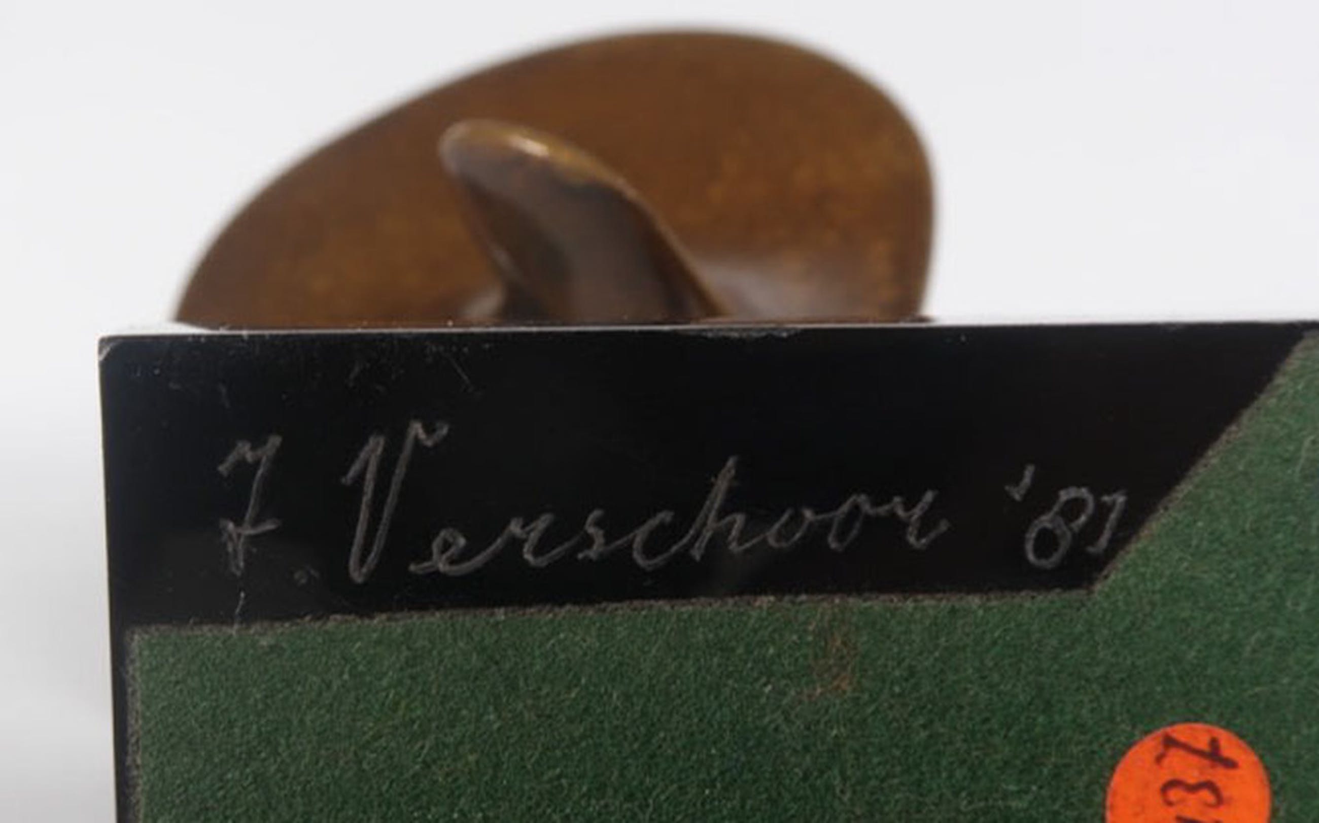 Gesigneerd: Ja, handgegraveerd onderop sokkel
