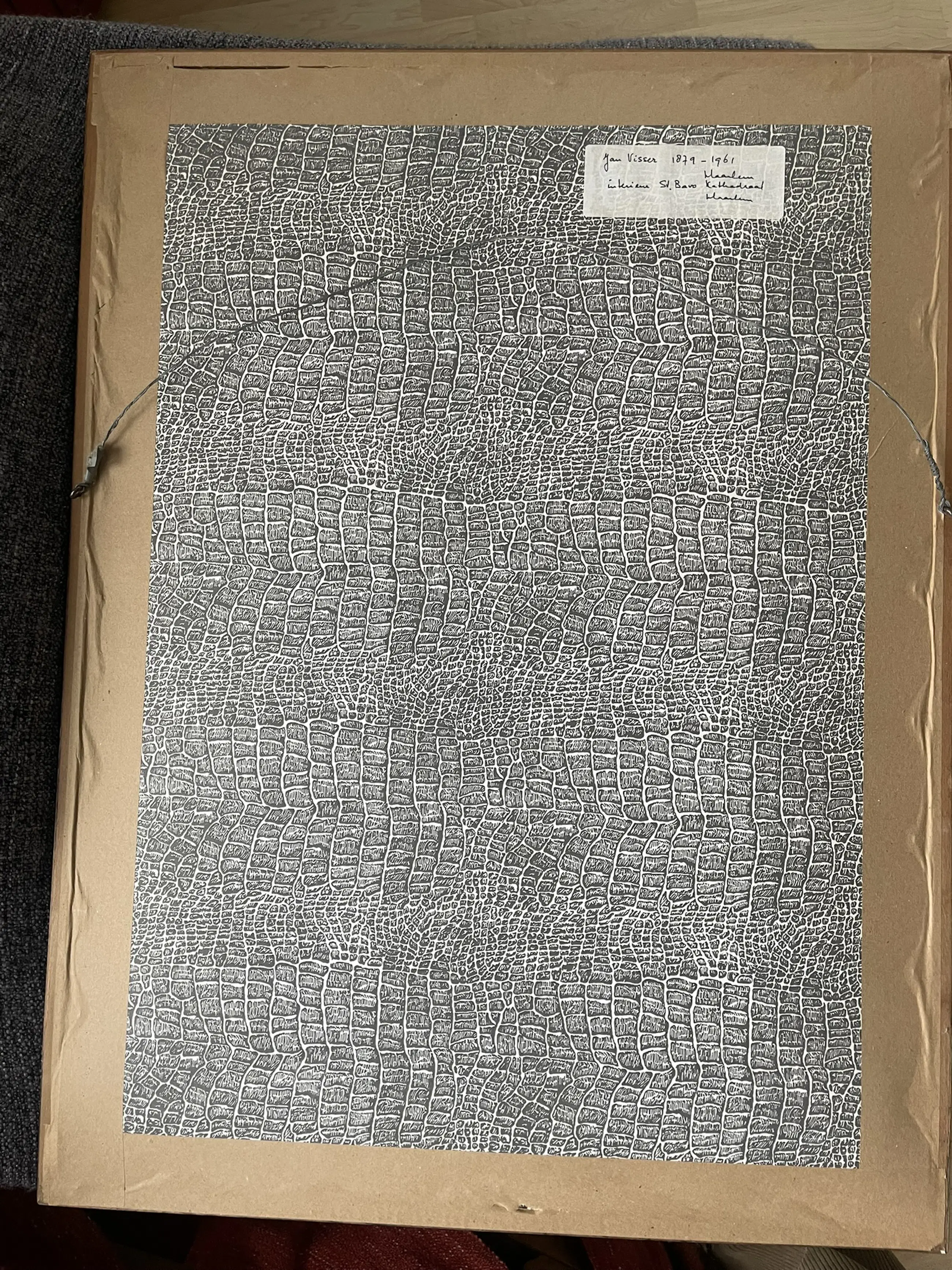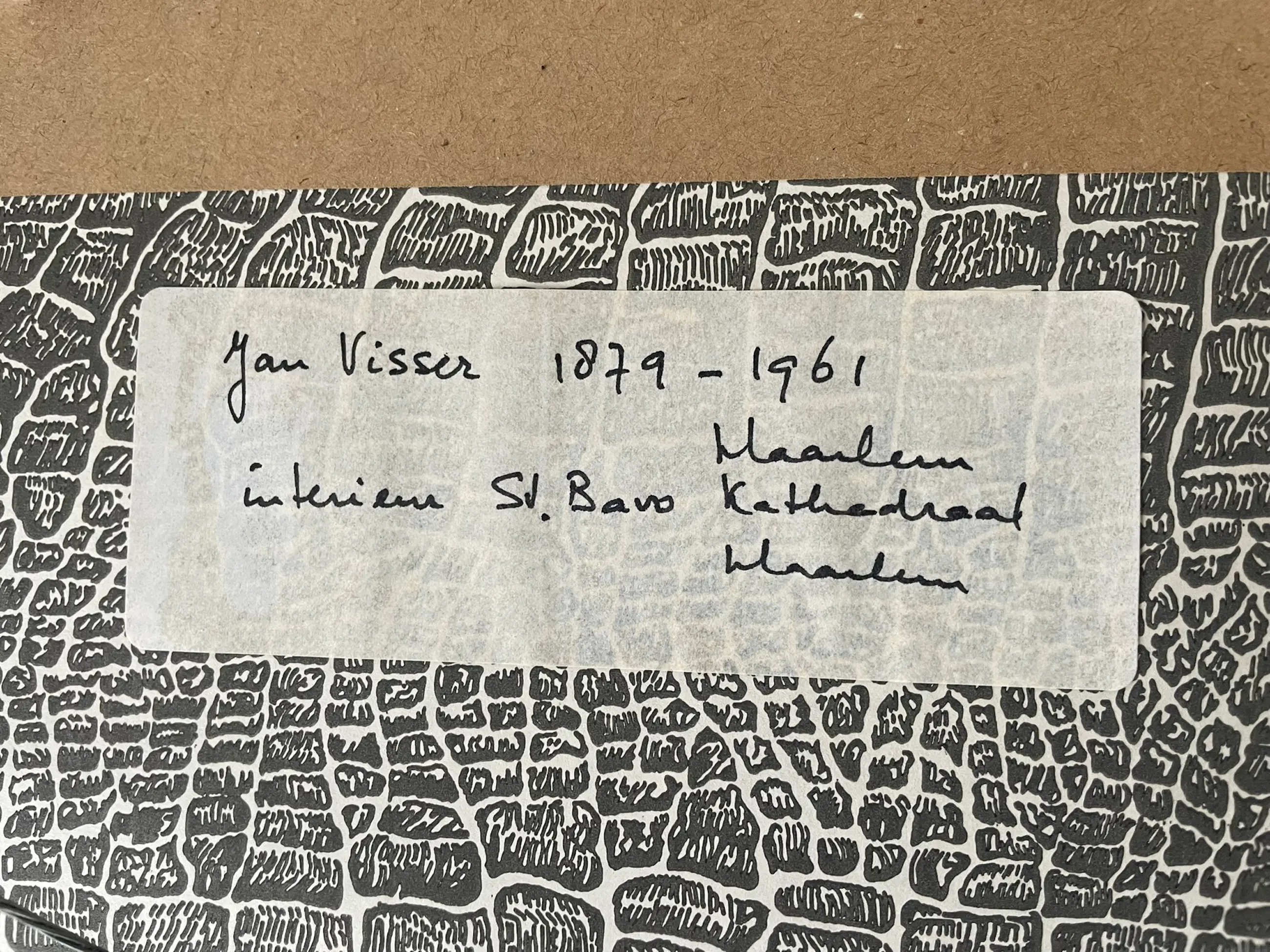 Litho van interieur van de St. Bavo kerk in Haarlem door Jan Visser (1879-1961). Gesigneerd met "Jan Visser van Haarlem '30". Met onderschrift "St. Bavo. Haarlem." (rechtsonder) en "Opgedragen aan Prof. Dr. A. H. de Hartog." (linksonder).