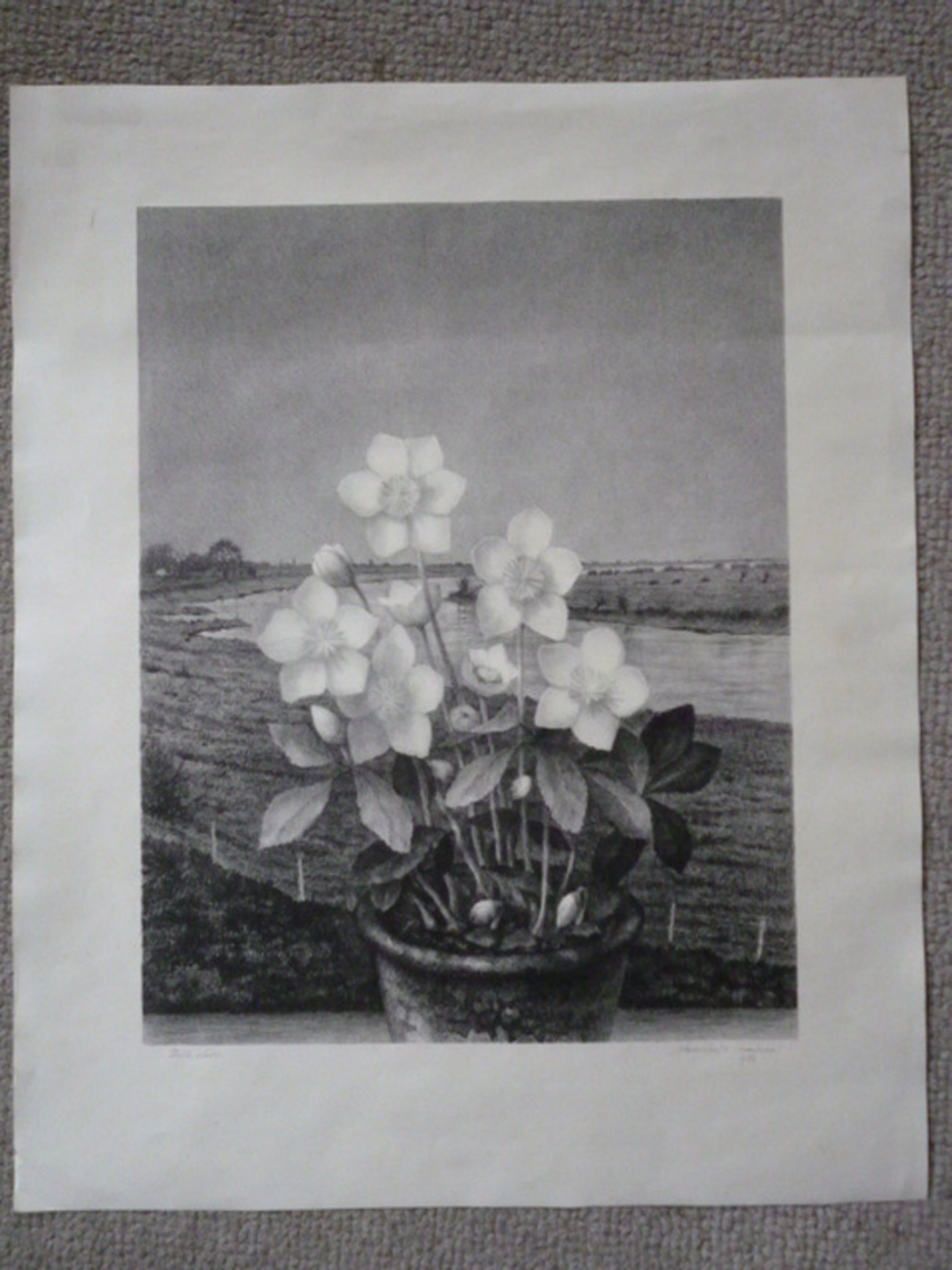 Litho uit 1944 voorstellende een bloeiende plant met een rivierlandschap op de achtergrond.