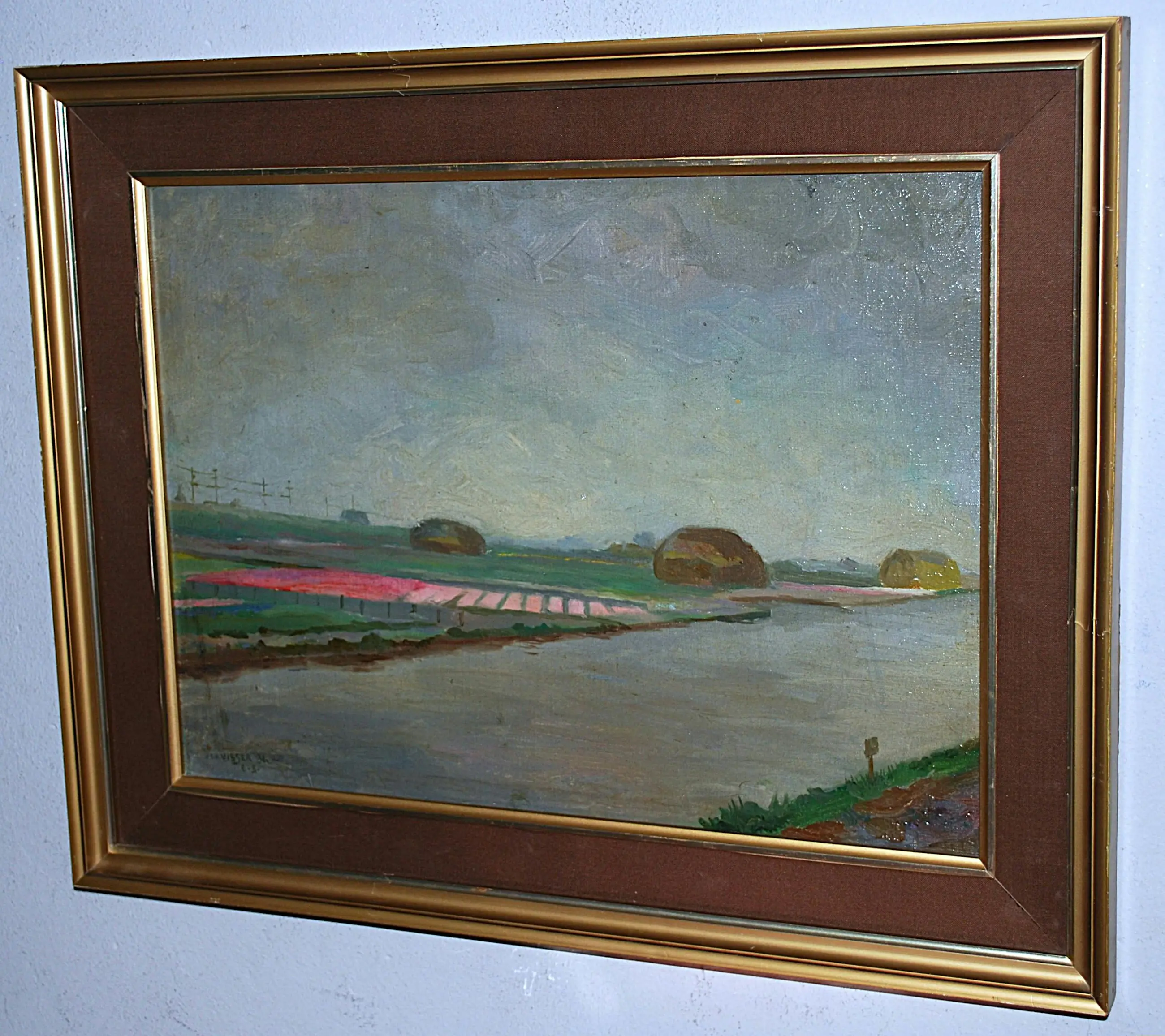 Dit betreft waarschijnlijk de Ringvaart/Bollenstreek. Olieverf op linnen, bevestigd op board. Gesigneerd en gedateerd l.o. met een toevoeging (ik lees B-B). In een fraaie kwaliteit lijst met bruin linnen inleg.