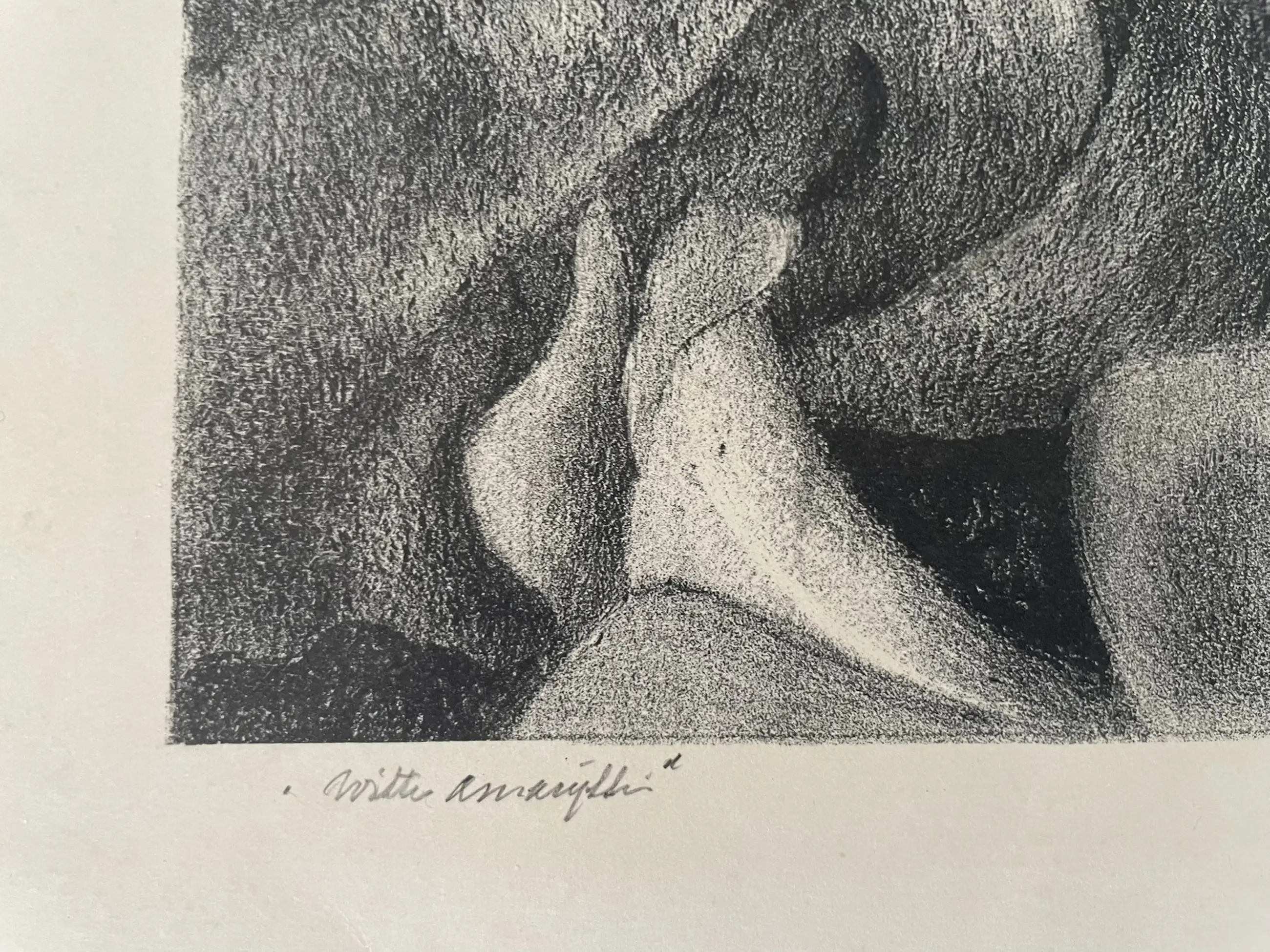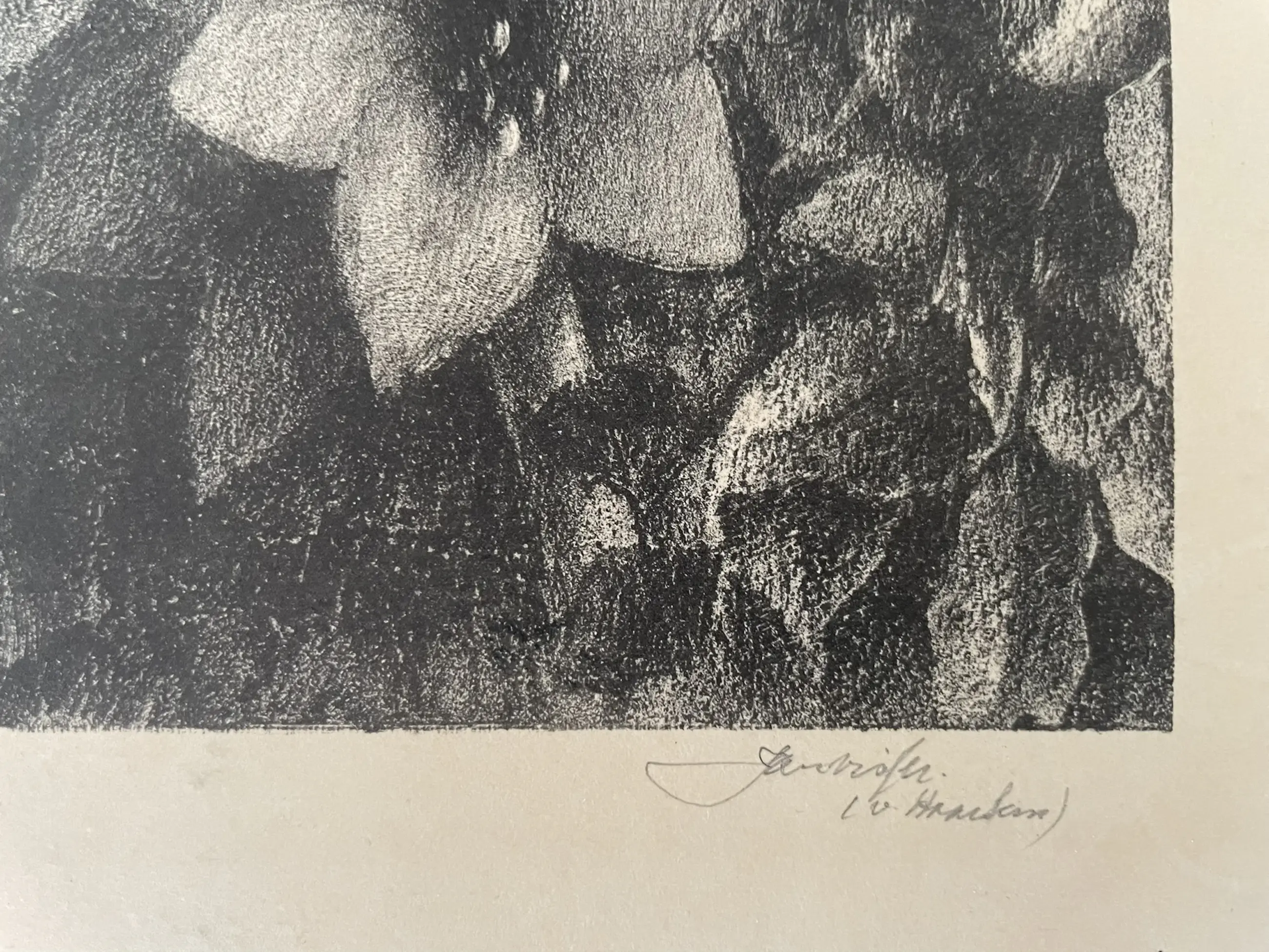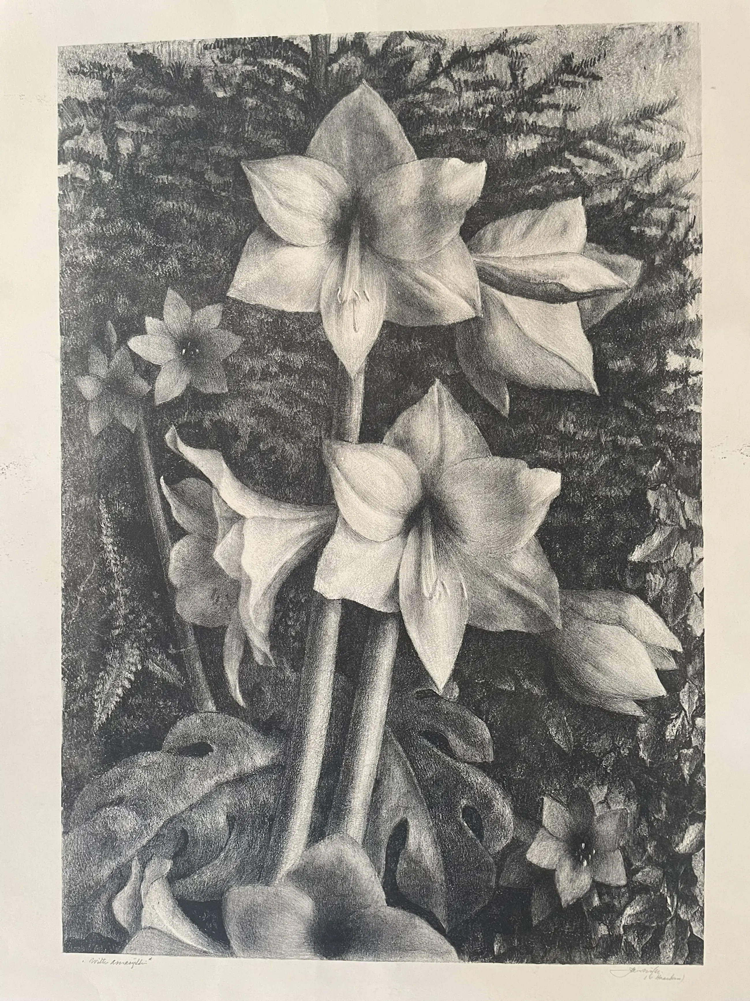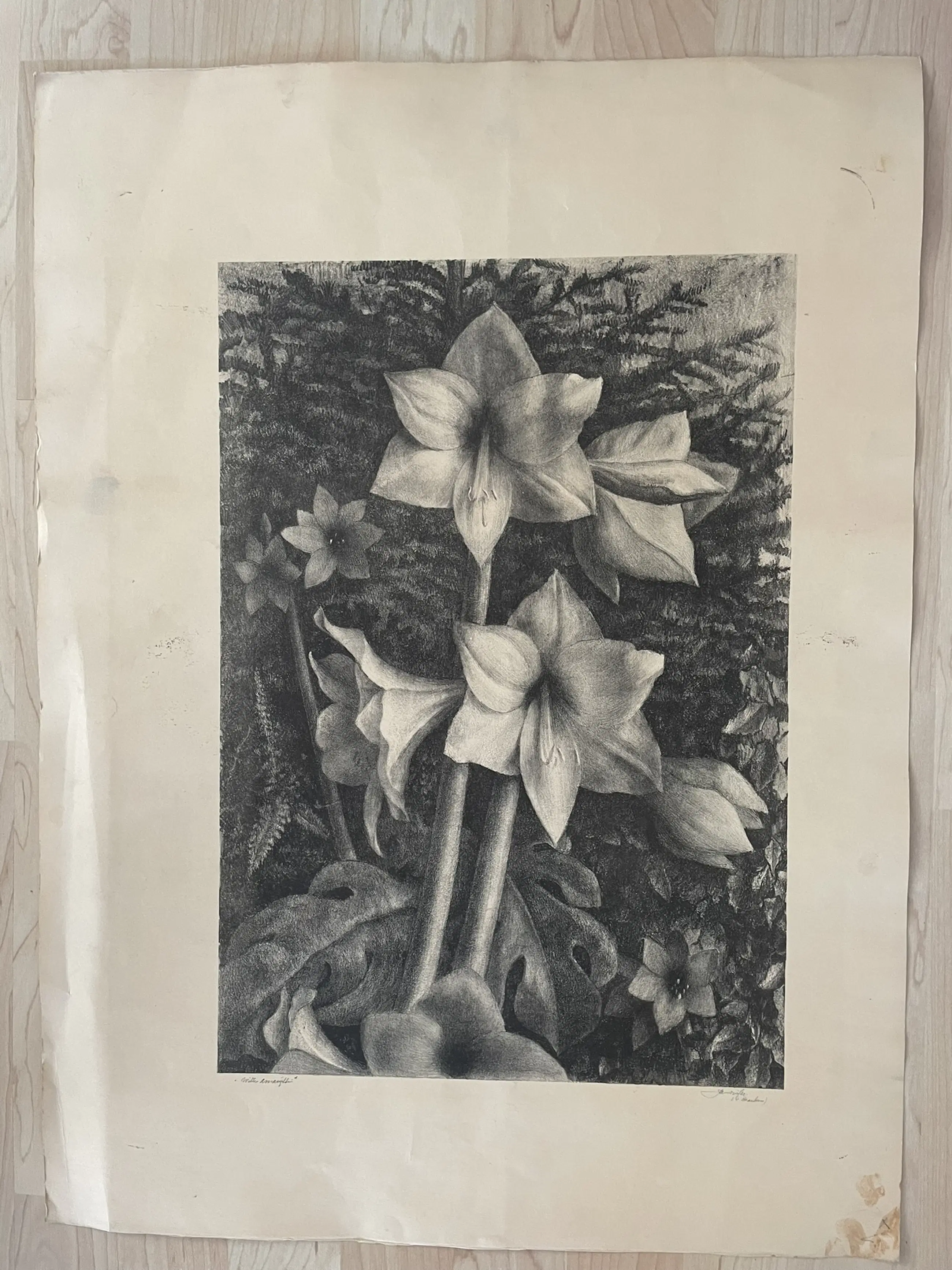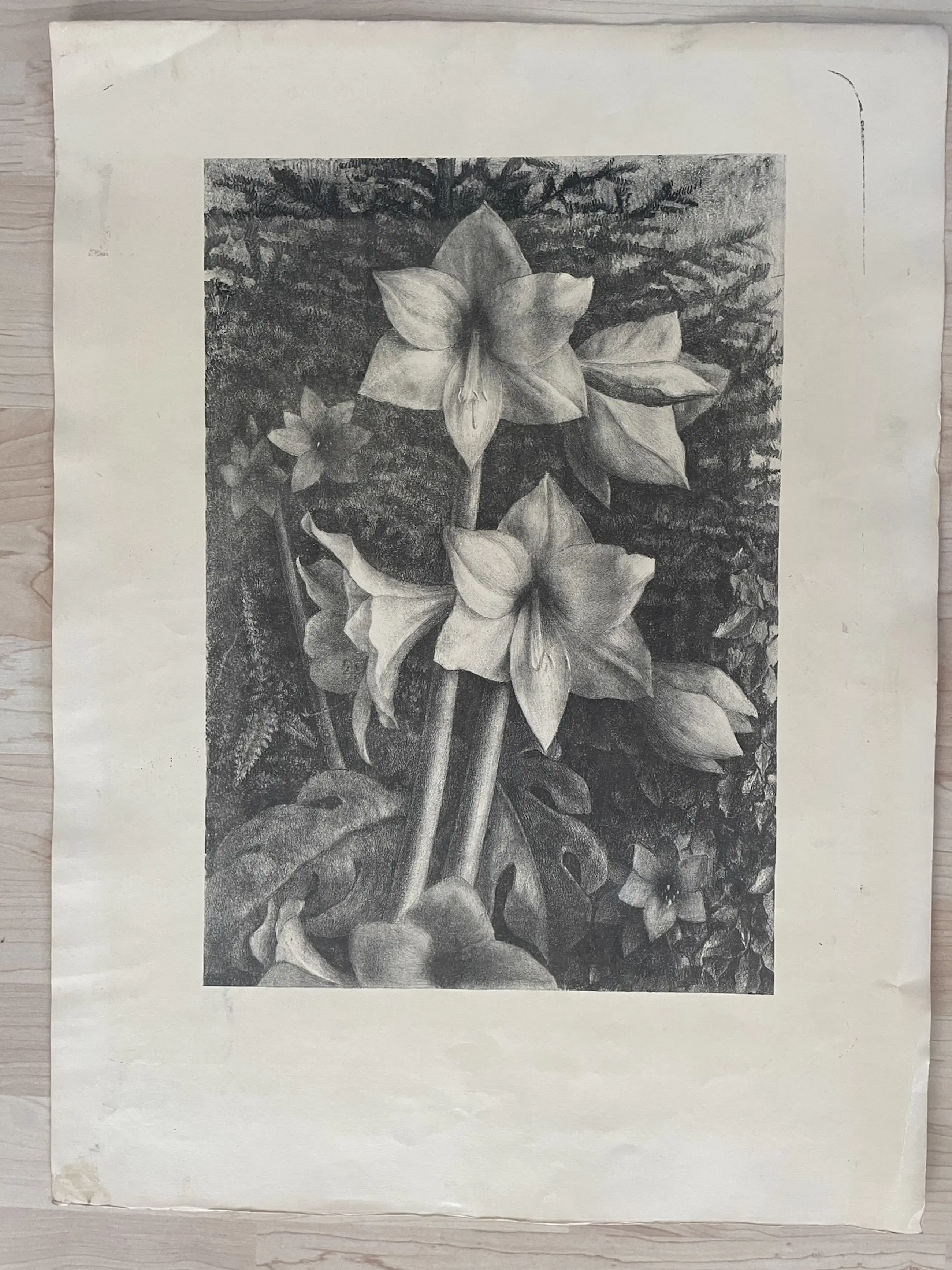 Litho door Jan Visser (1879-1961), werkzaam te Haarlem vanaf 1927. Mij is niet bekend of dit werk voor of na 1944 is gemaakt. Ik heb het van mijn vader (destijds eveneens woonachtig in Haarlem) geërfd die het daar waarschijnlijk zelf van Jan Visser heeft gekocht. Ik ben dus tweede eigenaar. Authenticiteit is gegarandeerd. Dit werk is rechtsonder in potlood gesigneerd: "Jan Visser (v. Haarlem)" en eveneens in potlood staat linksonder de titel: "Witte amaryllis". Bijzonder is dat deze litho aan beide zijden van het blad is afgedrukt. De extra afdruk is niet gesigneerd. De bladmaat is 64 x 48 cm. Op het papier zijn enkele vlekjes en verkleuringen aanwezig. De afdrukken zijn echter in zeer goede staat.