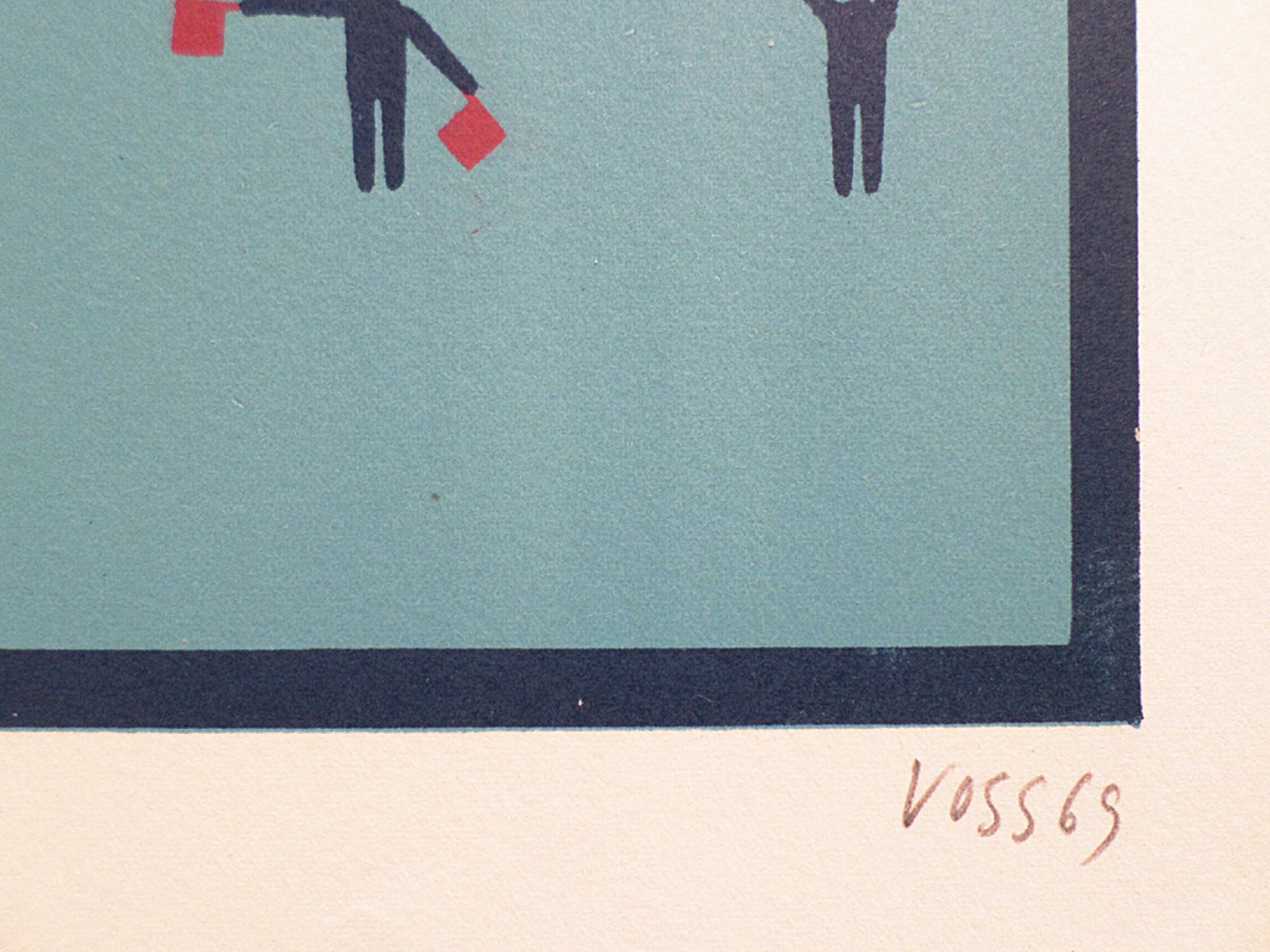 Leuke litho van Jan Voss uit 1969, uitgegeven door Prent 190. Handgesigneerd, gedateerd en genummerd. Dit is nummer 189 uit een oplage van 190 stuks. In goede conditie, er zitten een paar kleine vlekjes in de witte marge boven en rechtsmidden, maar ingelijst met goed passe-partout zijn die niet te zien.