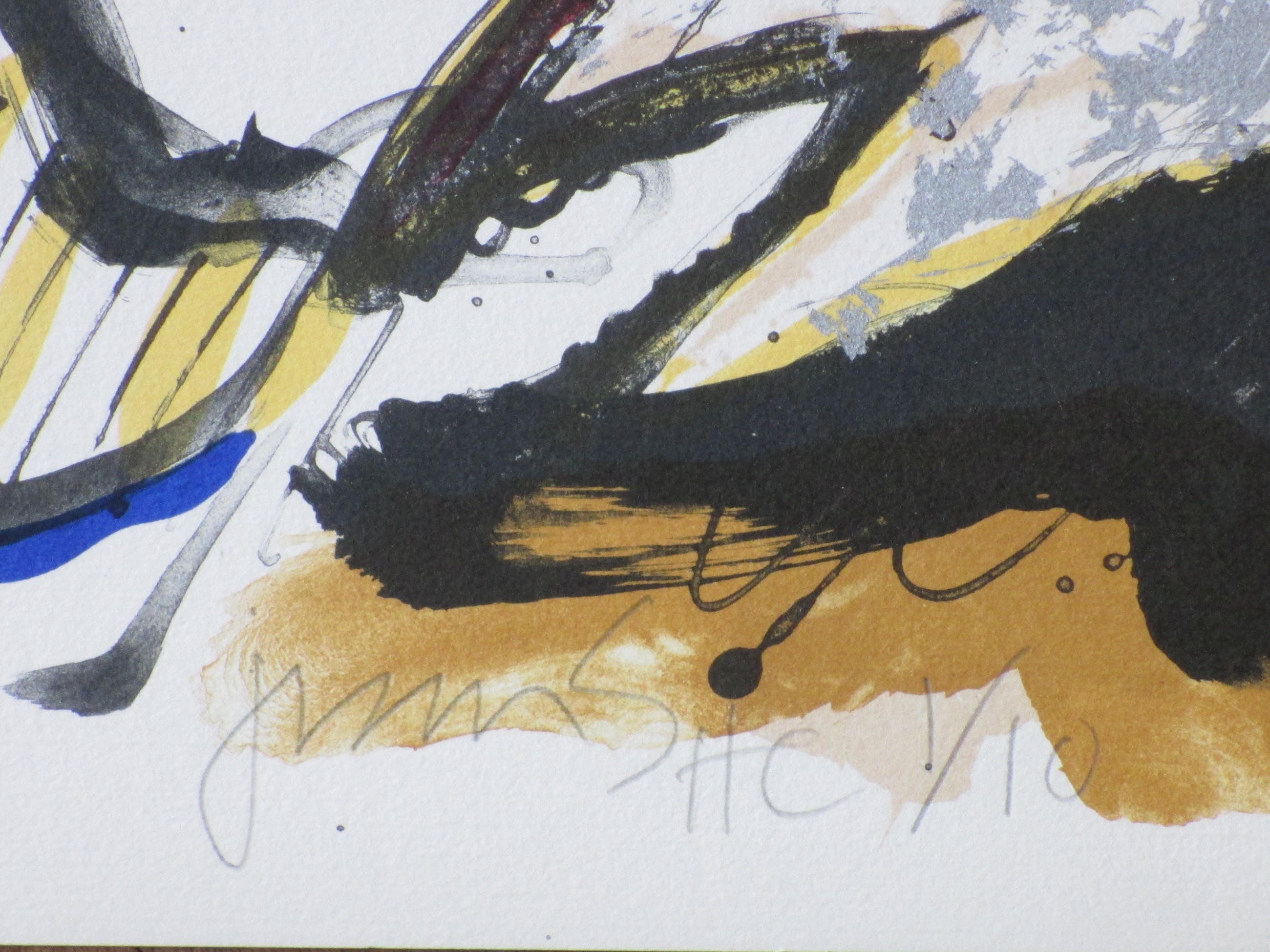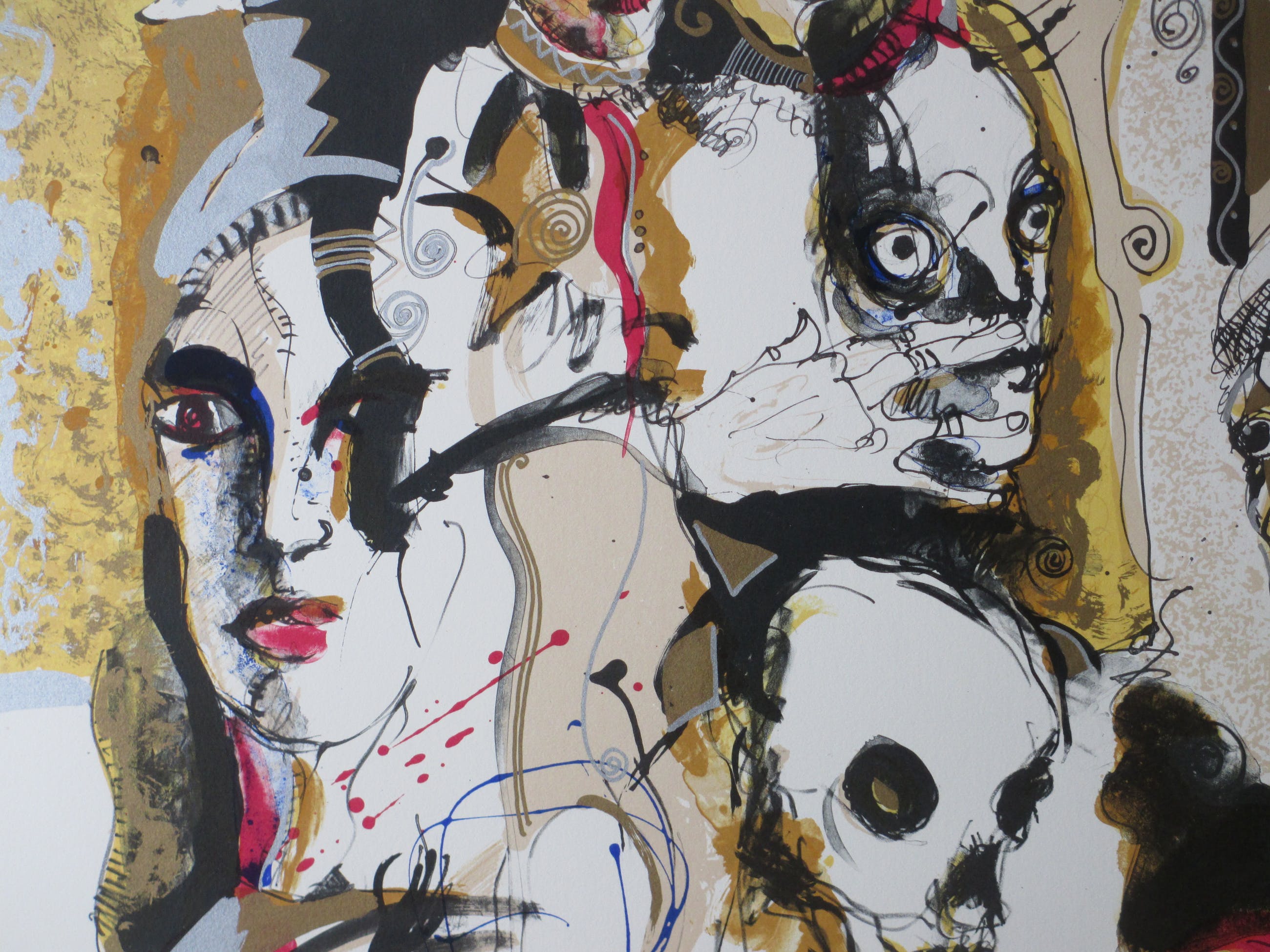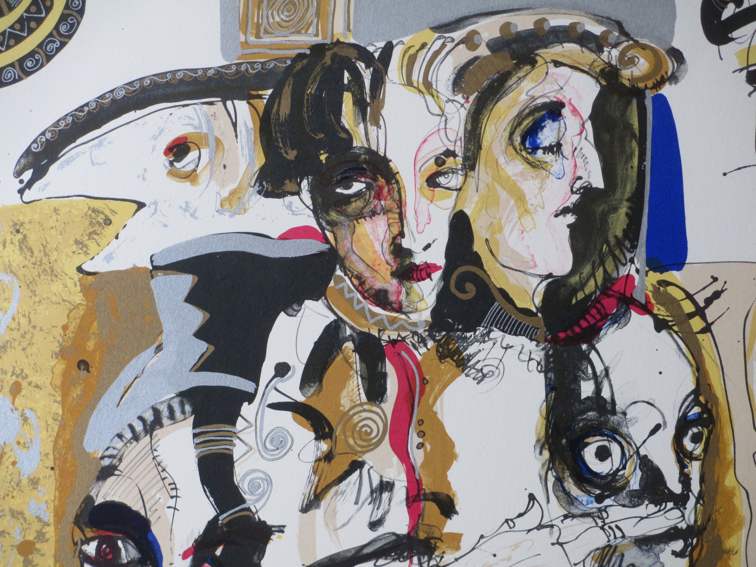 Handgekleurde litho door Jan VossVoorstelling van een surrealistische sceneLosbladig, beeldmaat 76x56Gesigneerd en genummerd r.o. in potlood ' JVoss. 1/10' Authenticiteit volledig gegarandeerd