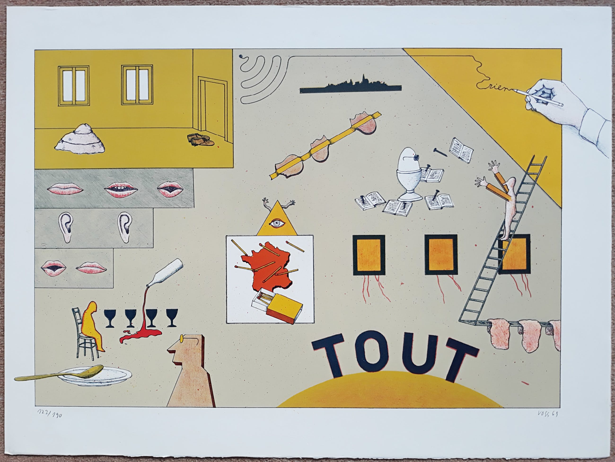 Bekend werk van Jan Voss uit de Prent 190 serie. Litho op Arches papier, met potlood gesigneerd, gedateerd (‘69) en genummerd (122/190). In zeer goede conditie.