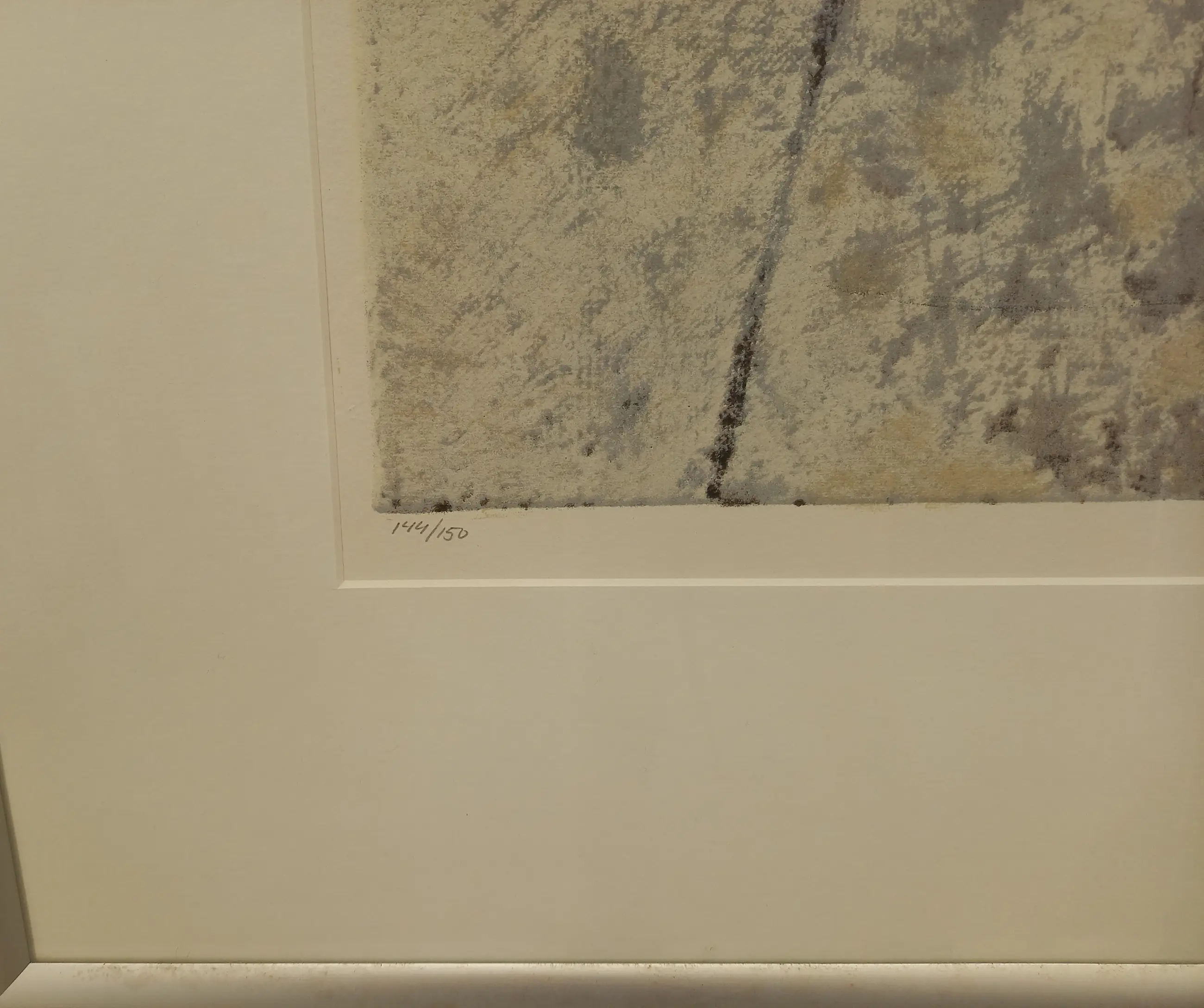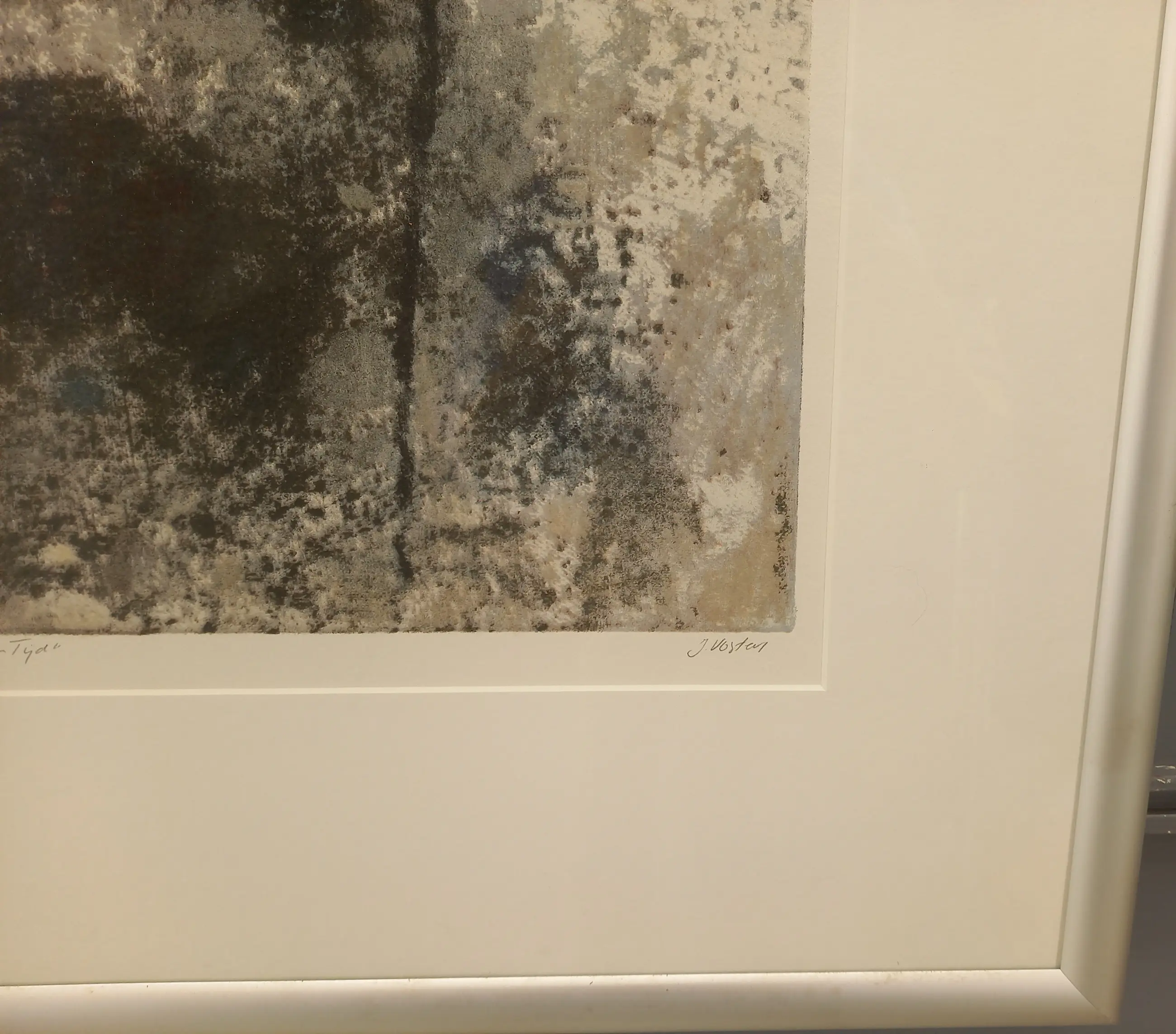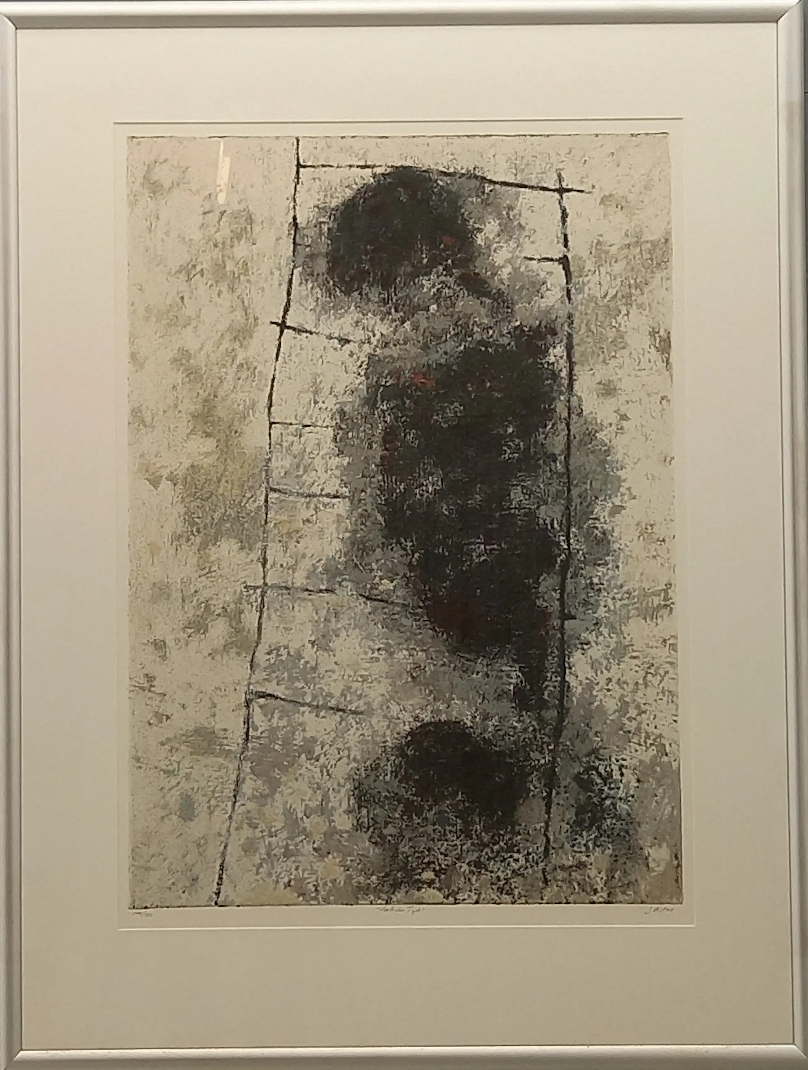 "Verleden tijd" bestaat uit 2 zeefdrukken. In aluminium lijst.