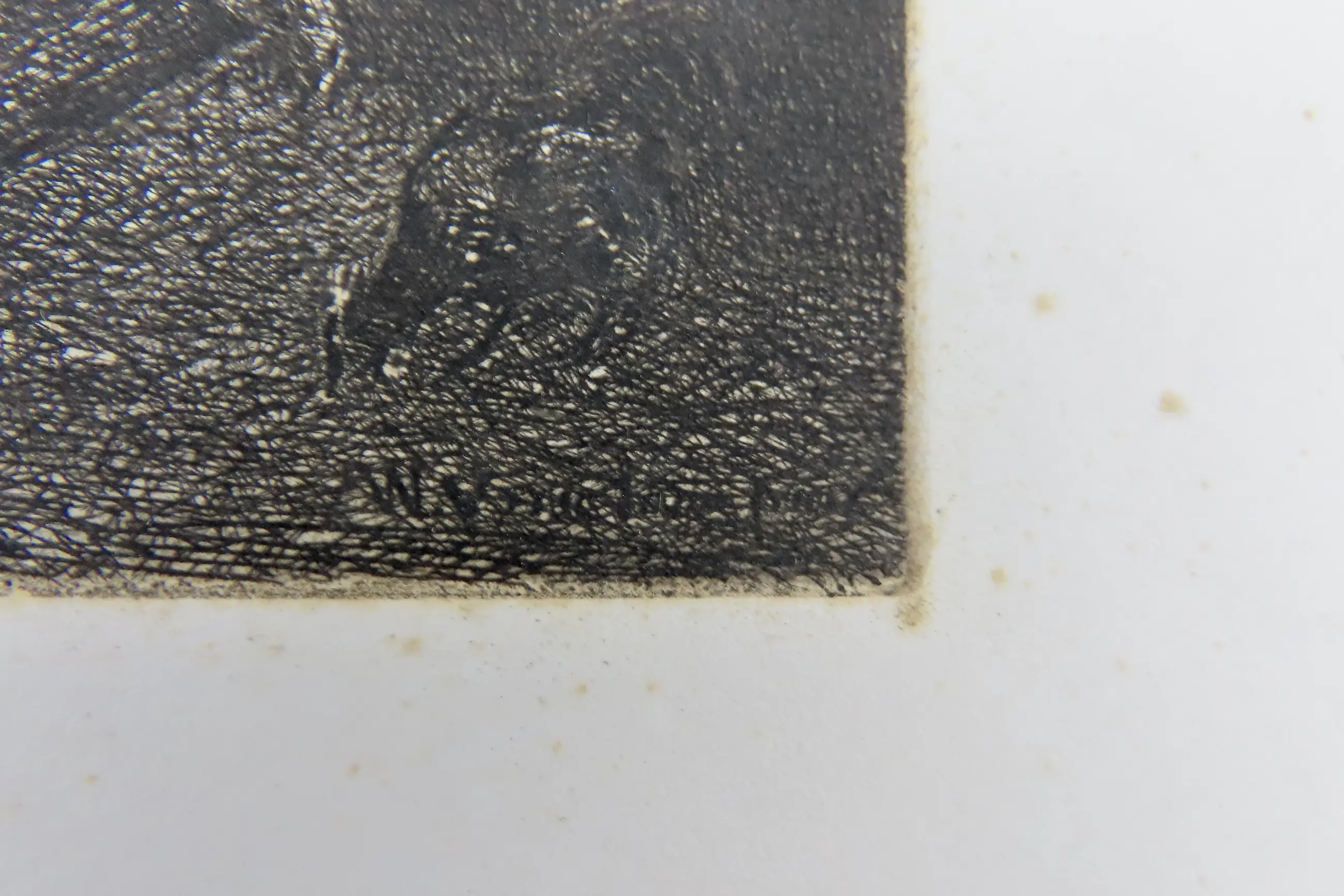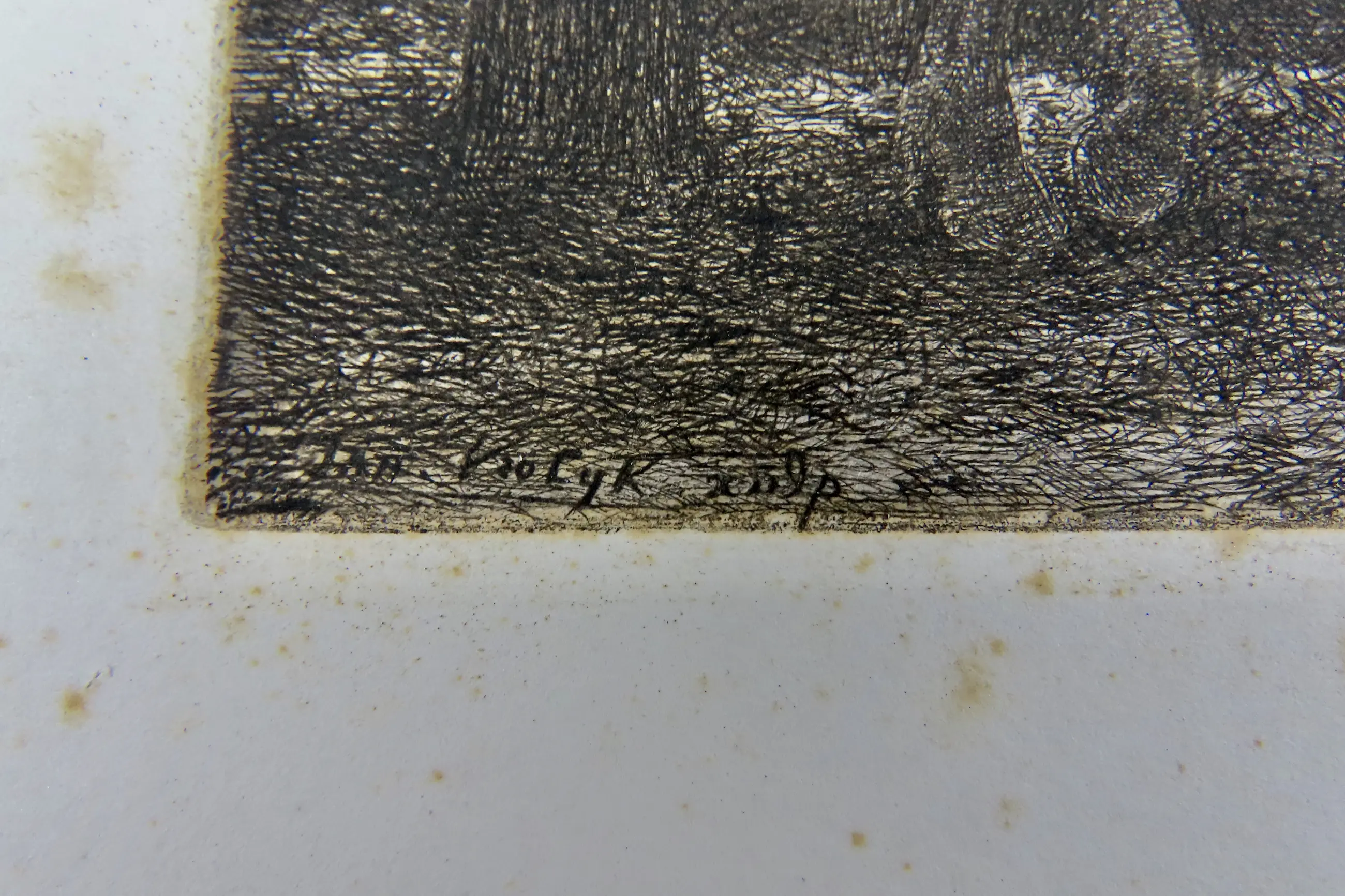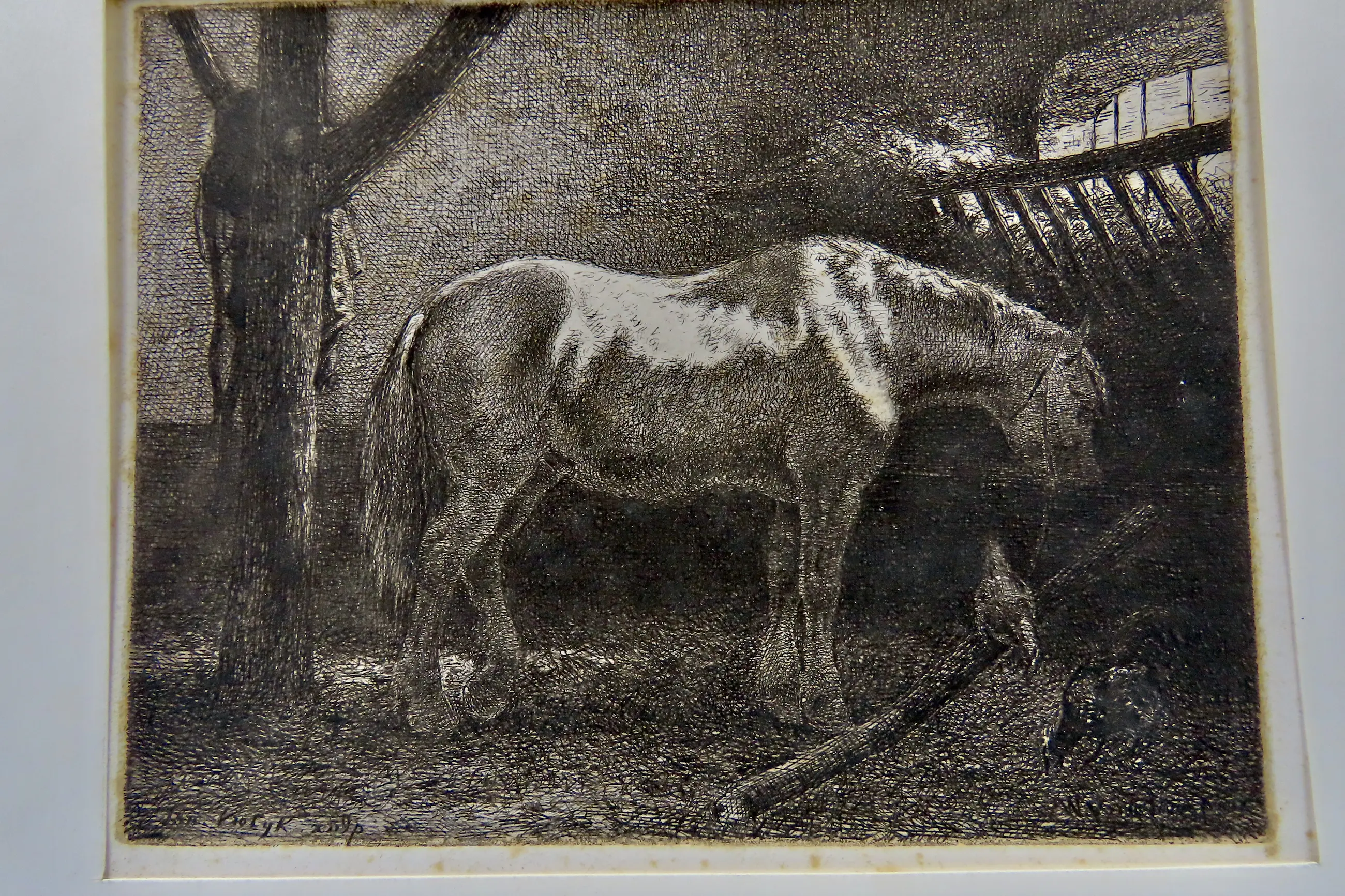 Jan Vrolijk (1846-1894) ets, paard met kippen de stal. 19e eeuwse ets. Rond om de ets wat roest, de ets zelf is in goede staat. Zie foto's. Er zijn veel koeien van hem bekend, weinig paarden. Sfeervol geheel.