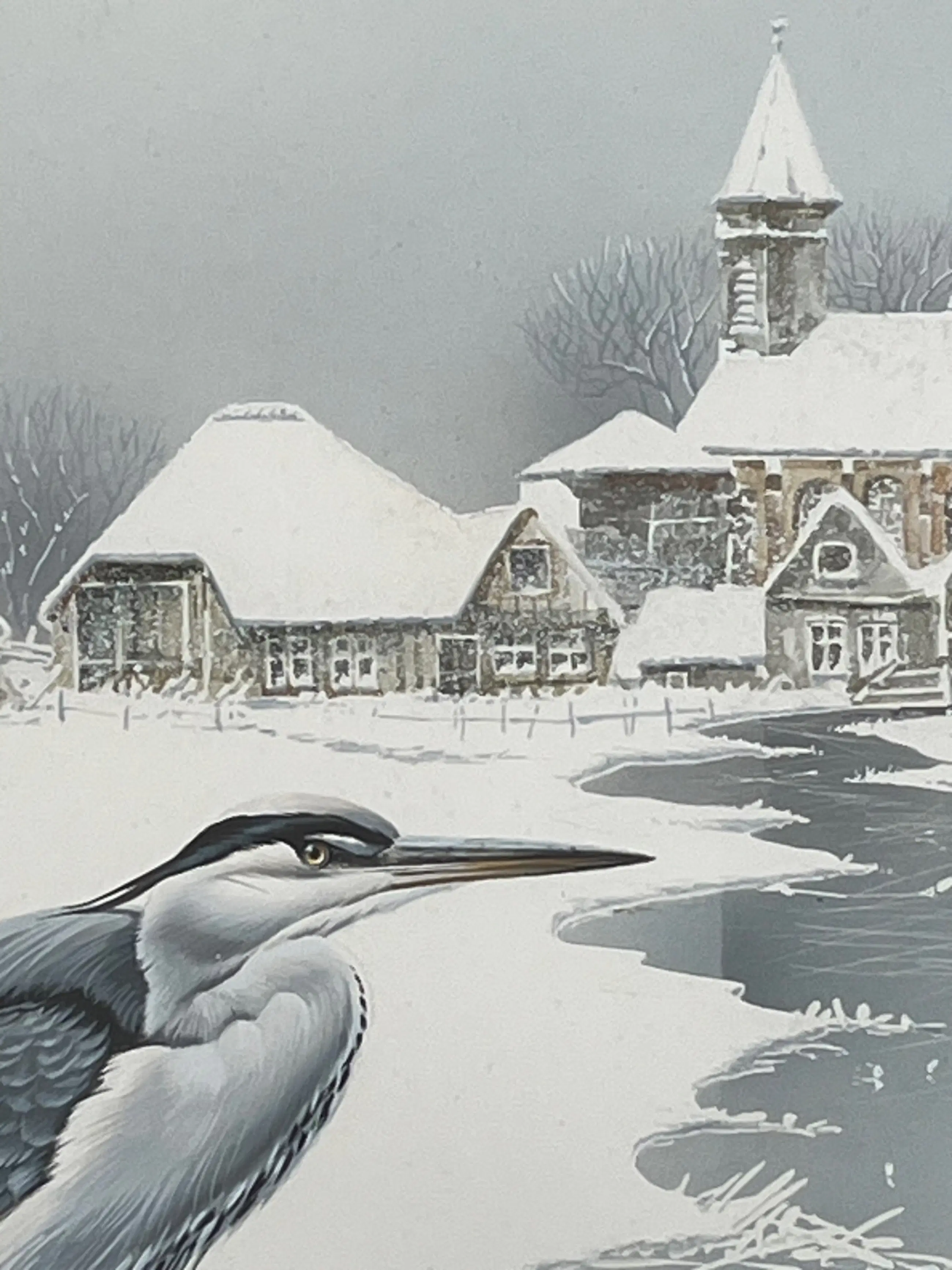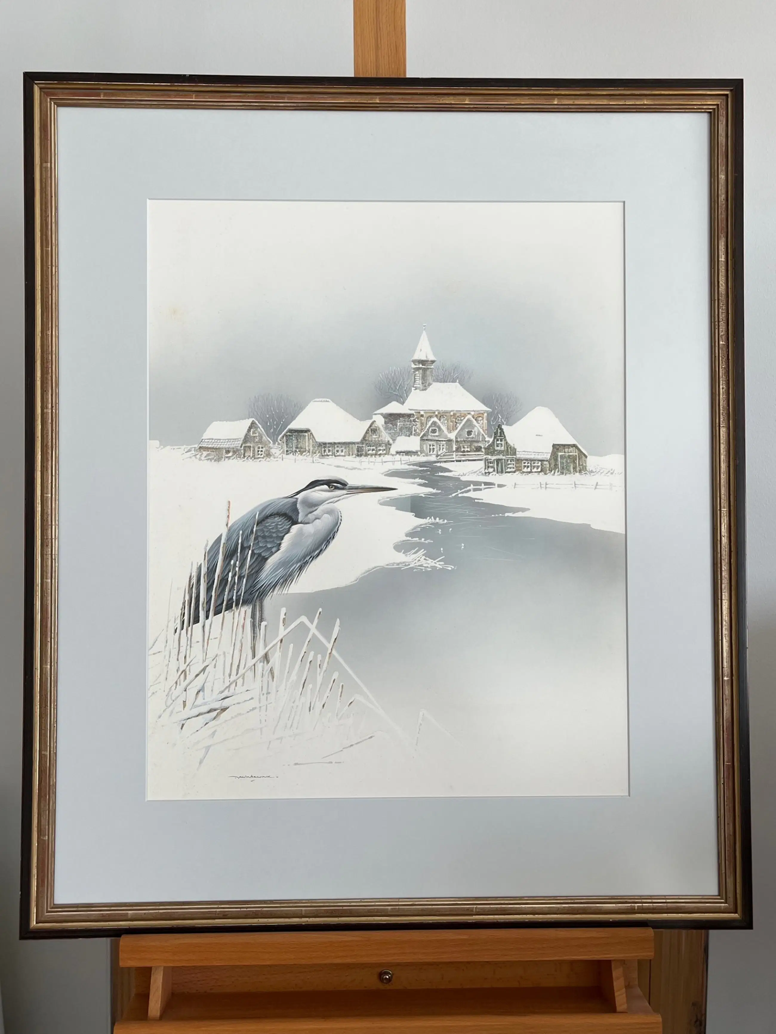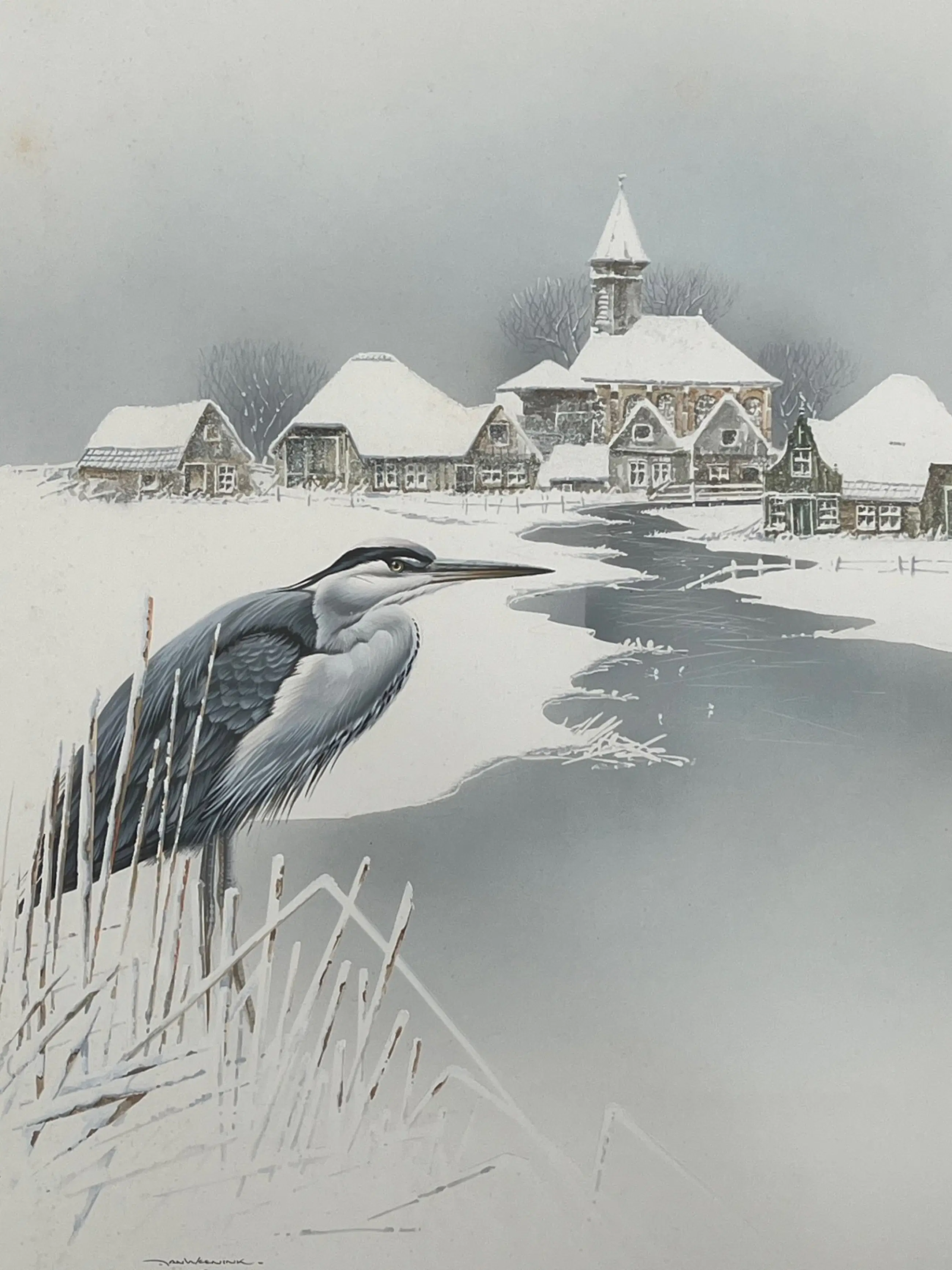 Sfeervolle gouache van Jan Weenink, waar een reiger overwintert in een besneeuwd landschap.