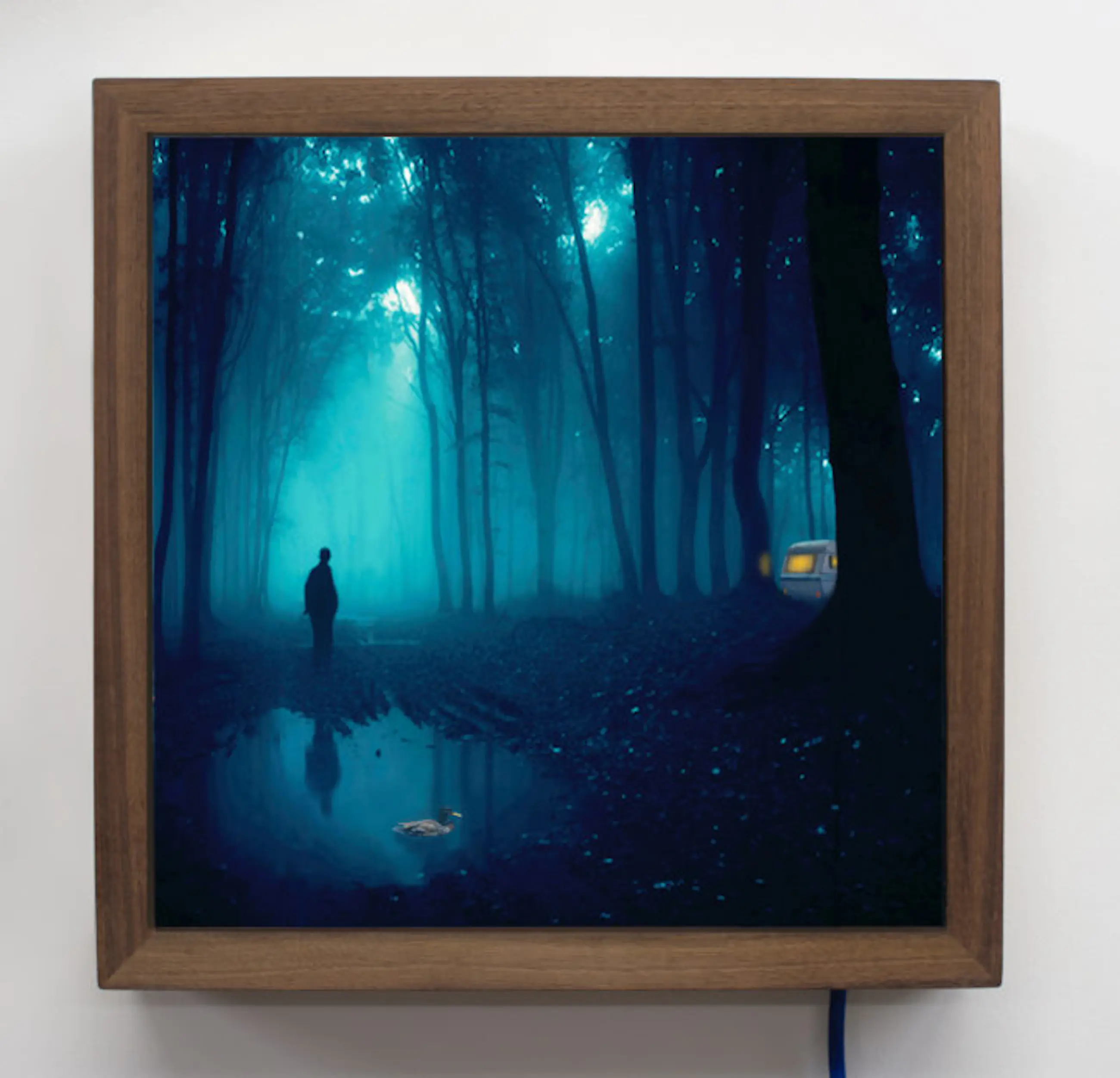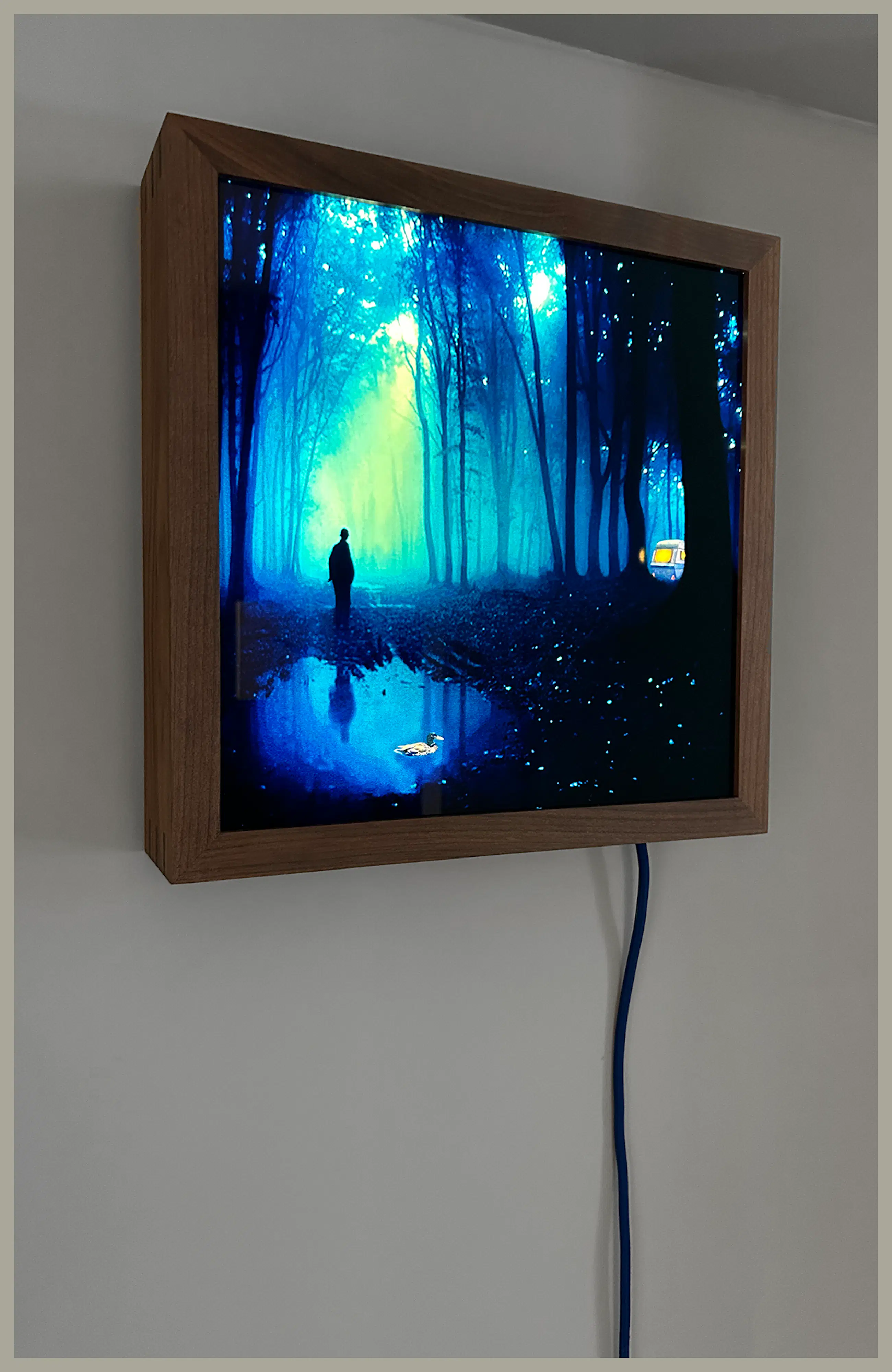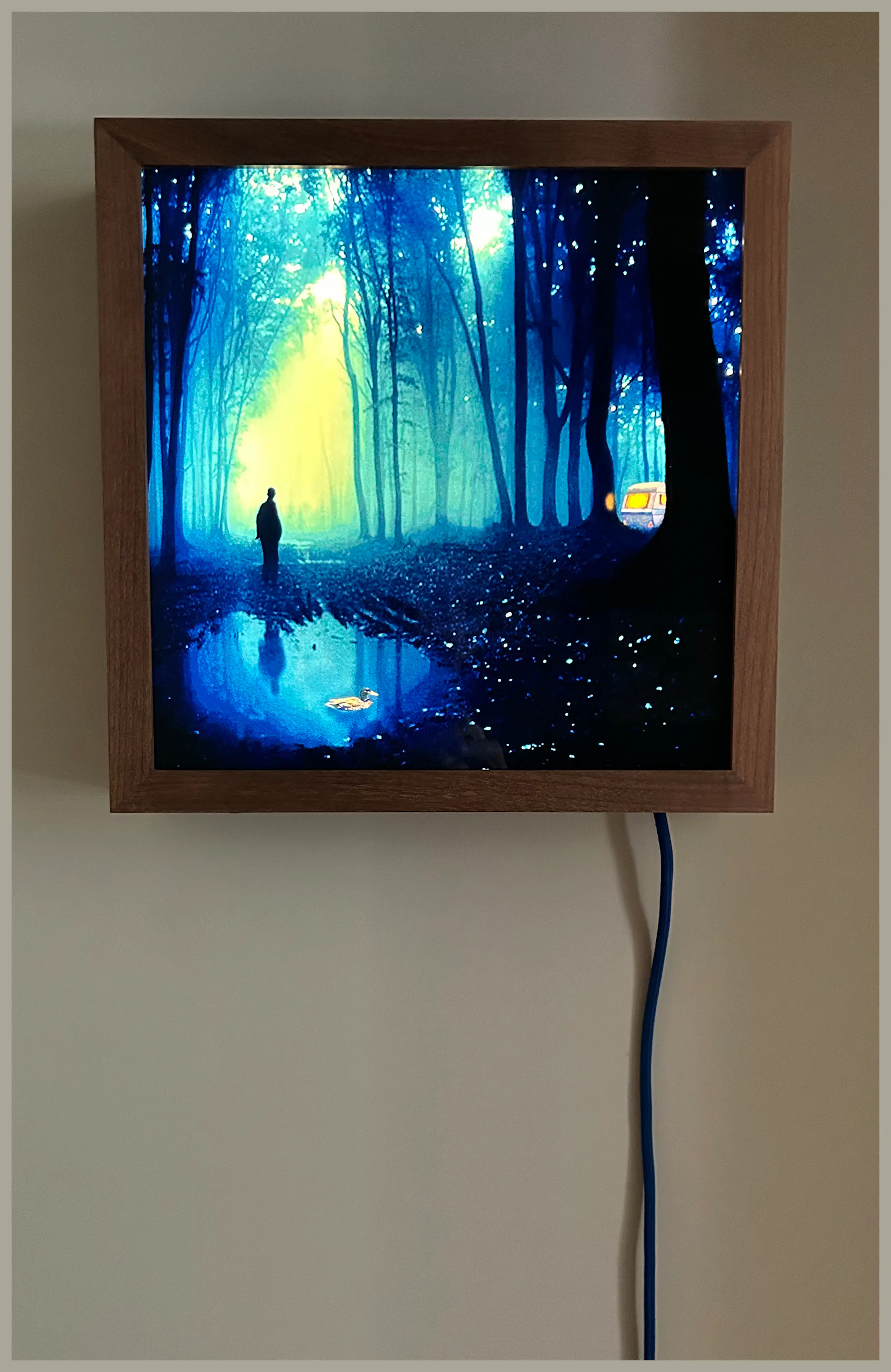 Deze lightbox is gemaakt met een frame met de warme uitstraling van notenhout. Het kunstwerk heeft een acrylglas voorzijde en is voorzien van LED verlichting inclusief driver en een lichtschakelaar met aan/uit- en dimfunctie. De lightbox is voorzien van een fel kobaltblauw, stoffen snoer (275 cm lang) dat past bij het spannende surrealistische thema: een beeld in de schemering (ochtend of avond) van een man in het bos met caravan, water en eend. Maakt nieuwsgierig. Rustgevend en ongemakkelijk tegelijkertijd. Verwondering.