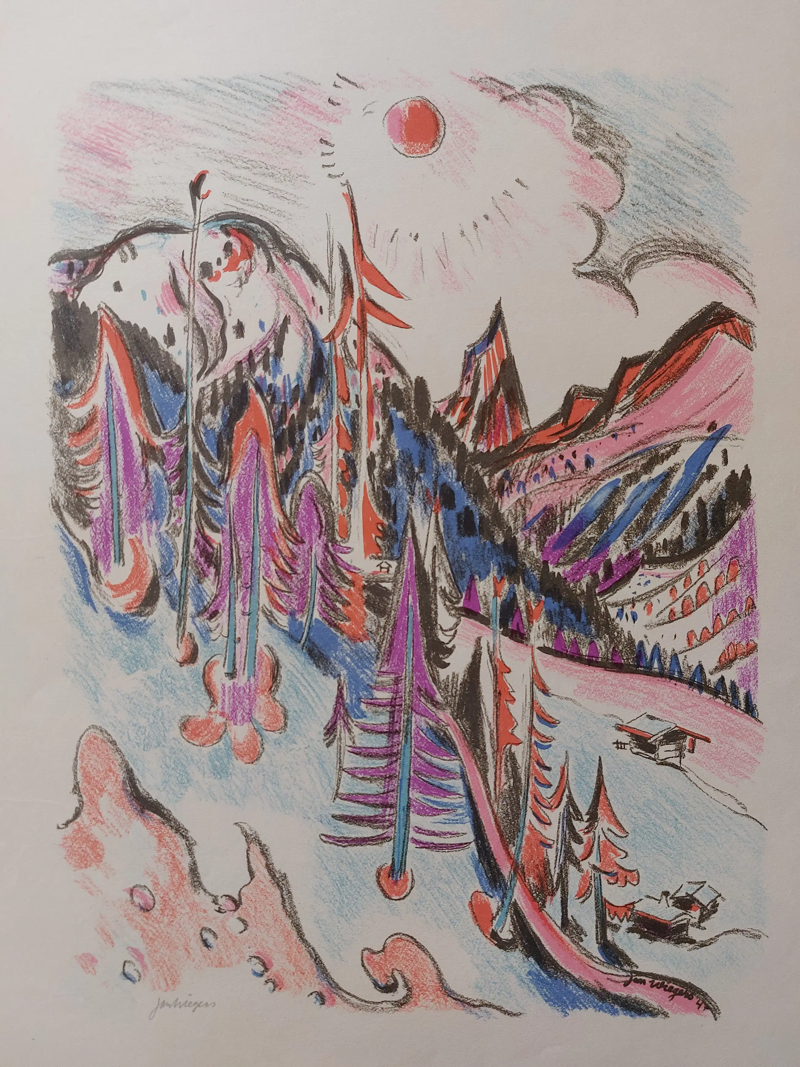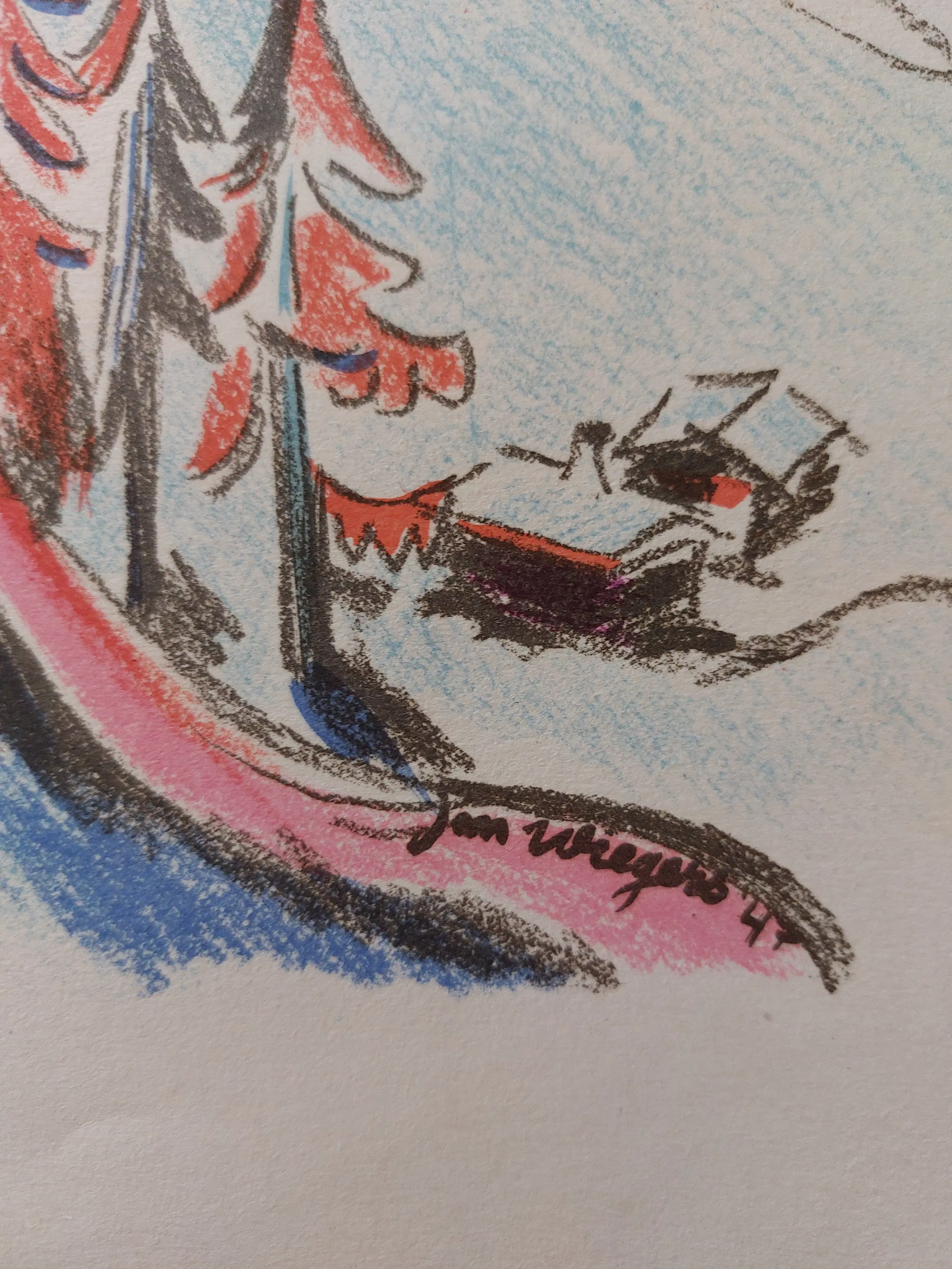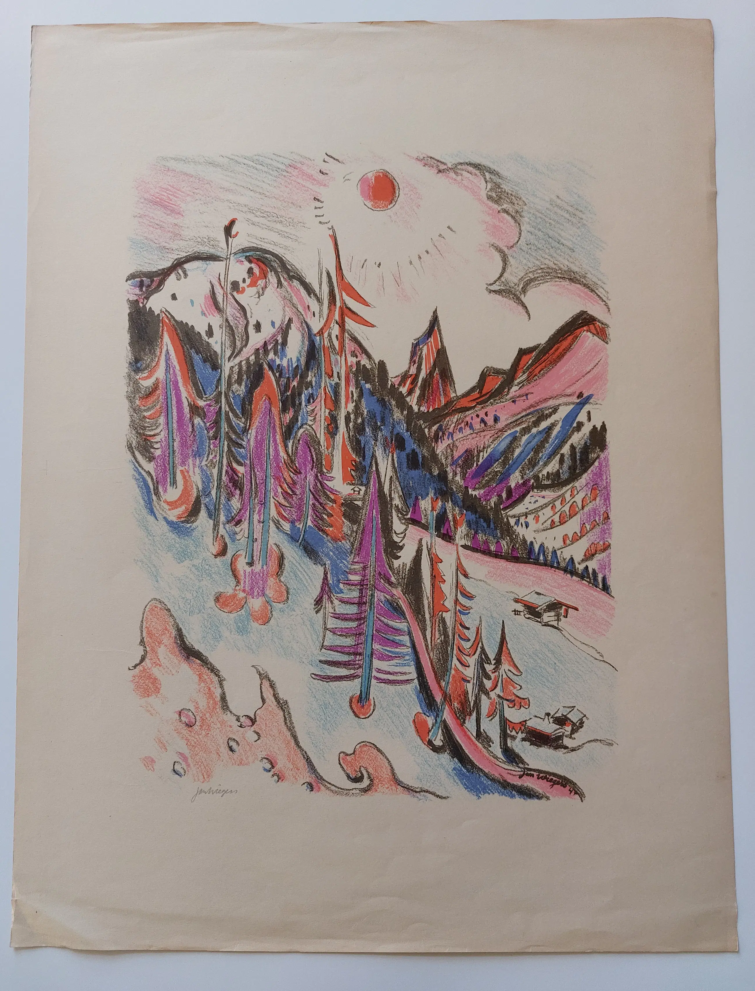 Zeer mooie litho van Jan Wiegers uit de serie Schildersprenten (1947). Een landschap in Ticino (“Italiaans” Zwitserland). In potlood gesigneerd linksonder en in de steen gesigneerd en gedateerd rechtsonder.