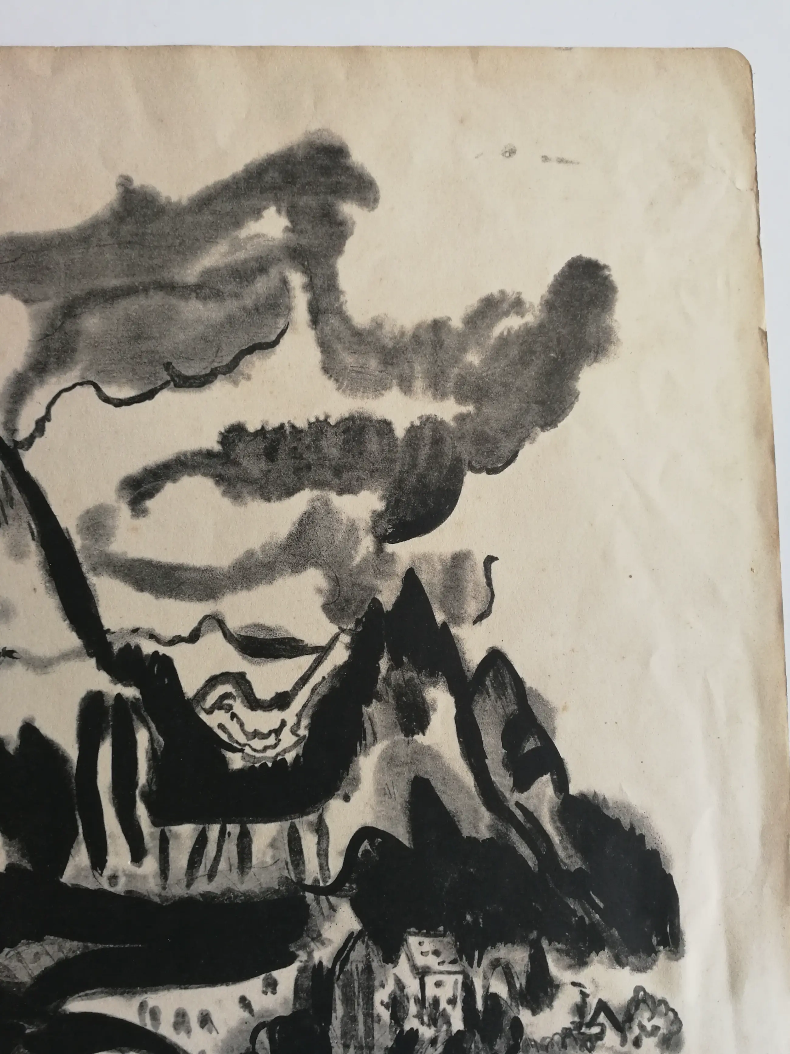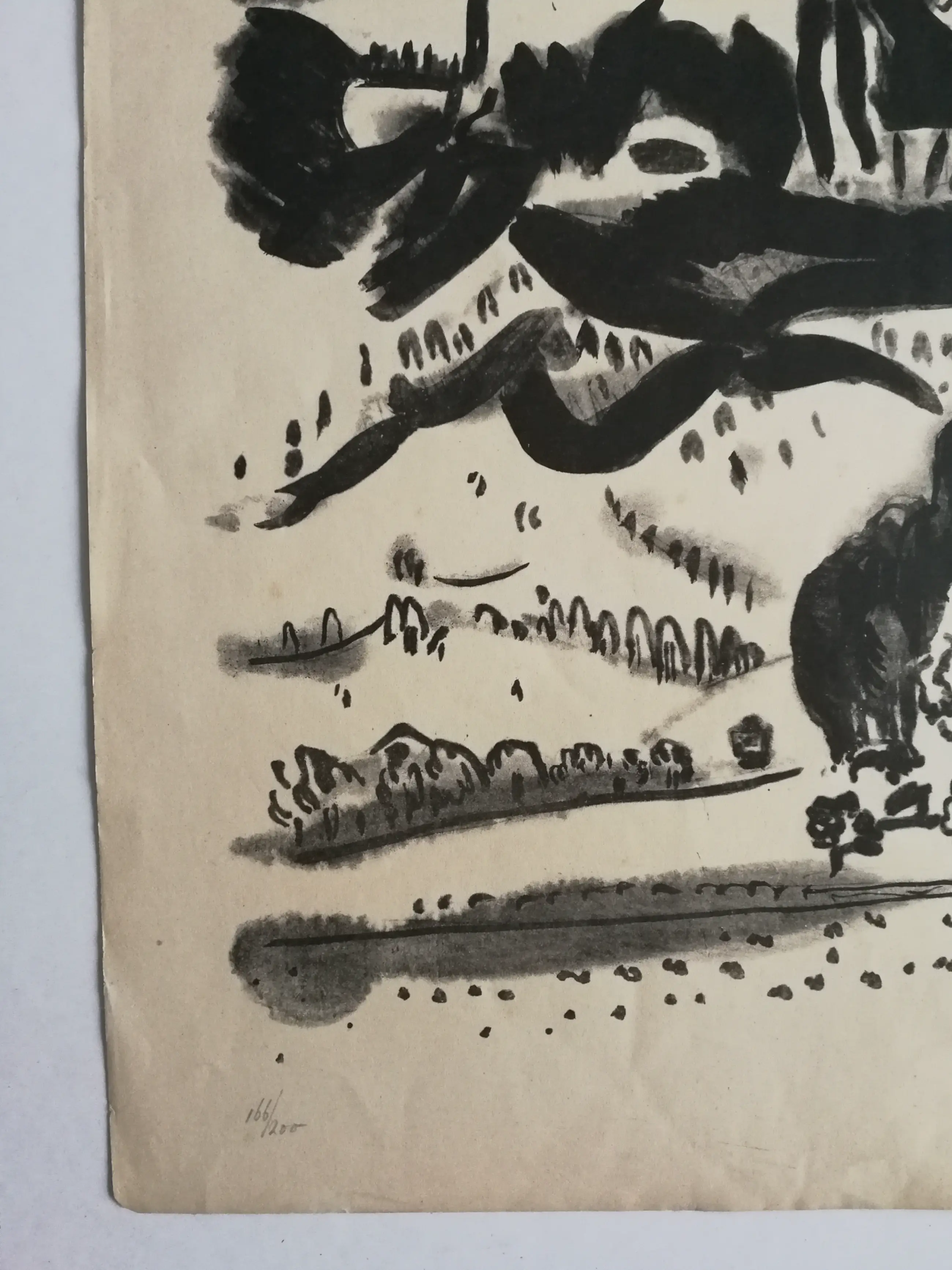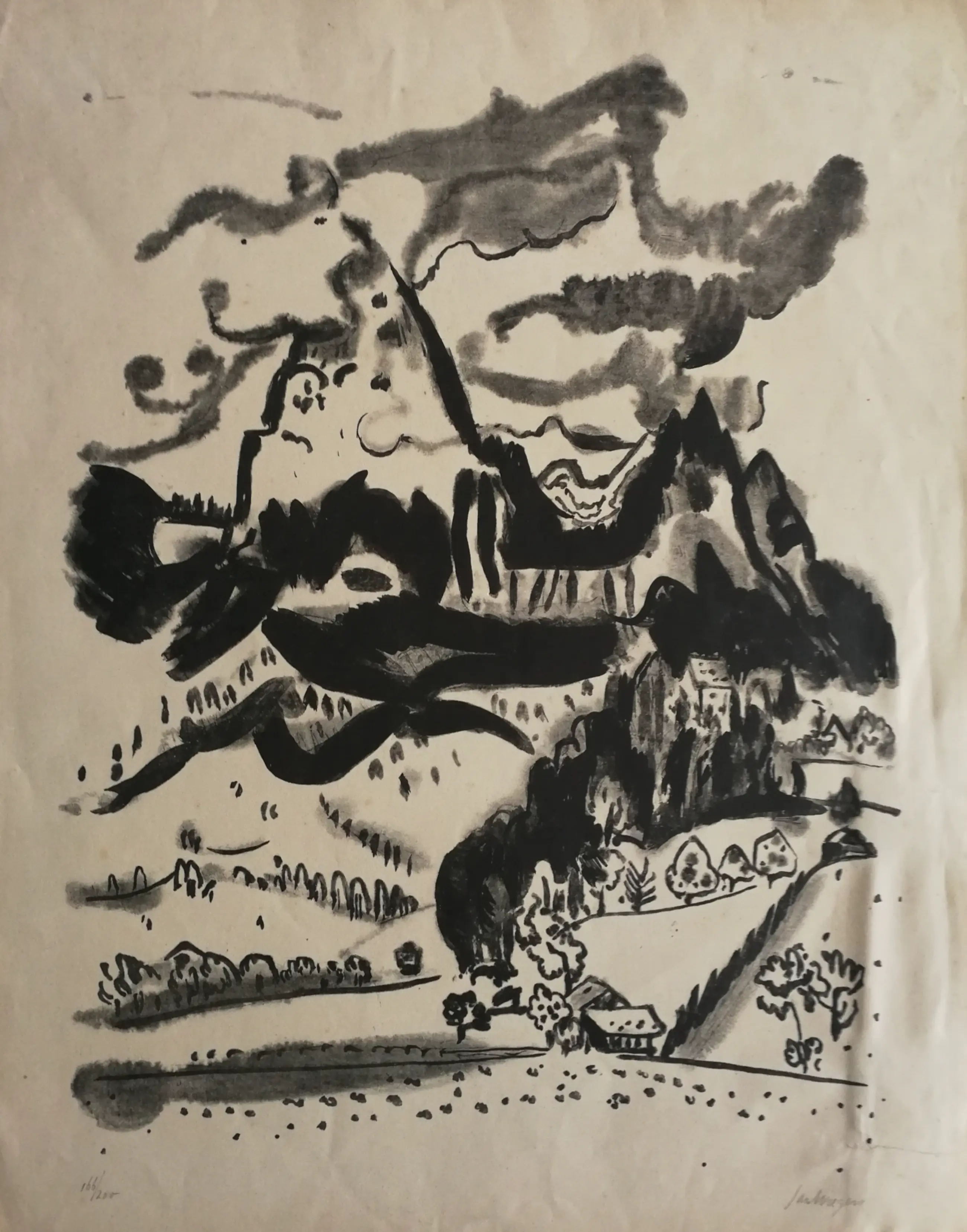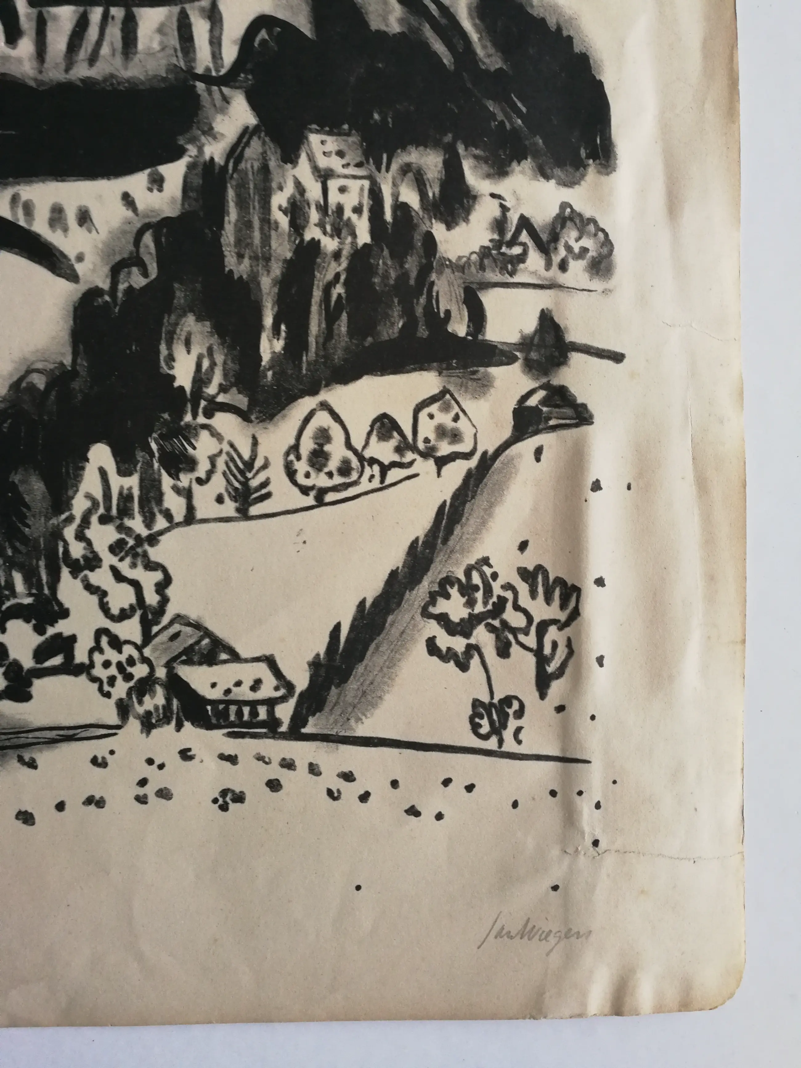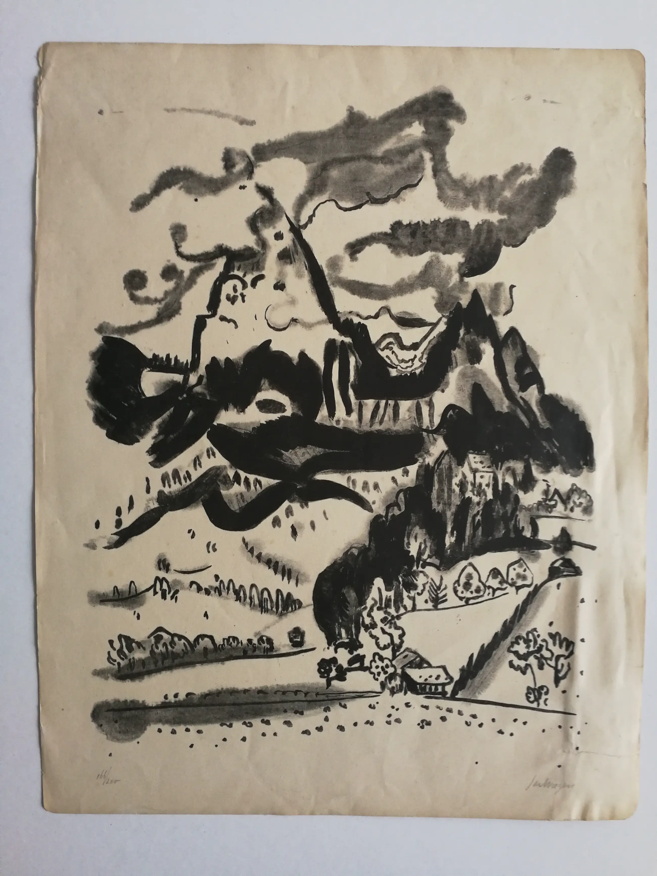 Mooi karakteristiek werk. Algemeen redelijk goede staat. Beeld goed. Beetje kreuk en scheurtje. Niet storend. Gesigneerd rechtsonder.