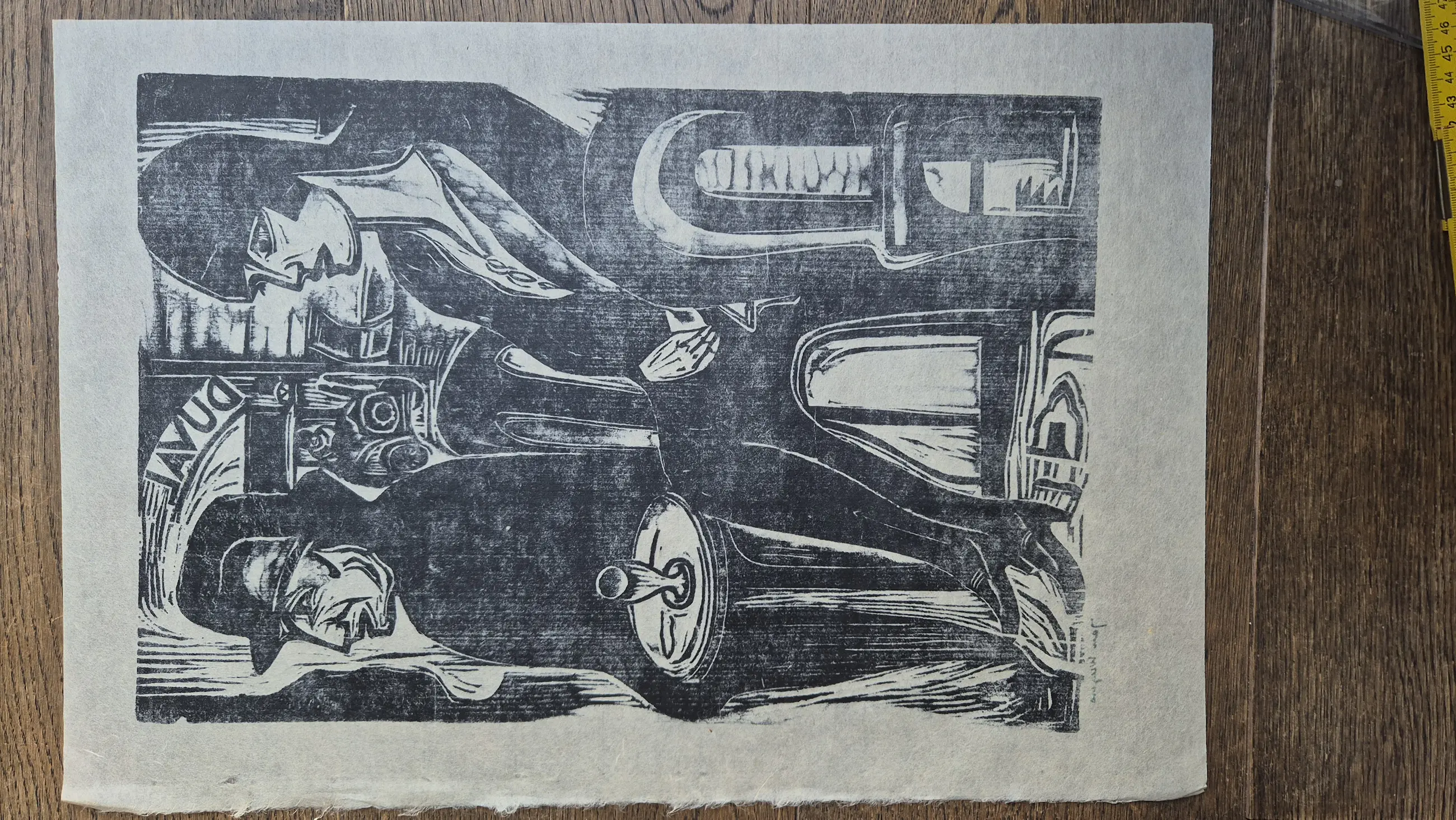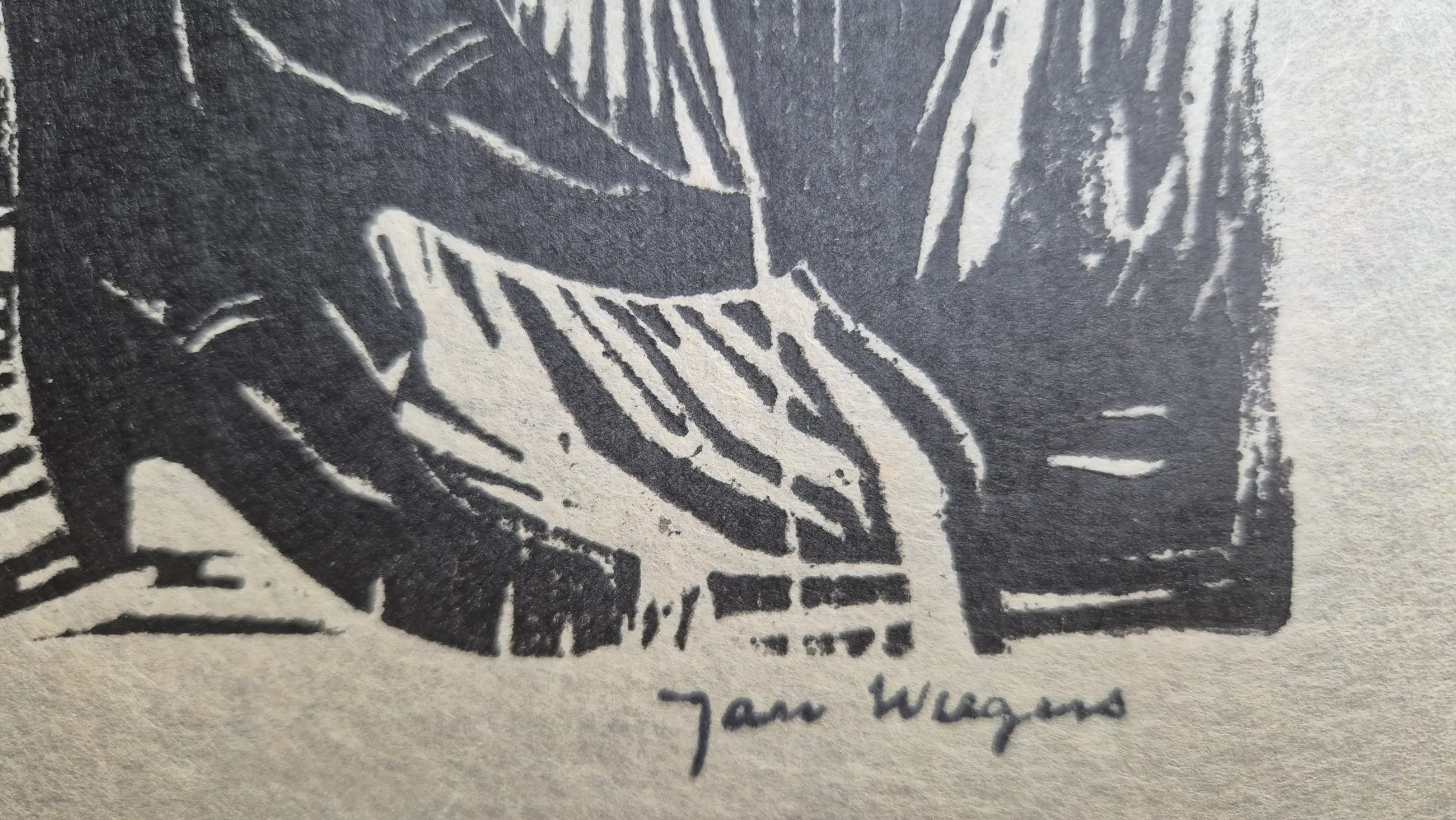 Expressieve houtsnede van De Ploeg kunstenaar Jan Wiegerr met zijn signatuur stempel.