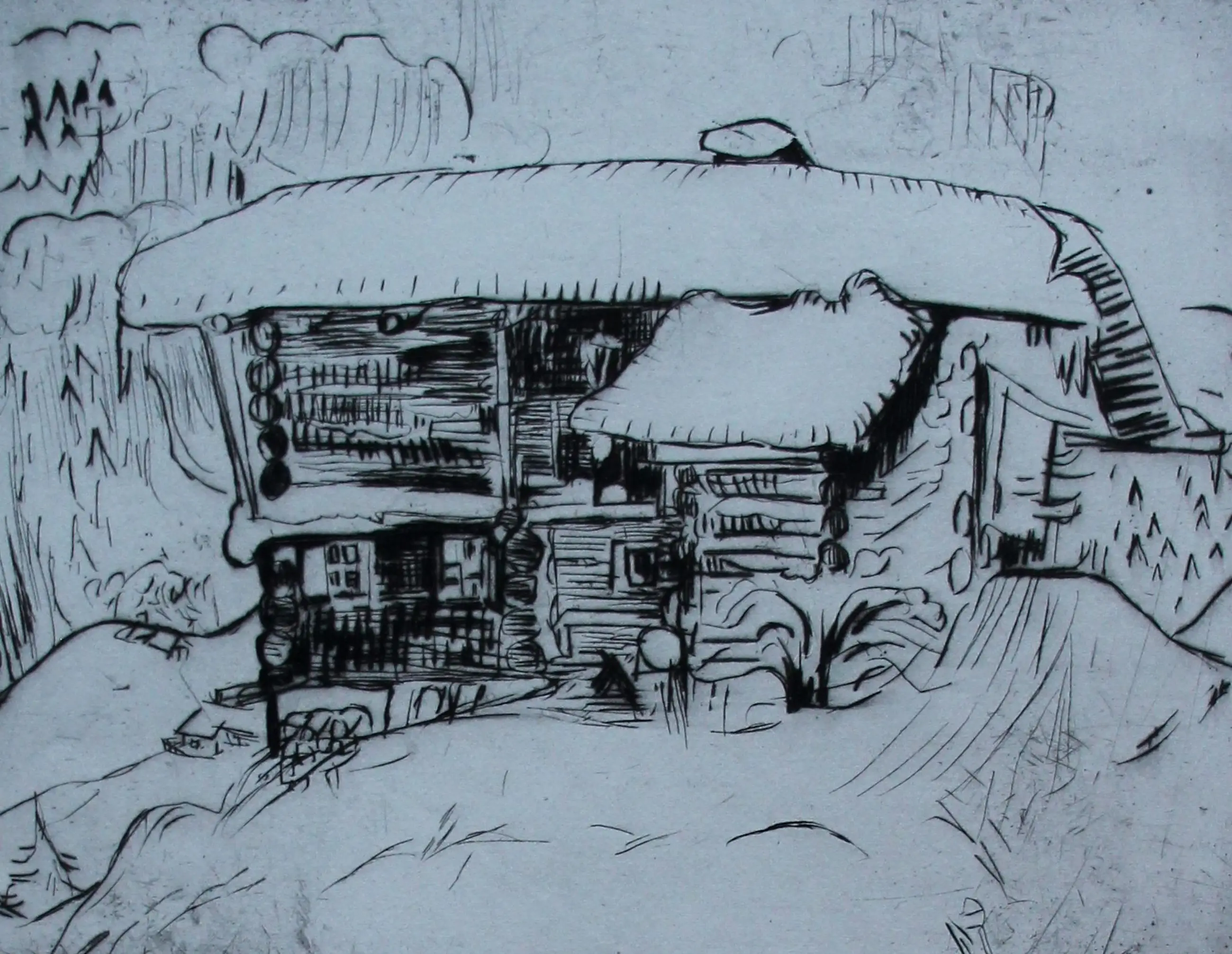Jan Wiegers - Droge naald ets: Chalet in de sneeuw
