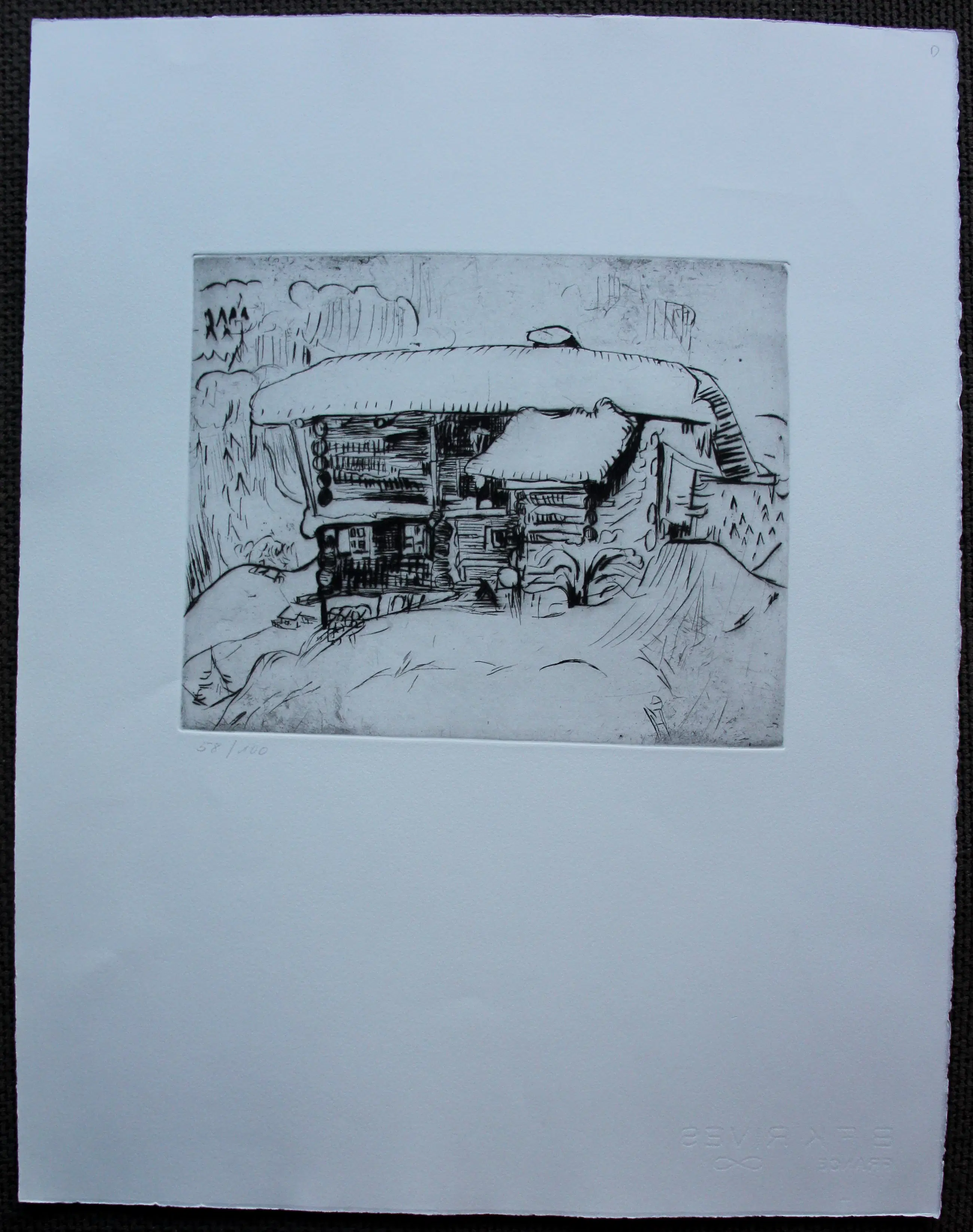 Droge naald ets van Jan Wiegers. Voorstelling van een chalet in de sneeuw. Oplage: 58/100. Afmetingen blad: H50 x b39cm. Afmetingen voorstelling: H19.5 x b24.5cm. De authenticiteit van het aangeboden werk wordt volledig gegarandeerd. Een certificaat van echtheid wordt, op aanvraag, gemaild.