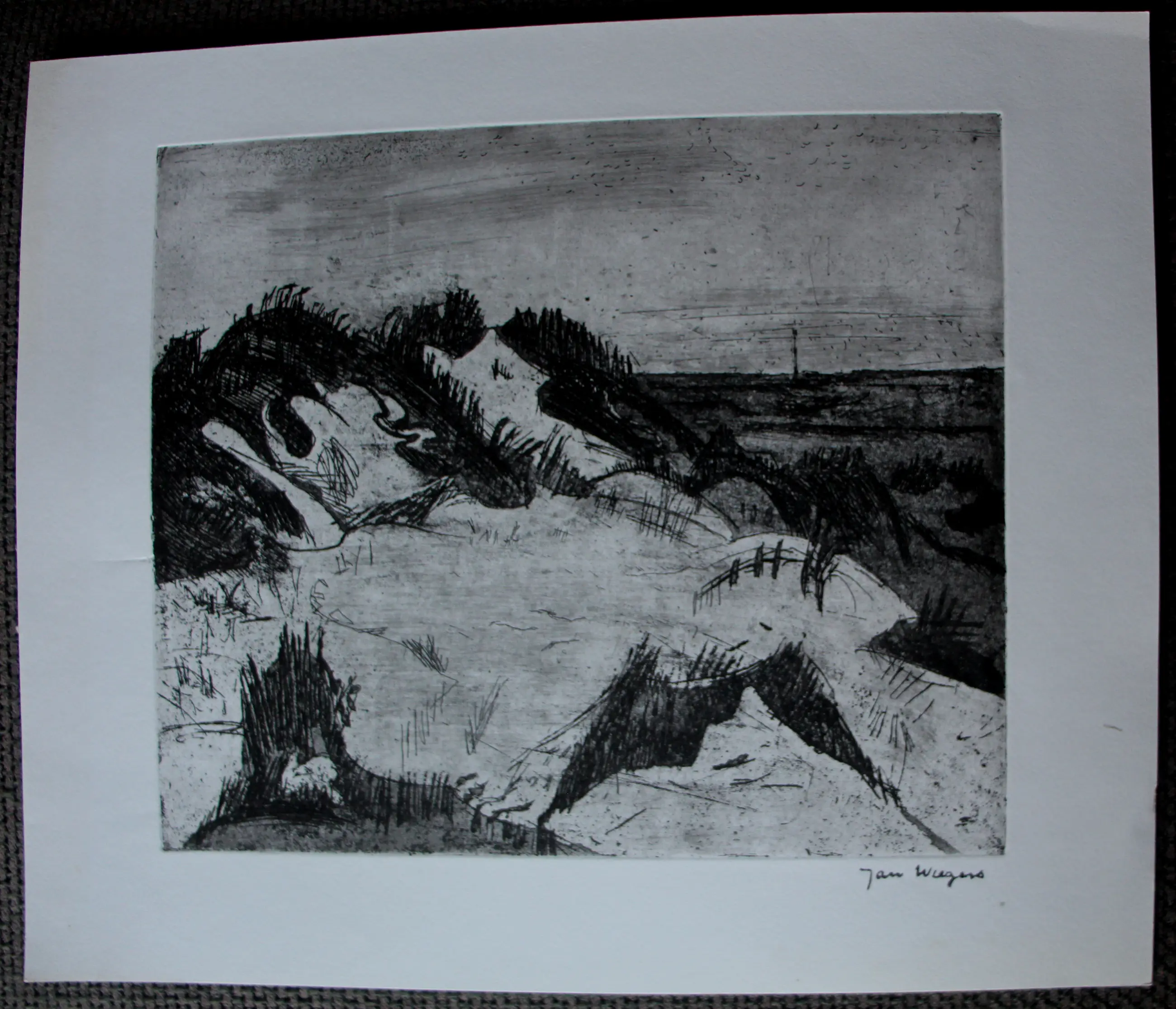 Droge naald ets van Jan Wiegers. Voorstelling van een duinlandschap. Afmetingen blad: H27.5 x b33cm. Afmetingen voorstelling: H20.5 x b24.5cm. Het werk is, rechts onderaan, gesigneerd met de stempel van de kunstenaar. De authenticiteit van het aangeboden werk wordt volledig gegarandeerd. Een certificaat van echtheid kan, op aanvraag, worden gemaild.
