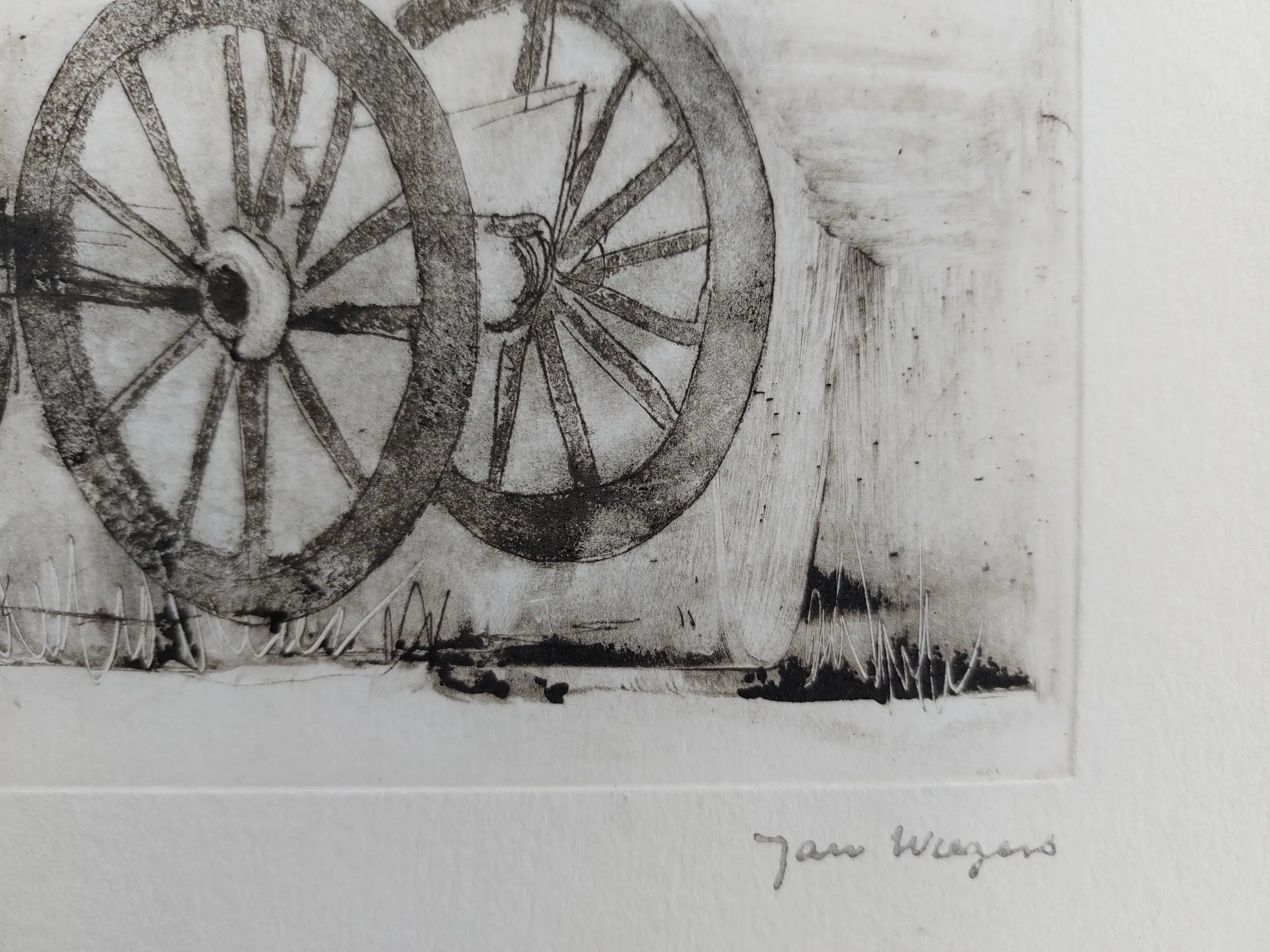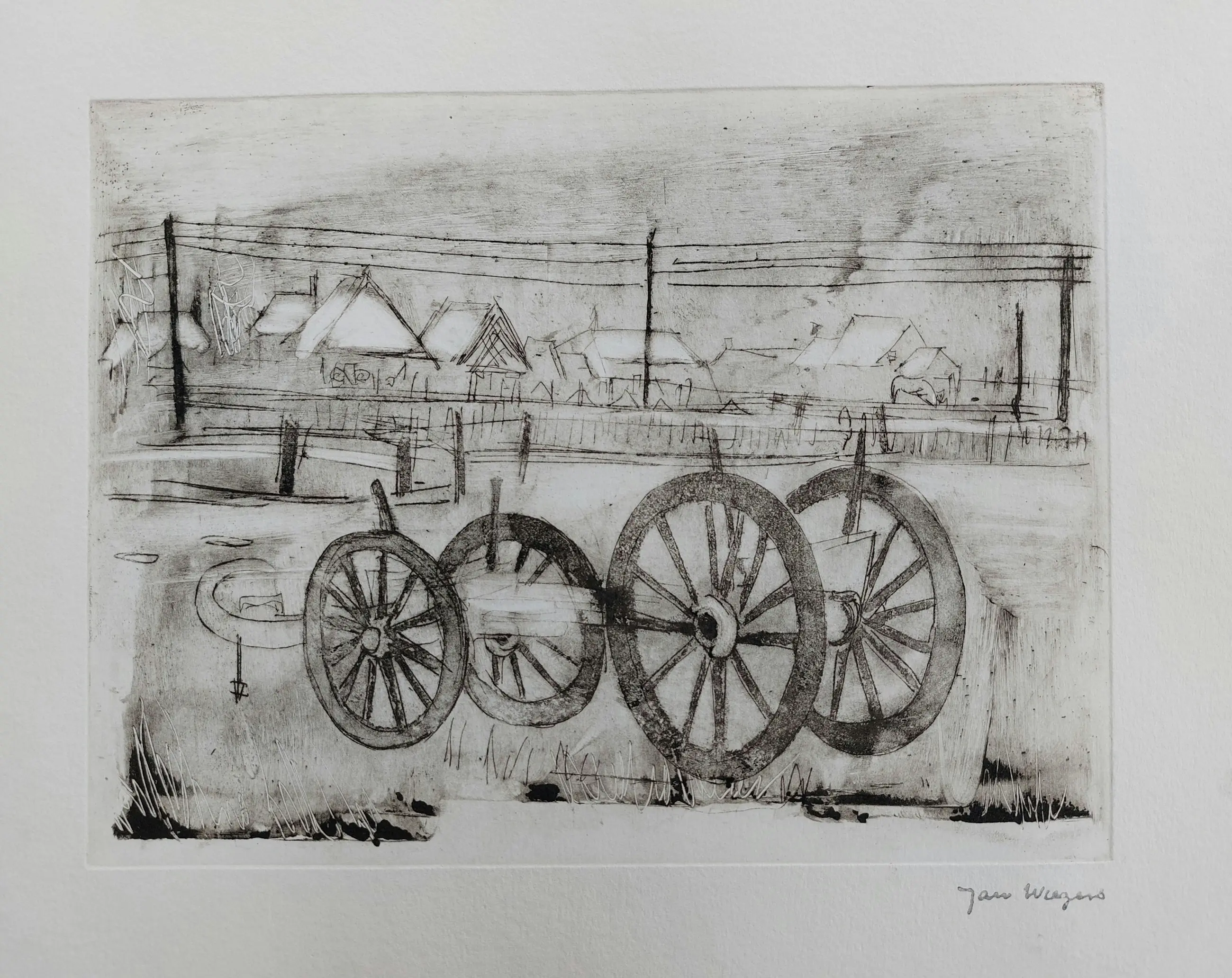 Leuke postume ets van een dorpsgezicht met kar van Jan Wiegers. Met atelierstempel rechtsonder. Zie ook de afbeeldingen voor een eigen indruk.