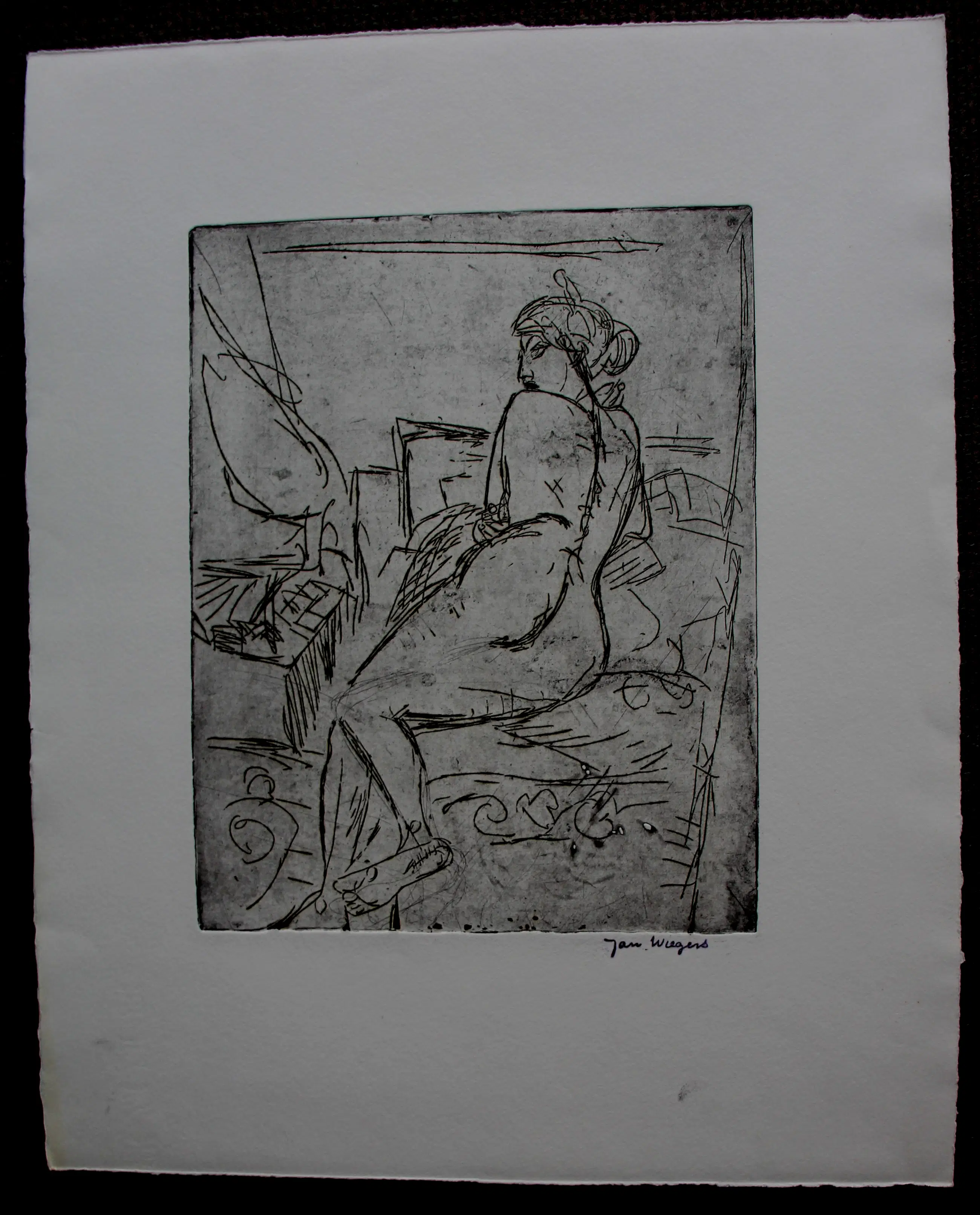 Ets van Jan Wiegers. Voorstelling van een naakte dame liggend op bed. Afmetingen blad: H40 x b32.5cm. Afmetingen voorstelling: H24.5 x b19.5cm. Het werk is, rechts onderaan, gesigneerd met de stempel van de kunstenaar. De authenticiteit van het aangeboden werk wordt volledig gegarandeerd. Een certificaat van echtheid kan, op aanvraag, worden gemaild.