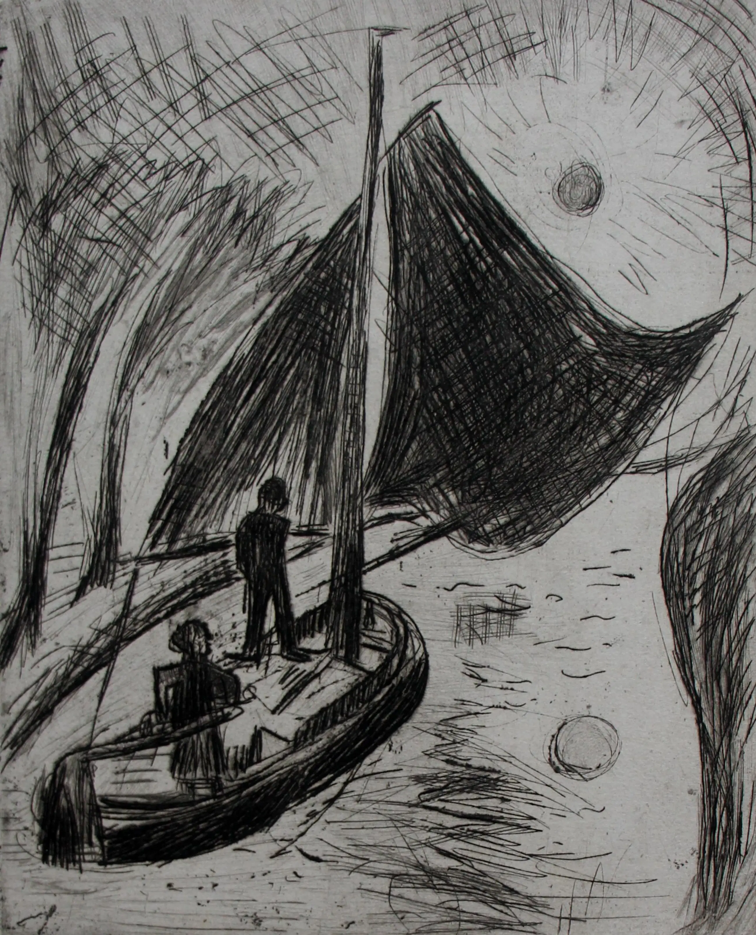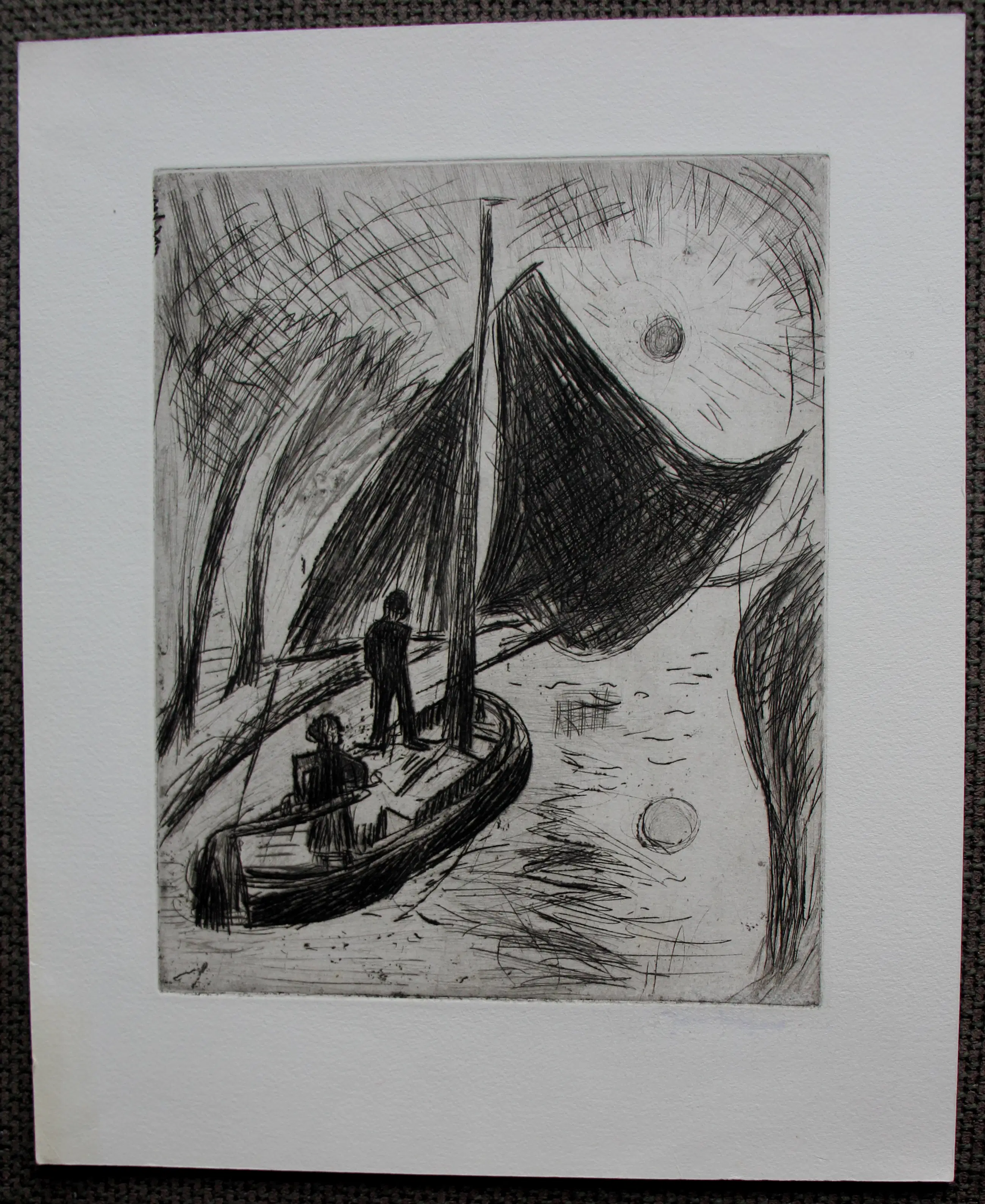 Ets van Jan Wiegers. Voorstelling van een schip in Amsteldiep. Afmetingen blad: H34 x b28cm. Afmetingen voorstelling: H24.5 x b19.5cm. Het werk was(is weggehaald), rechts onderaan, gesigneerd met de stempel van de kunstenaar. De authenticiteit van het aangeboden werk wordt volledig gegarandeerd. Een certificaat van echtheid kan, op aanvraag, worden gemaild.