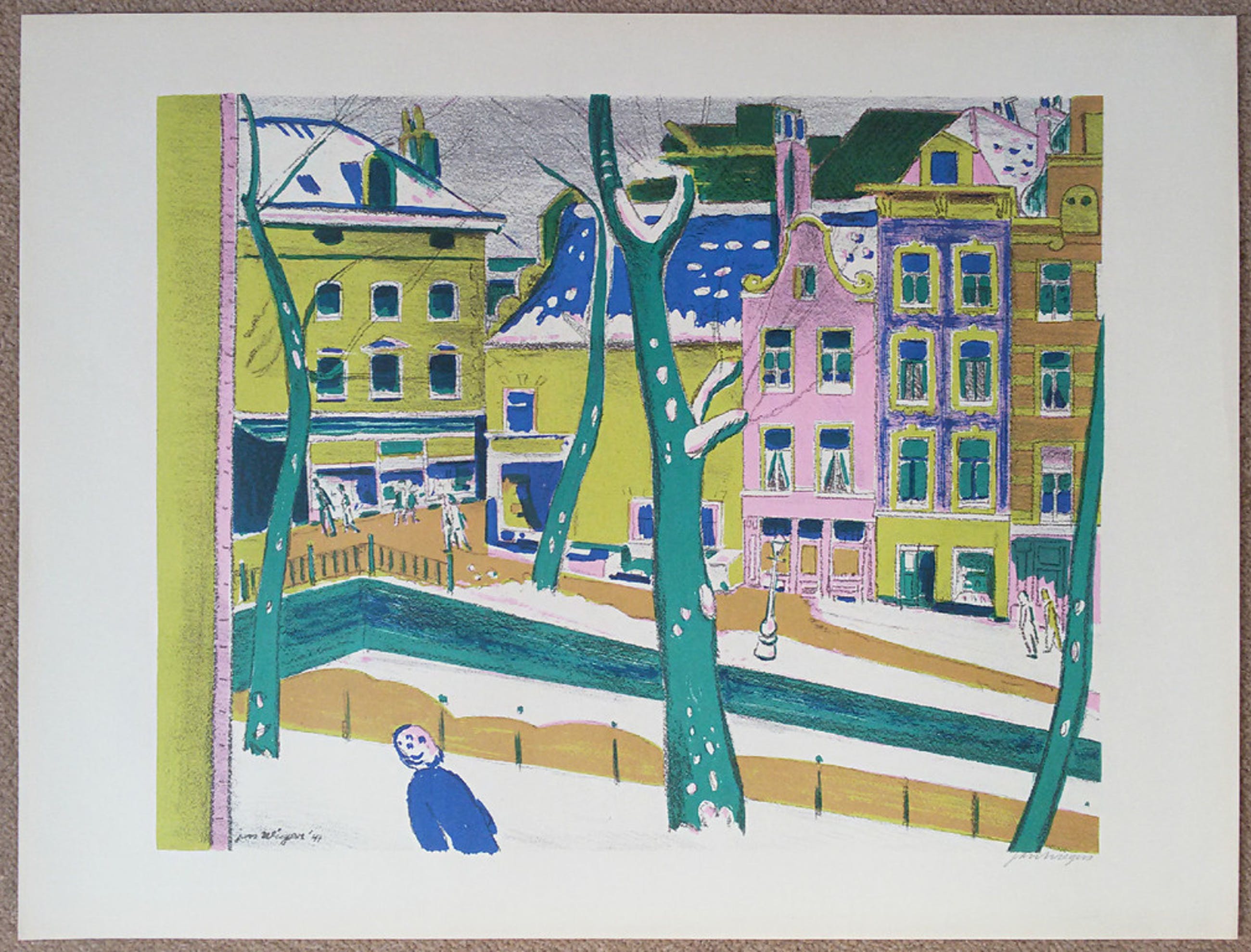 Prachtig gezicht op de Achterburgwal in Amsterdam van Jan Wiegers. De meest gezochte litho uit de reeks Schildersprenten uit 1947. Met potlood gesigneerd rechtsonder, en gedateerd (’47) en nogmaals gesigneerd linksonder in de steen. In zeer goede conditie.