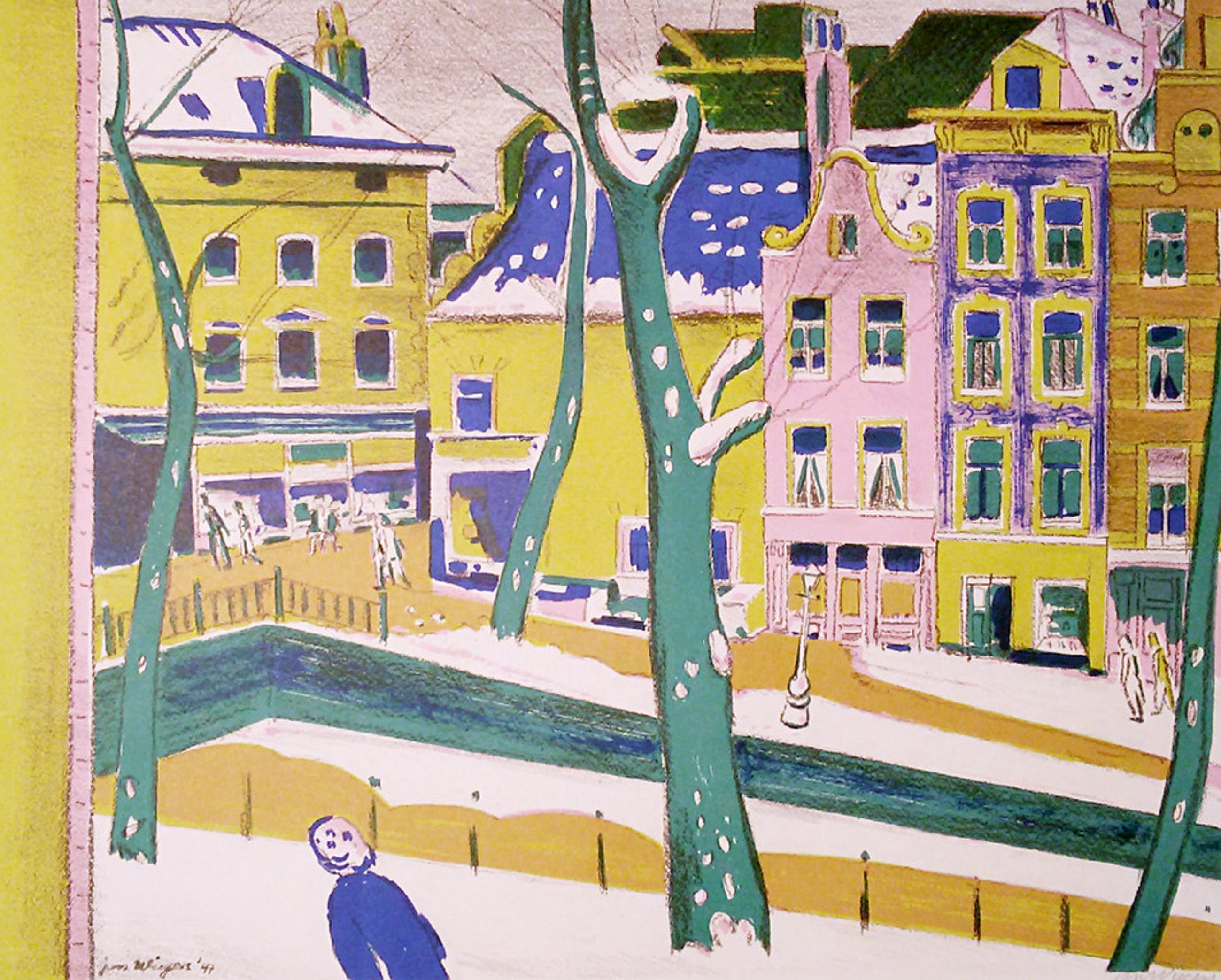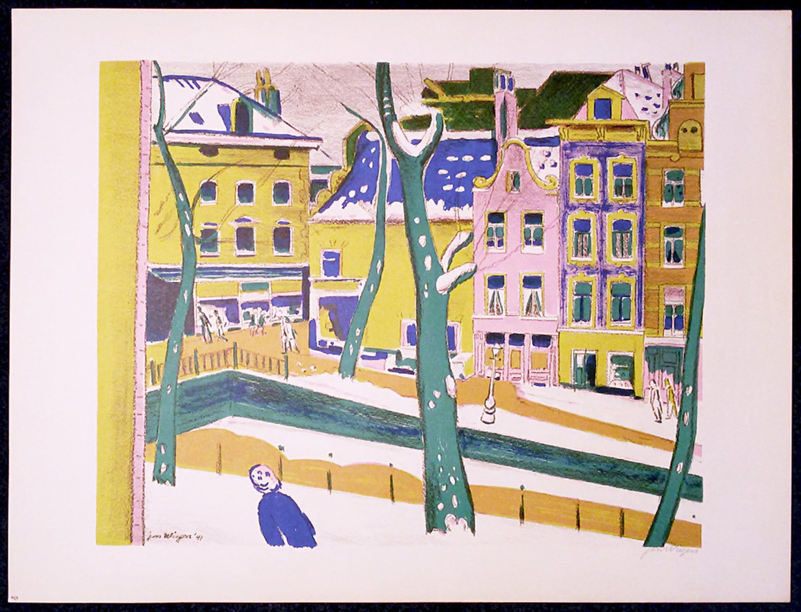 Prachtig gezicht op de Achterburgwal in Amsterdam van Jan Wiegers. Eén van de meest gezochte litho’s uit de reeks Schildersprenten uit 1947. Met potlood gesigneerd rechtsonder, en gedateerd (’47) en nogmaals gesigneerd linksonder in de steen. In zeer goede conditie.
