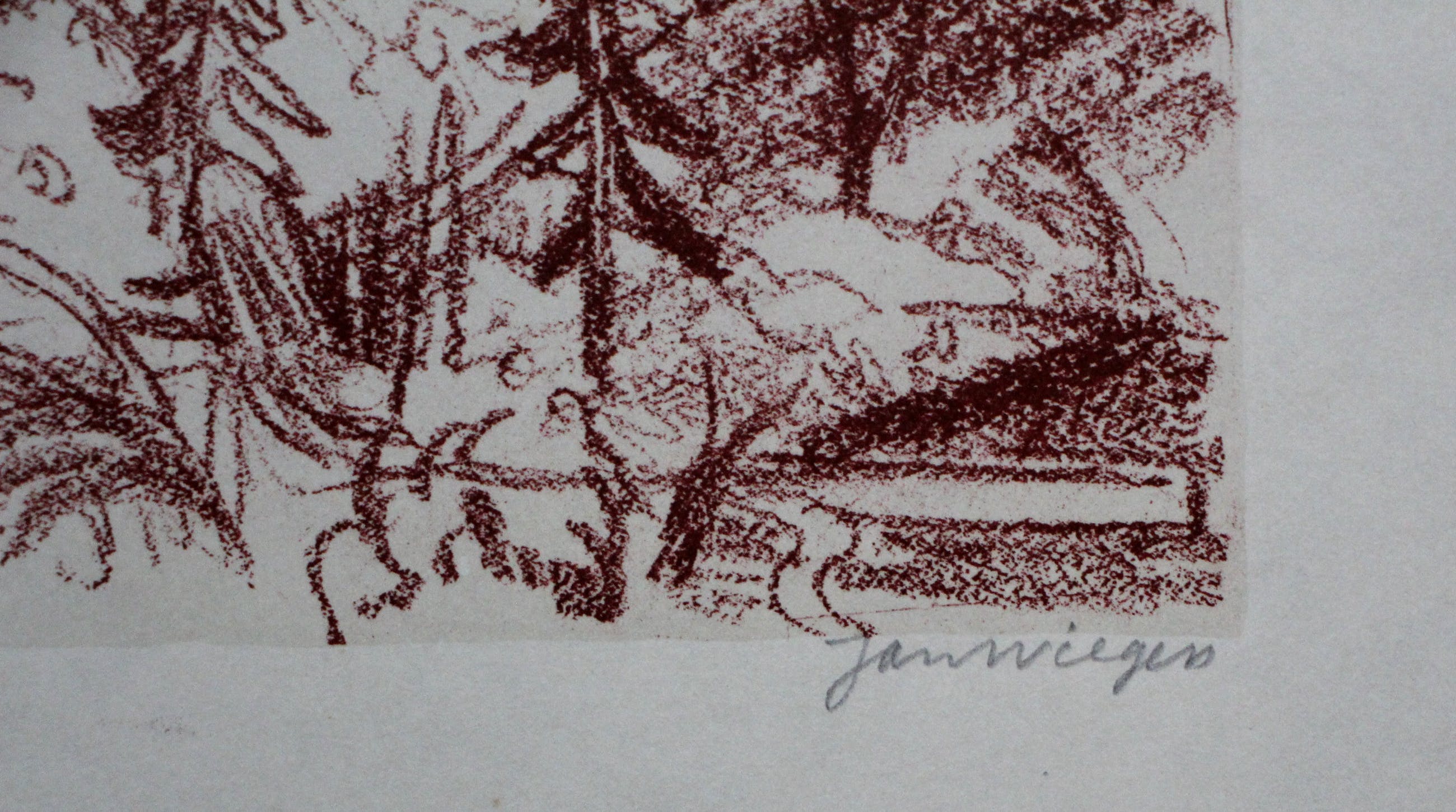 Litho van Jan Wiegers uit de serie Schildersprenten (1947). Met potlood gesigneerd rechtsonder, en gedateerd (’47) en nogmaals gesigneerd linksonder in de steen. Deze serie werd uitgegeven in een oplage van ongeveer 750, maar daarvan is naar schatting maar 10% met de hand gesigneerd en dat maakt deze handgesigneerde prent dus relatief wel zeldzaam.