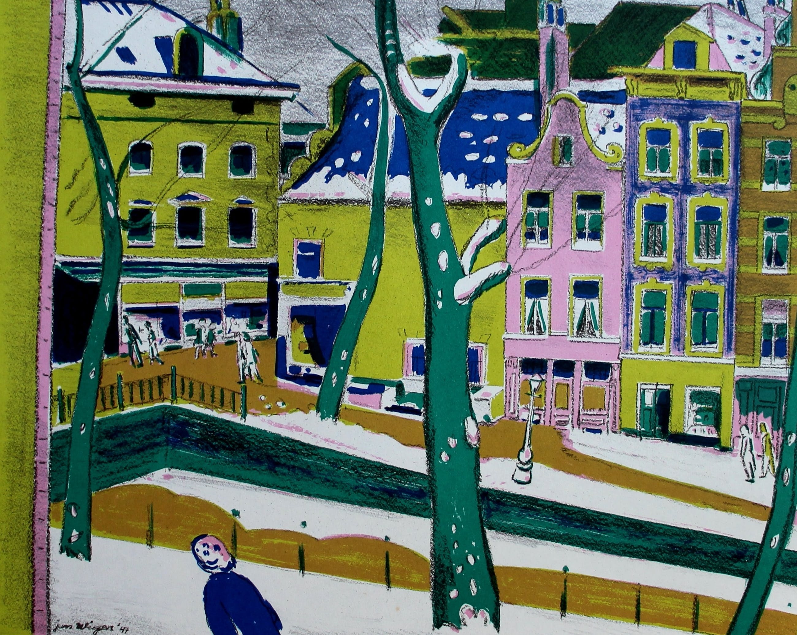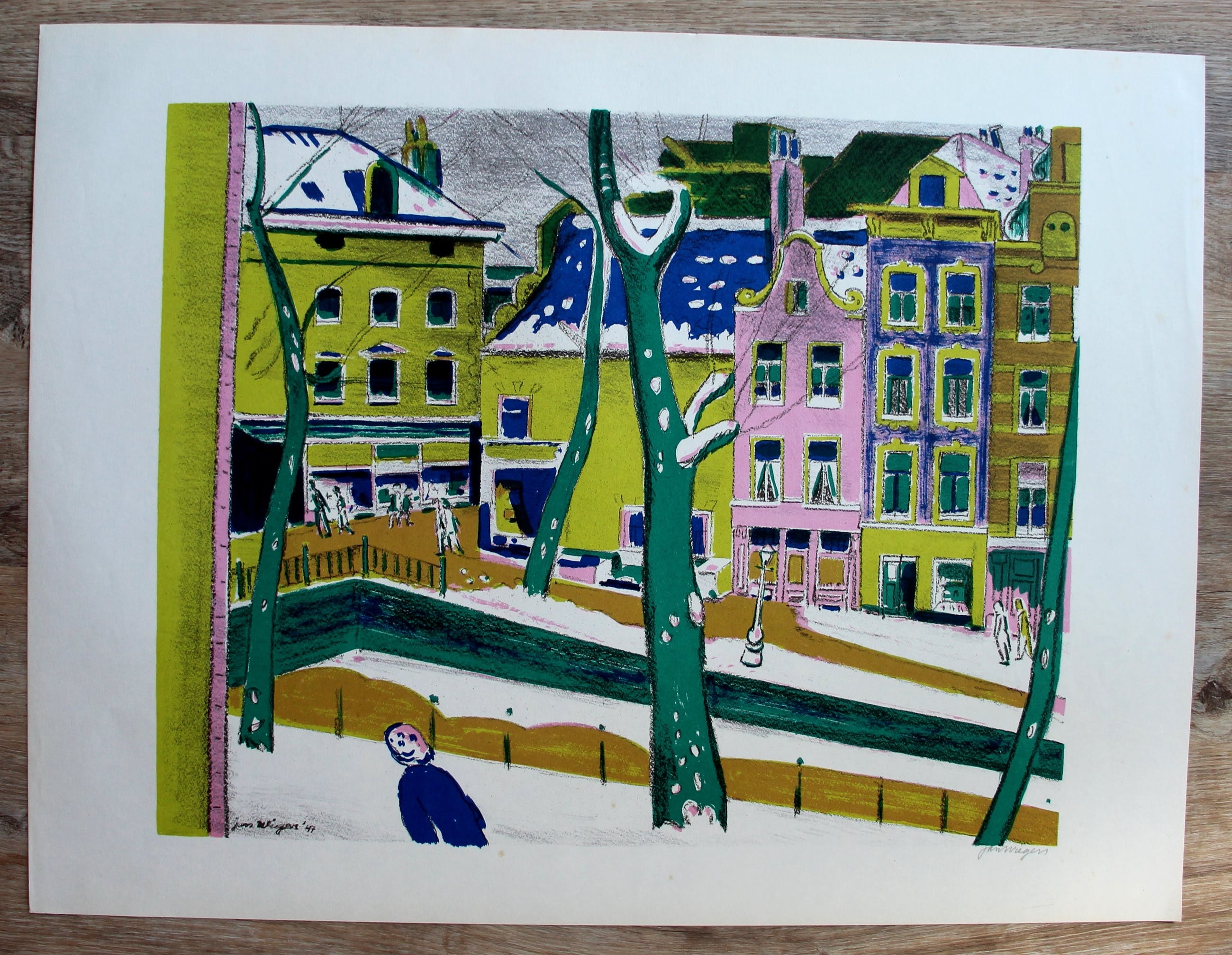 Kleurenlitho van Jan Wiegers. Titel: Achterburgwal. Jaar: 1947. Eén van de meest gezochte litho’s uit de reeks Schildersprenten uit 1947. Afmetingen blad: H47.5 x b63 cm. Afmetingen voorstelling: H38.5 x b48.5 cm. Het werk is linksonder in de druk gesigneerd en handgesigneerd door de kunstnaar.