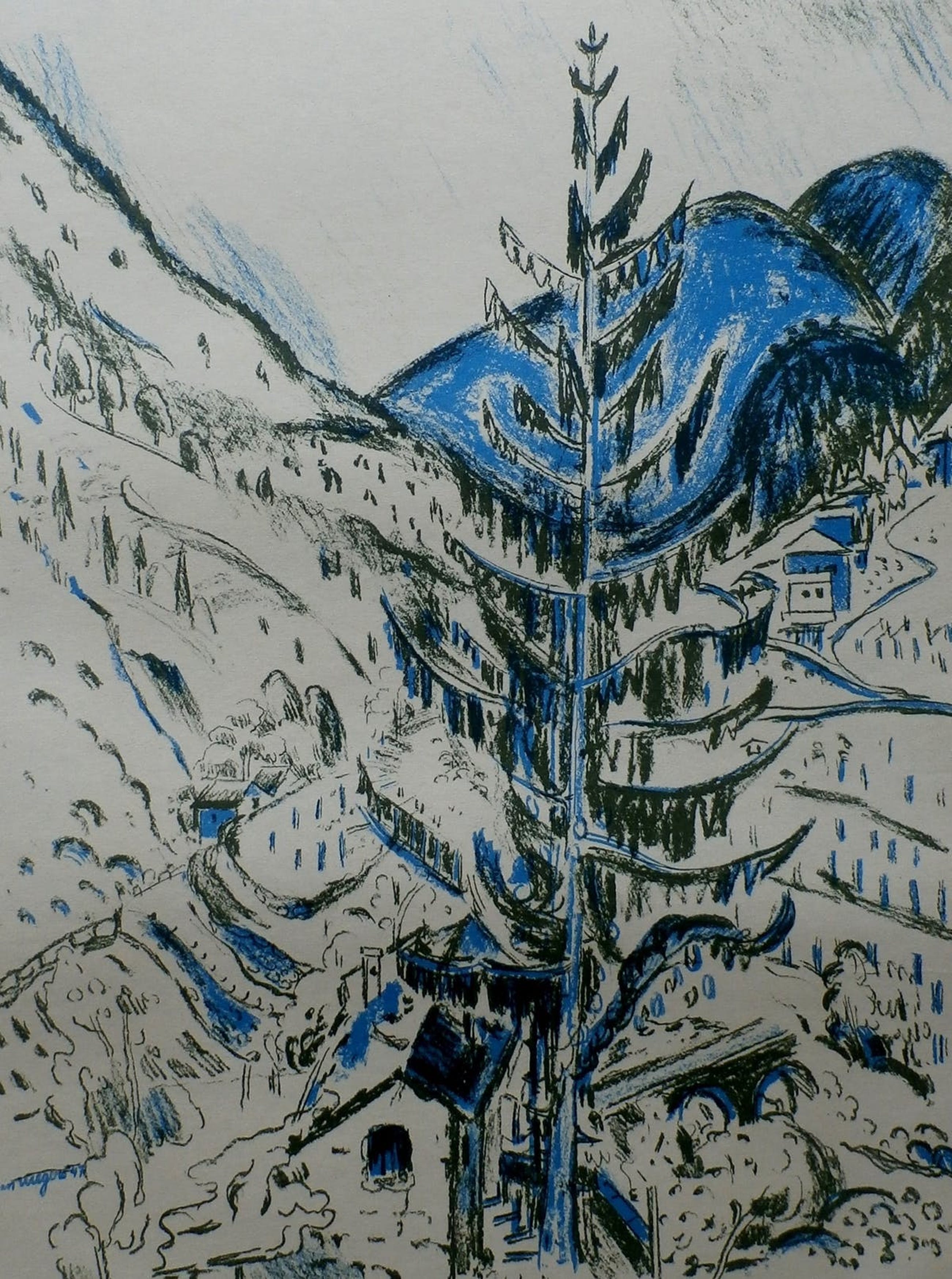 Kleurenlitho van Jan Wiegers. Titel: Alpenlandschap rond Davos. Jaar: 1947. Afmetingen blad: H63 x b47.5 cm. Afmetingen voorstelling: H44 x b33.5 cm. Het werk is linksonder in de druk, en rechtsonder met potlood, gesigneerd.