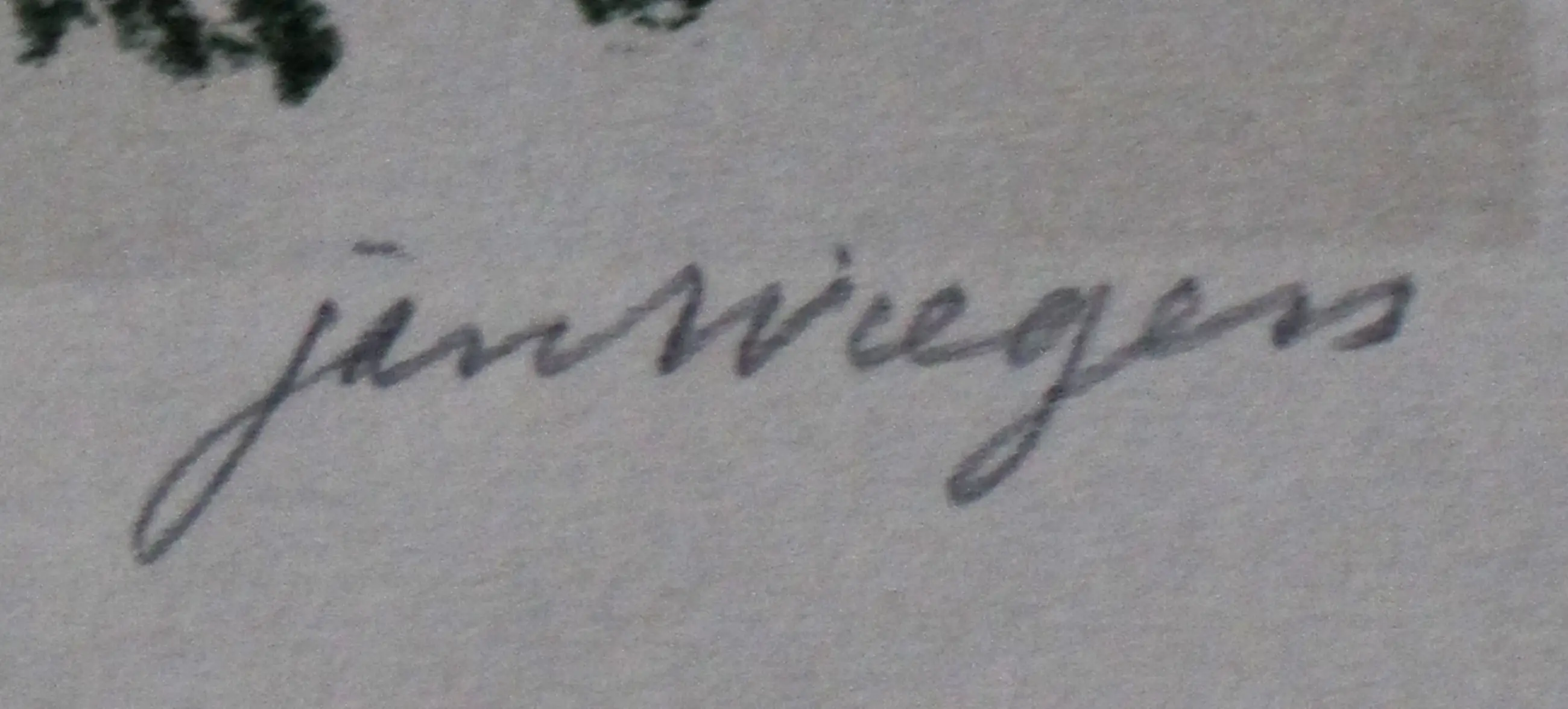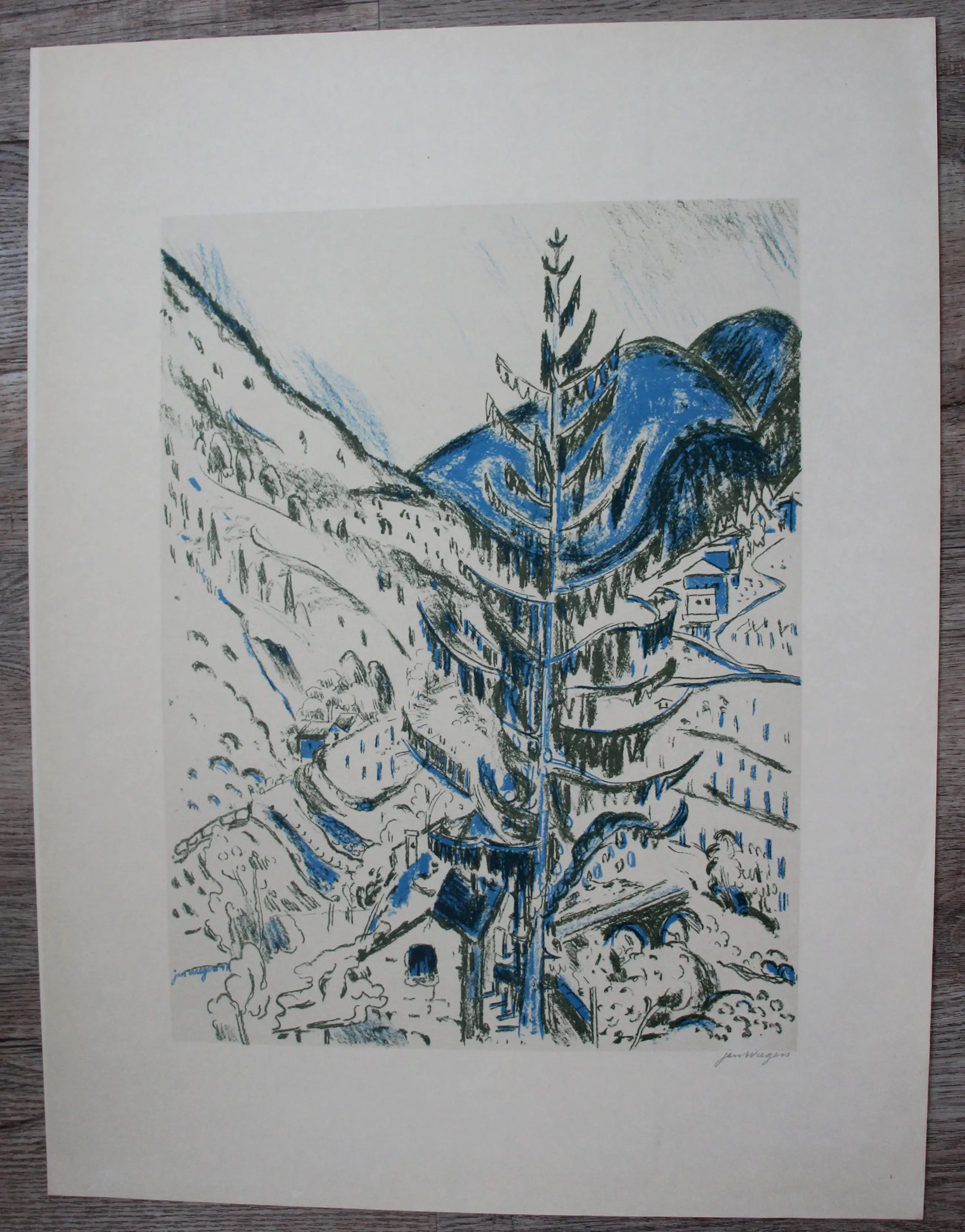 Kleurenlitho van Jan Wiegers. Titel: Alpenlandschap rond Davos. Jaar: 1947. Afmetingen blad: H63 x b47.5 cm. Afmetingen voorstelling: H44 x b33.5 cm. Het werk is linksonder in de druk, en rechtsonder met potlood, gesigneerd. De authenticiteit van het, aangeboden, werk wordt volledig gegarandeerd. Een certificaat van echtheid kan, op aanvraag, worden gemaild.