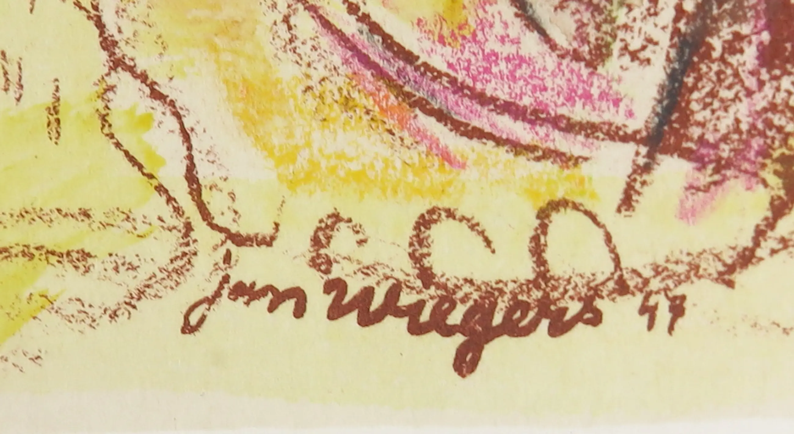 | Het papier is wat vergeeld. Let op: het werk is ingelijst achter plastic, daar zitten eveneens wat krassen op. | |