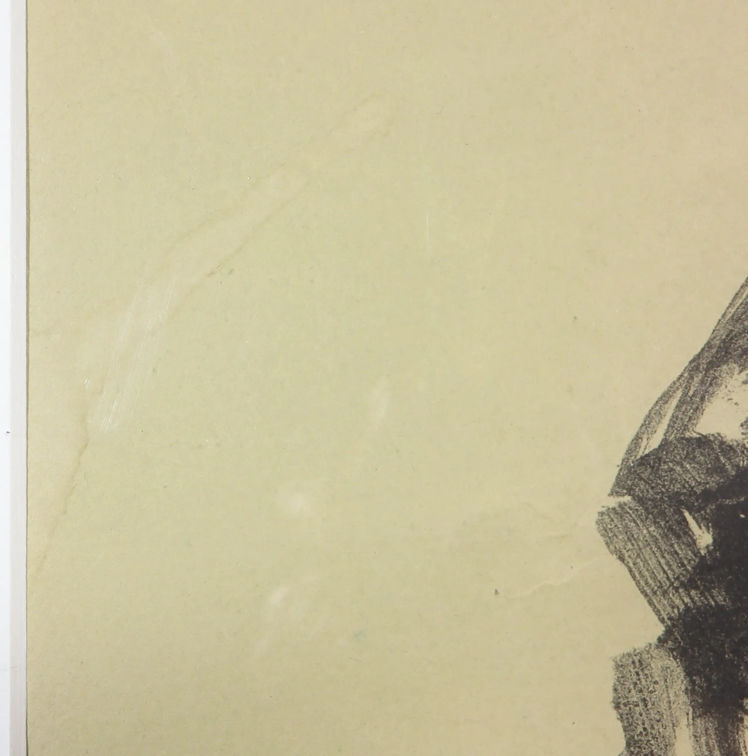 | In het papier zitten wat kreukels en verkleuring. Let op: dit werk is ingelijst achter plastic, daar zitten eveneens wat krassen op. | |