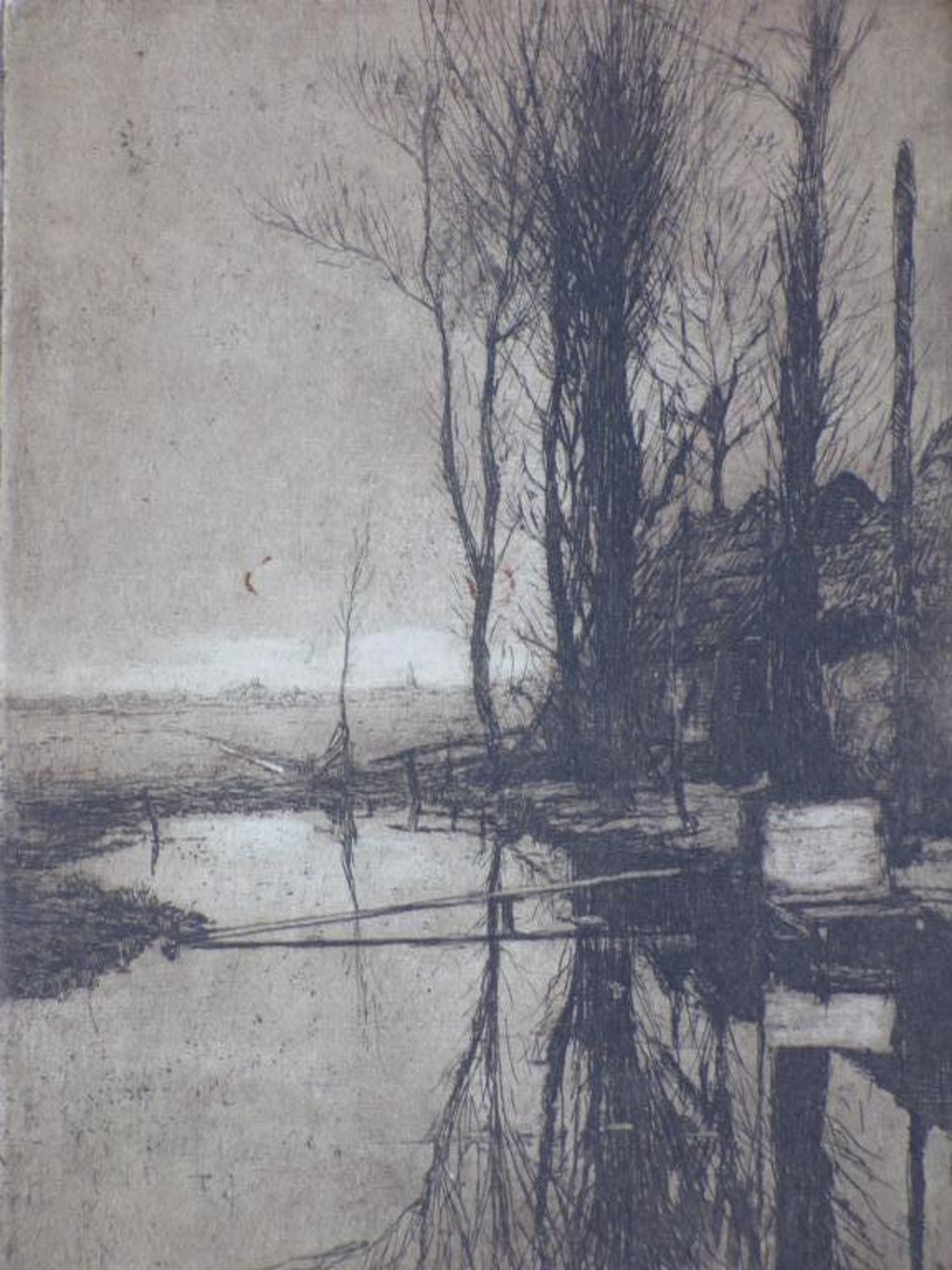 Voorstelling in de stijl van de Haagse School van een boerderij aan een poldersloot