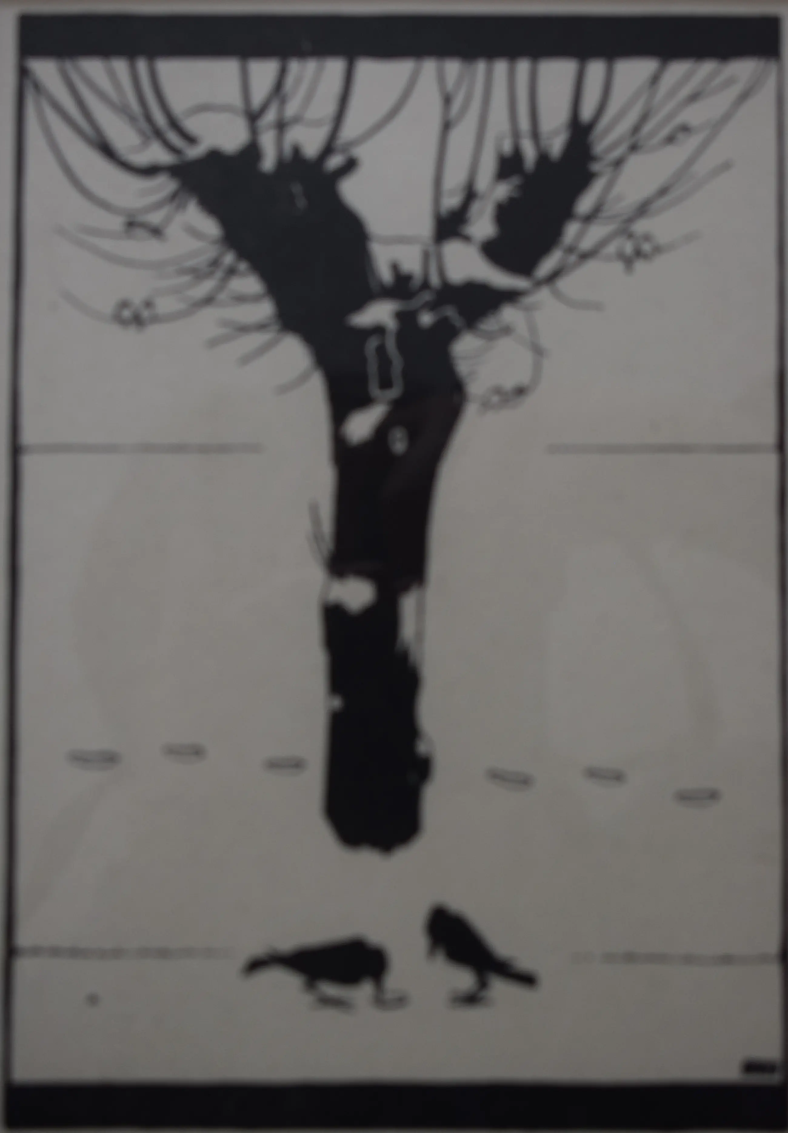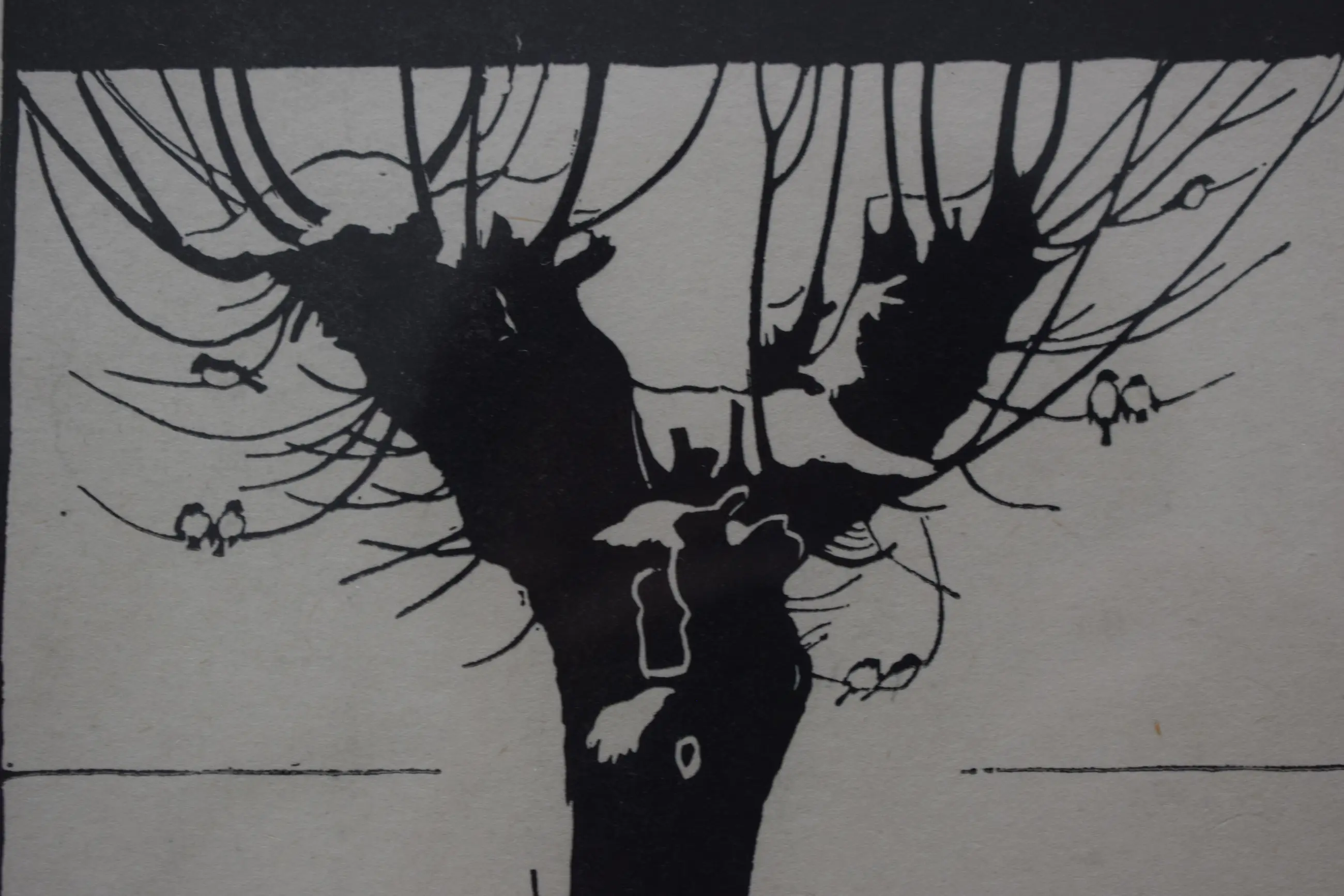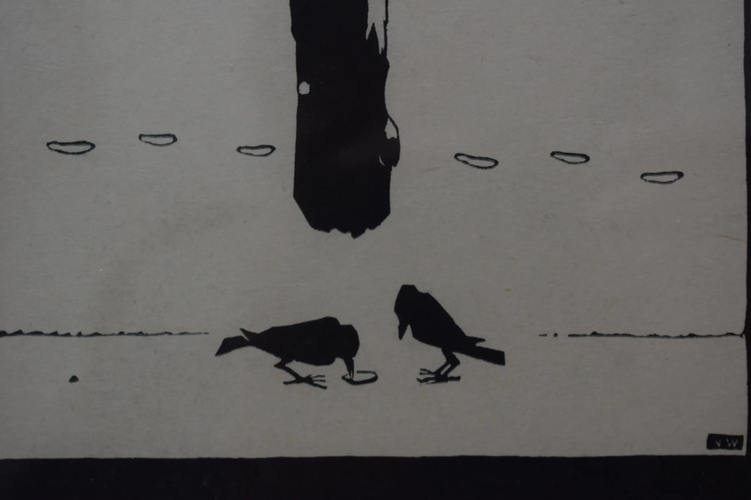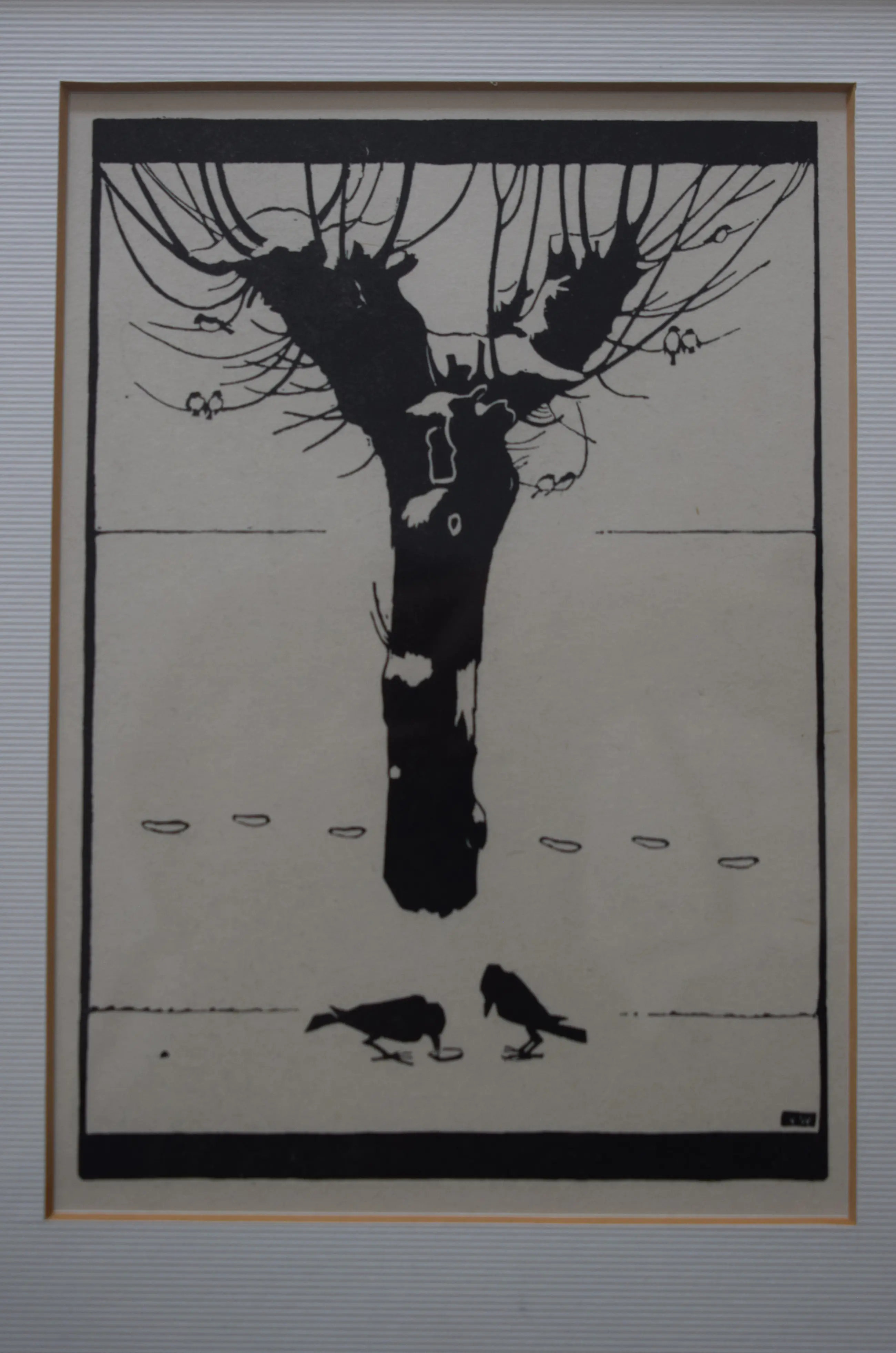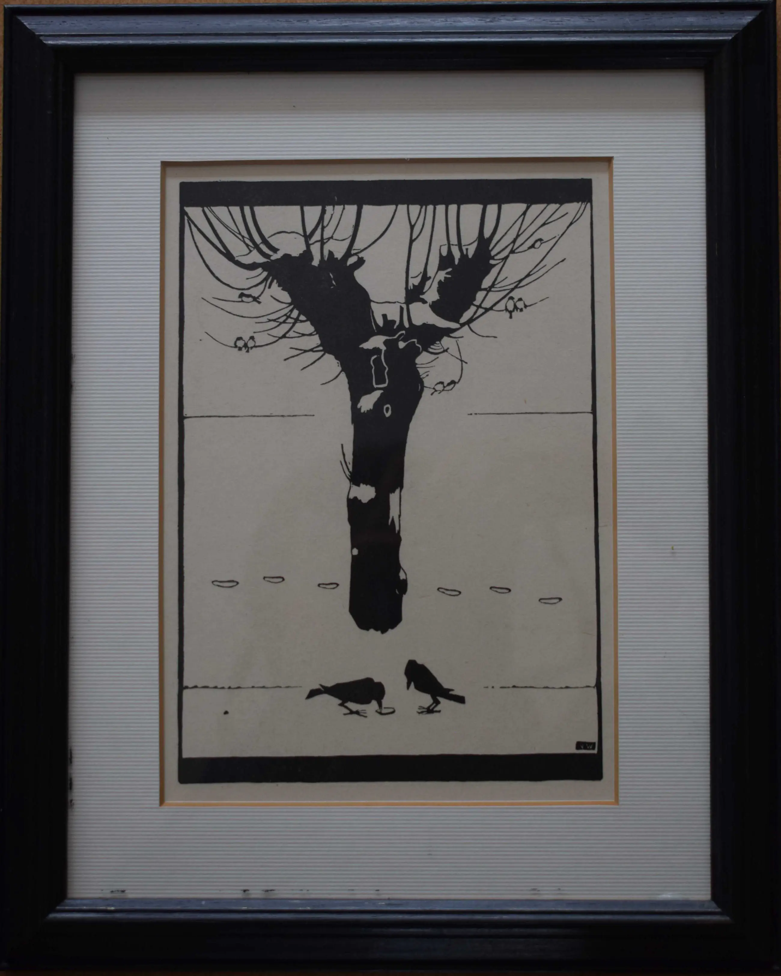 Hier zijn twee kraainen te zien voor een besneeuwde knotwilg. In de knotwilg zit een groep met vogels 2 aan twee. Monogram JW rechtsonder.
