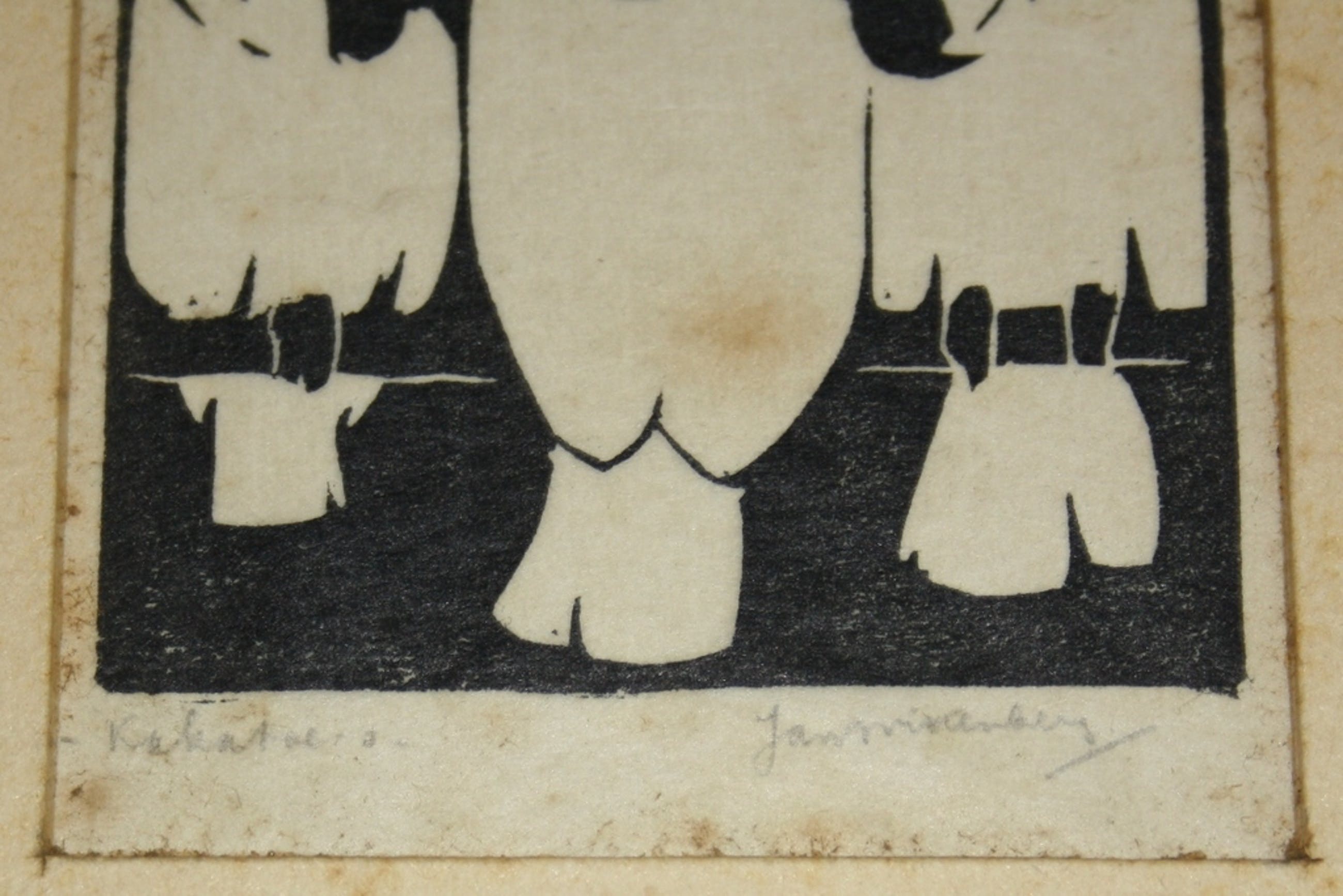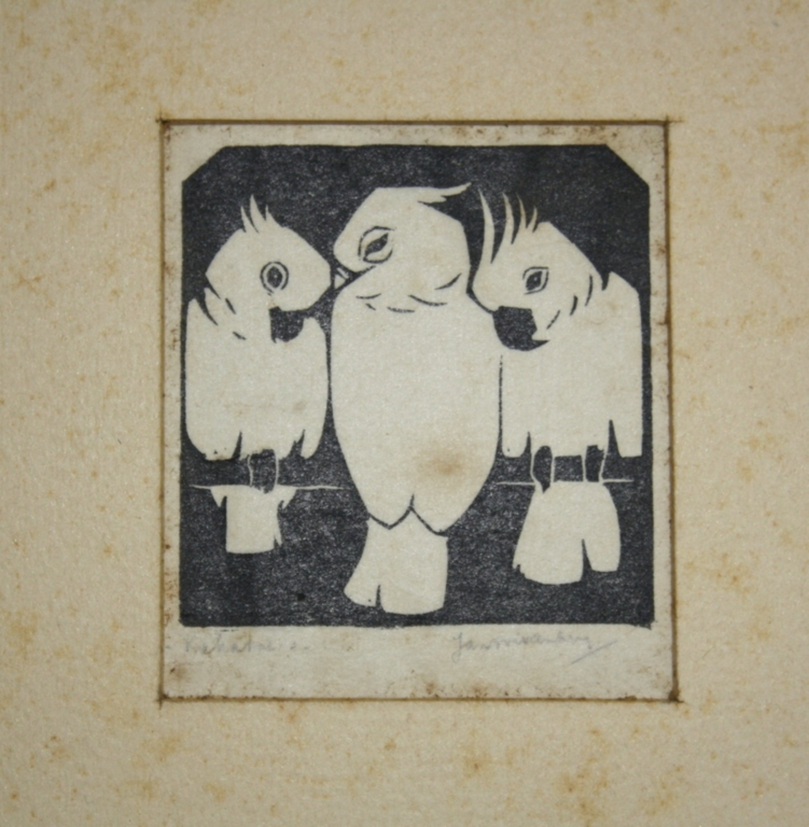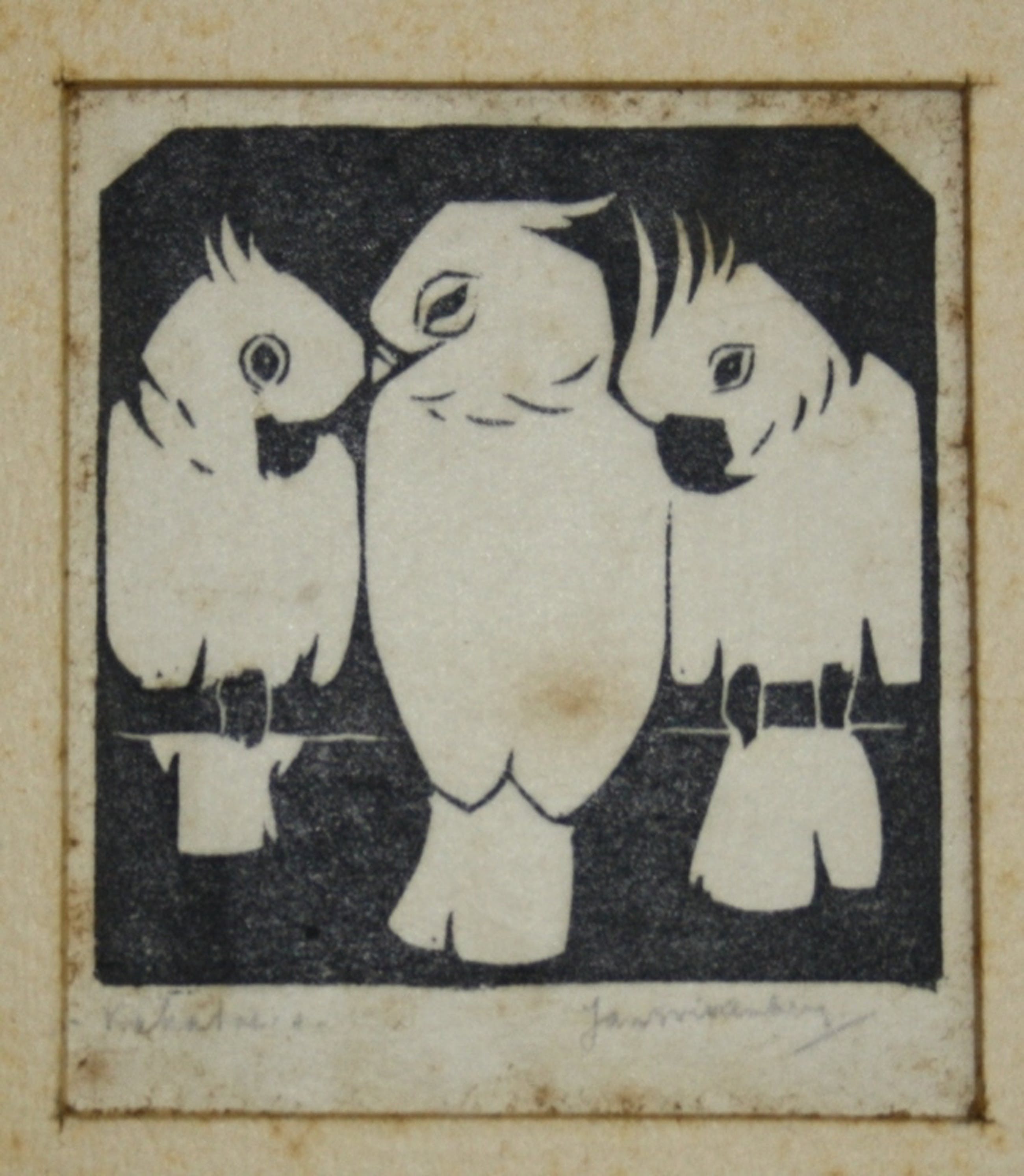 Houtsnede "kaketoes". Houtsnede zit nog achter het originele passe-partout. Beeldmaat 6,5 cm x 7 cm. Met potlood gesigneerd en betiteld. Heeft wel een schoonmaakbeurtje nodig!