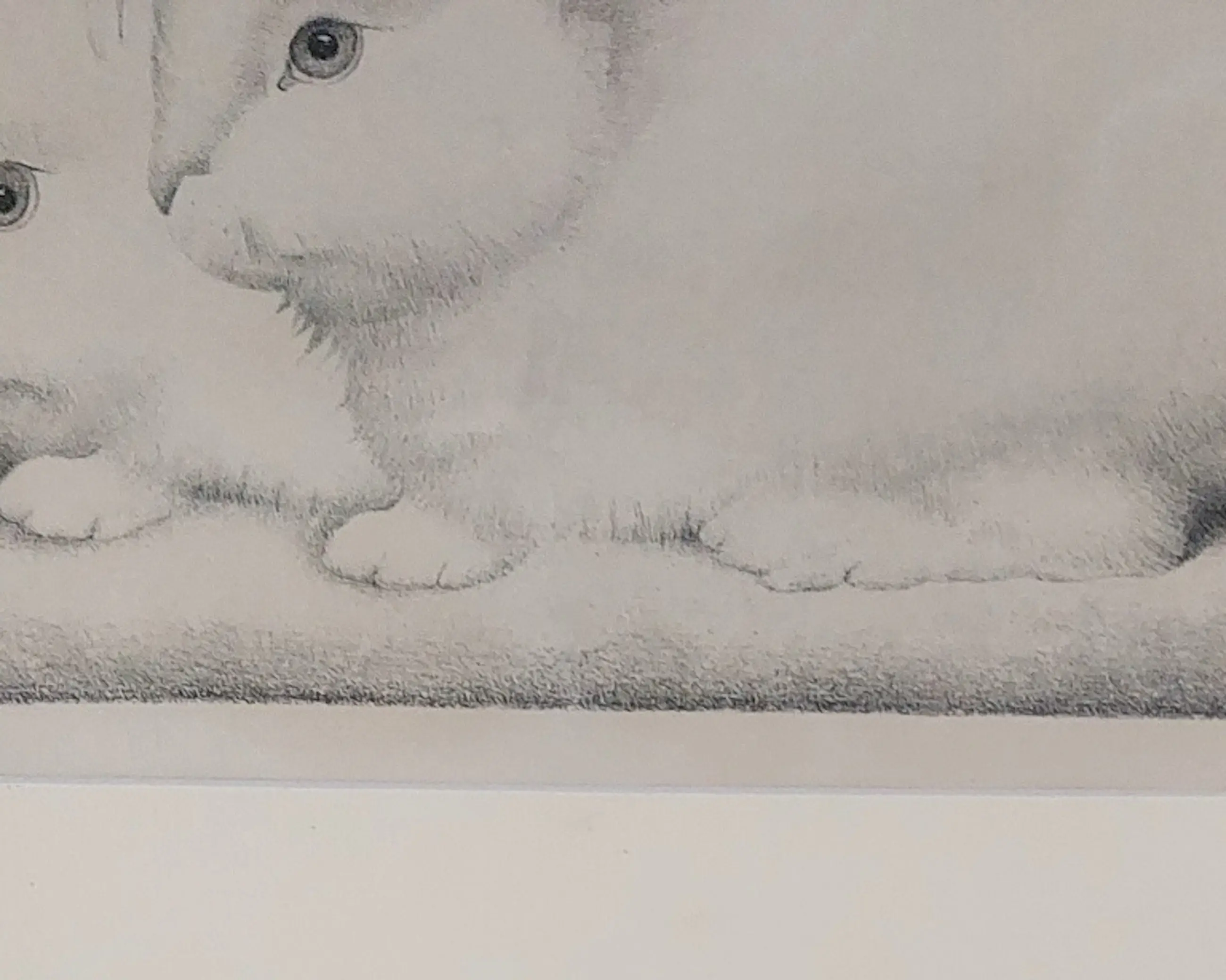 ik zie een nauwelijks zichtbaar scheurtje in het papier, op de foto helemaal niet zichtbaar. Niet uit de lijst geweest. Je moet echt 3x kijken wil jet het opmerken. Mooi ingelijst!
