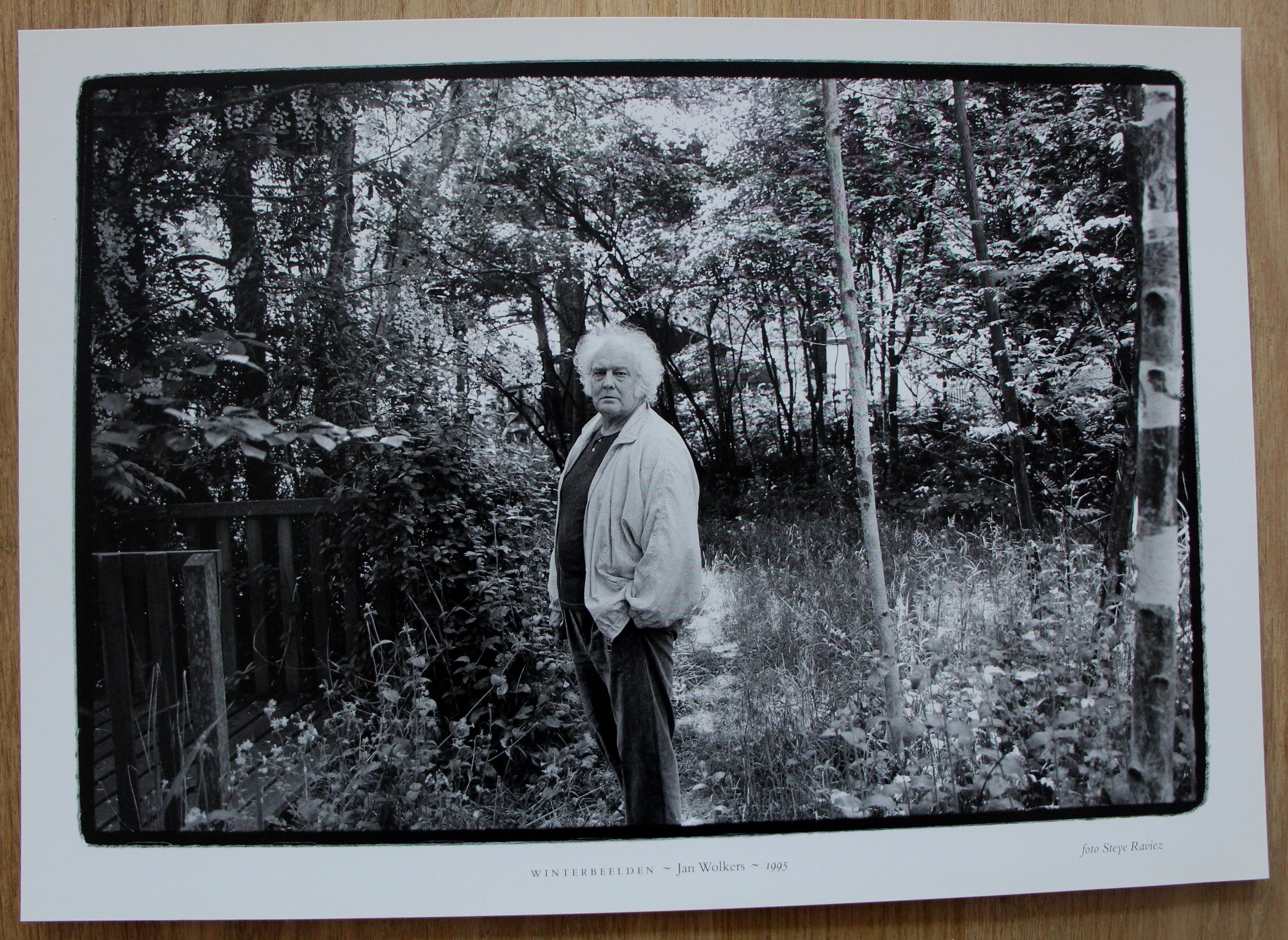 Karakteristieke foto door Steye Raviez (1942-2017). Fotografeerde Jan Wolkers in de natuurlijke omgeving van zijn woning op Texel. Gemaakt voor de serie Winterbeelden in 1995. Afmetingen blad: H31 x b44cm. Afbeeldingen voorstelling: H27 x b40cm.