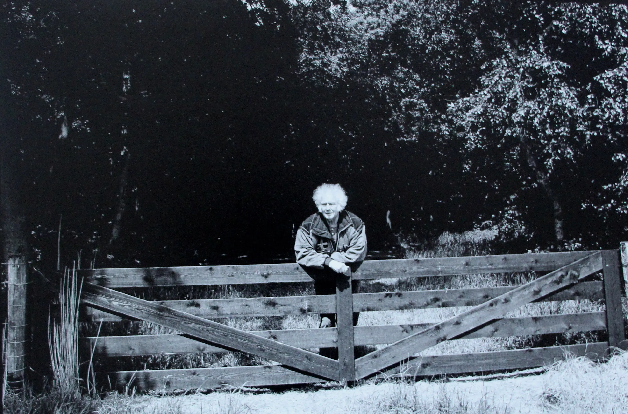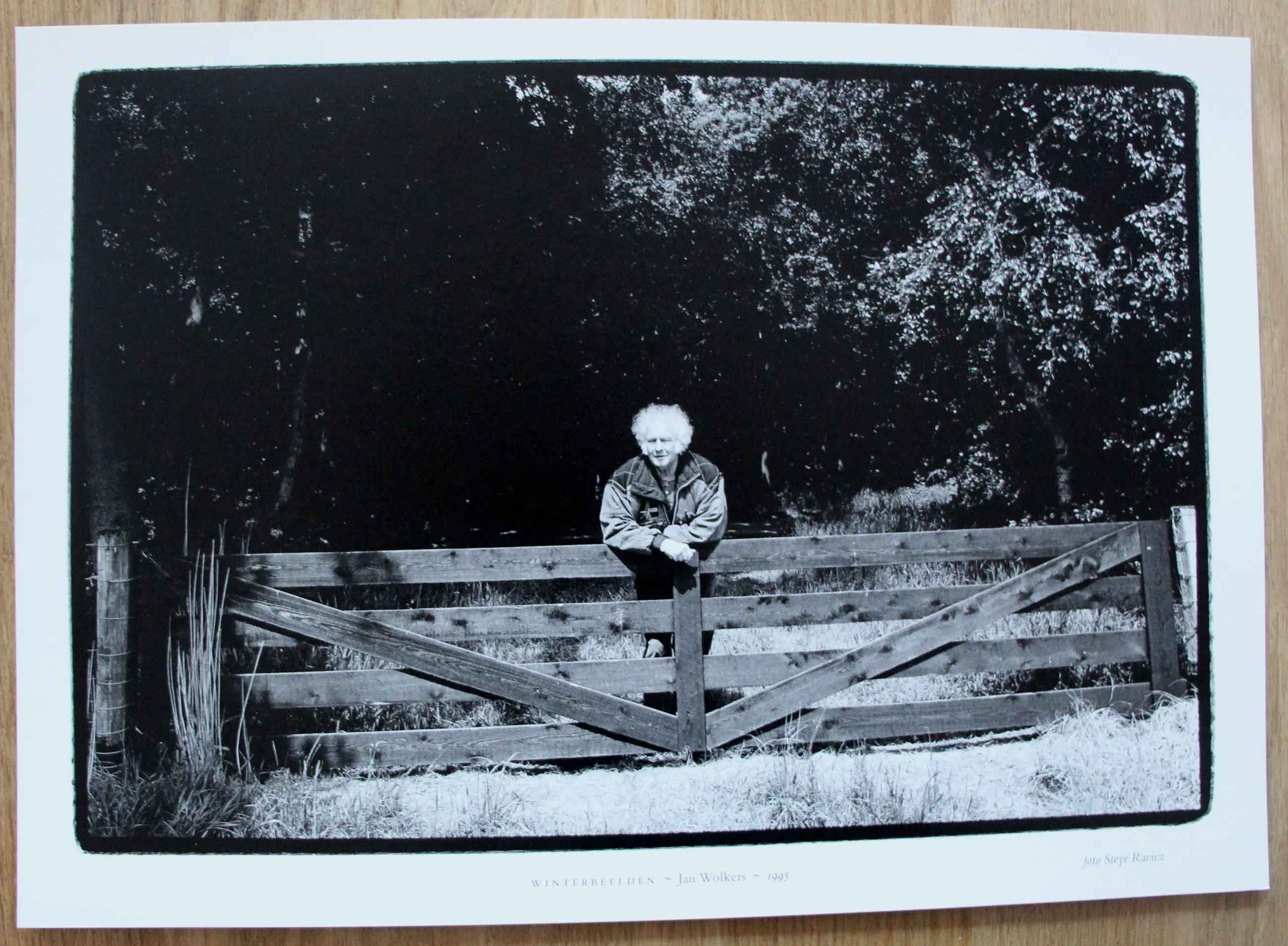 Karakteristieke foto door Steye Raviez (1942-2017). Fotografeerde Jan Wolkers in de natuurlijke omgeving van zijn woning op Texel. Gemaakt voor de serie Winterbeelden in 1995. Afmetingen blad: H31 x b44cm. Afbeeldingen voorstelling: H27 x b40cm.