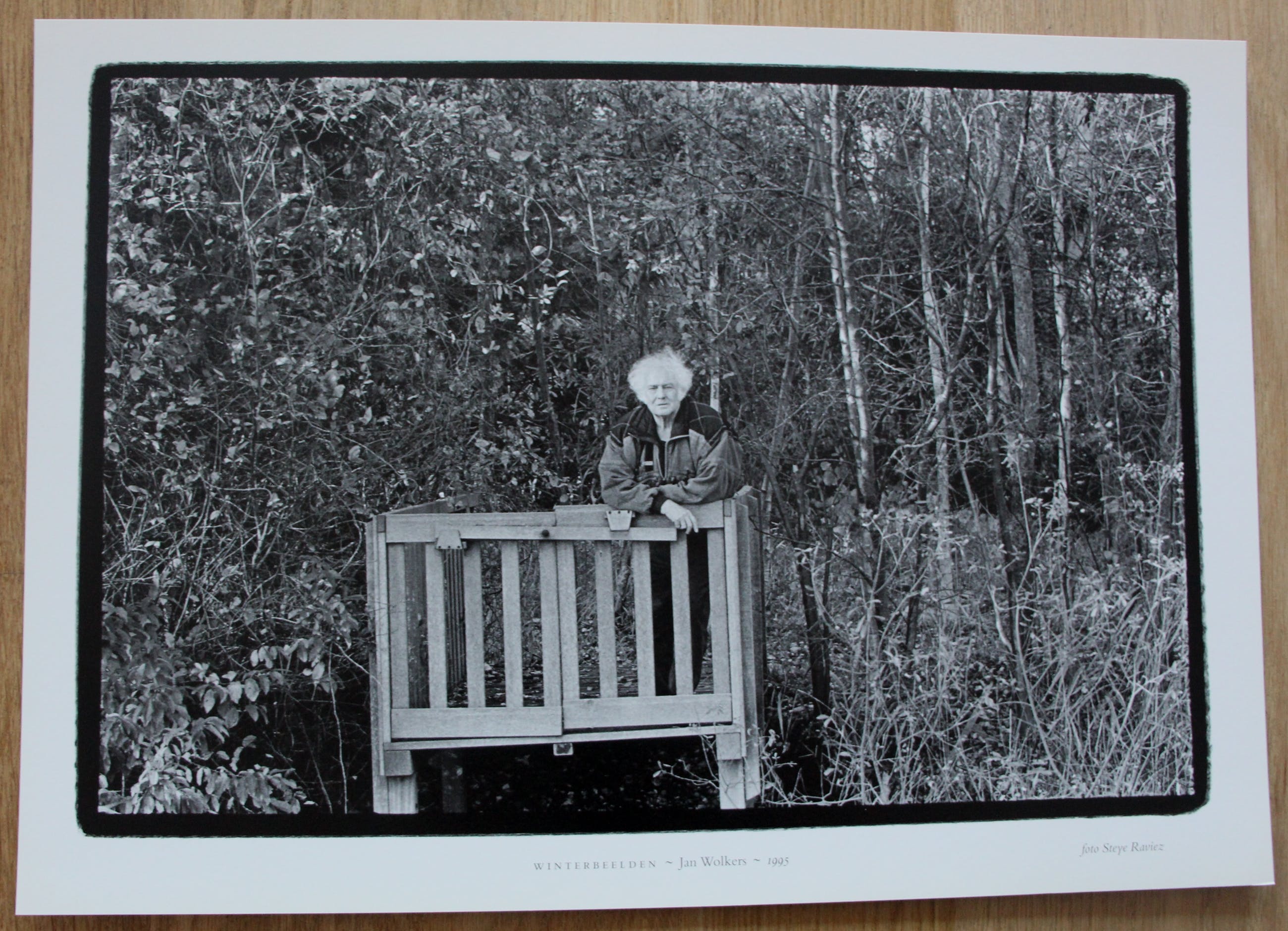 Karakteristieke foto door Steye Raviez (1942-2017). Fotografeerde Jan Wolkers in de natuurlijke omgeving van zijn woning op Texel. Gemaakt voor de serie Winterbeelden in 1995. Afmetingen blad: H31 x b44cm. Afbeeldingen voorstelling: H27 x b40cm.