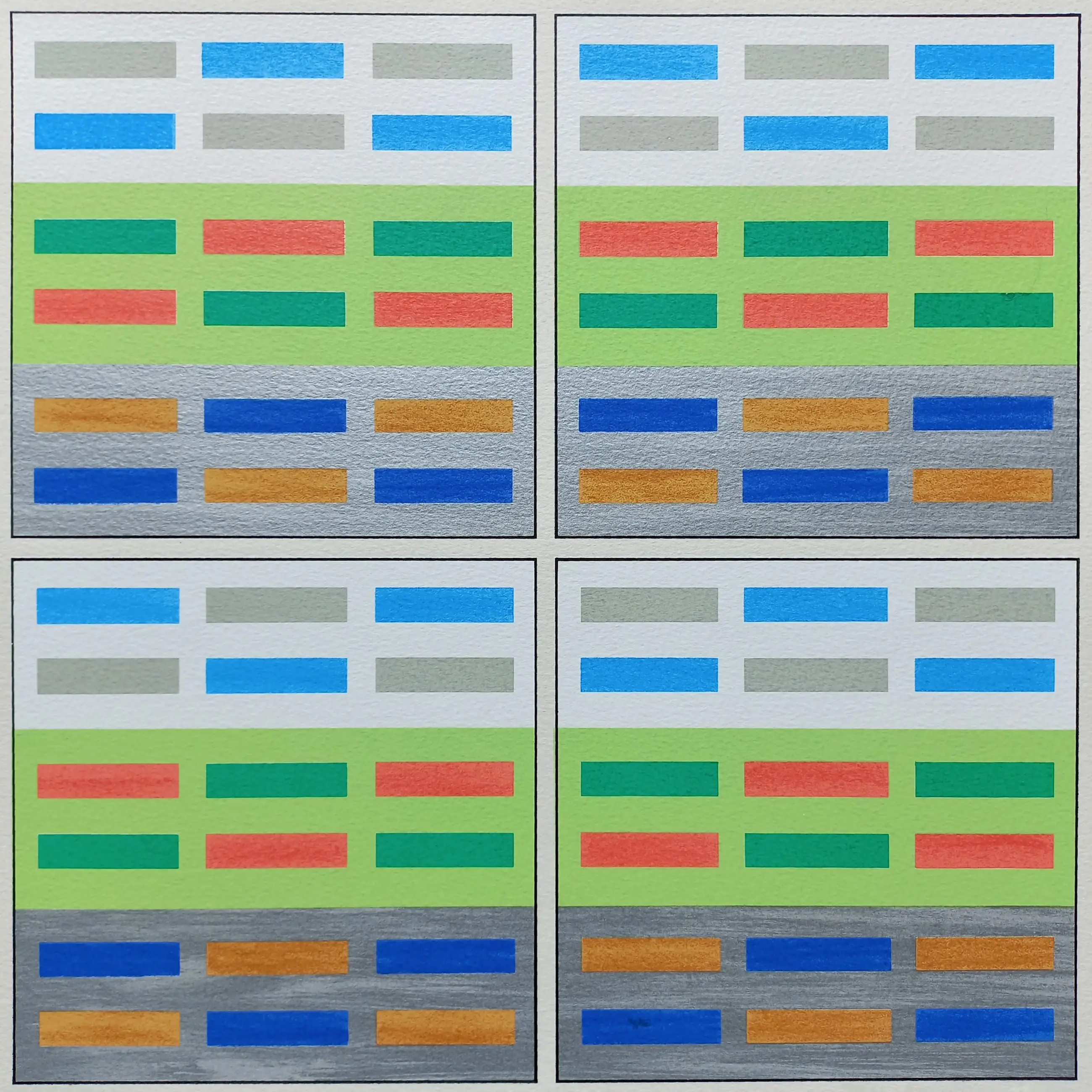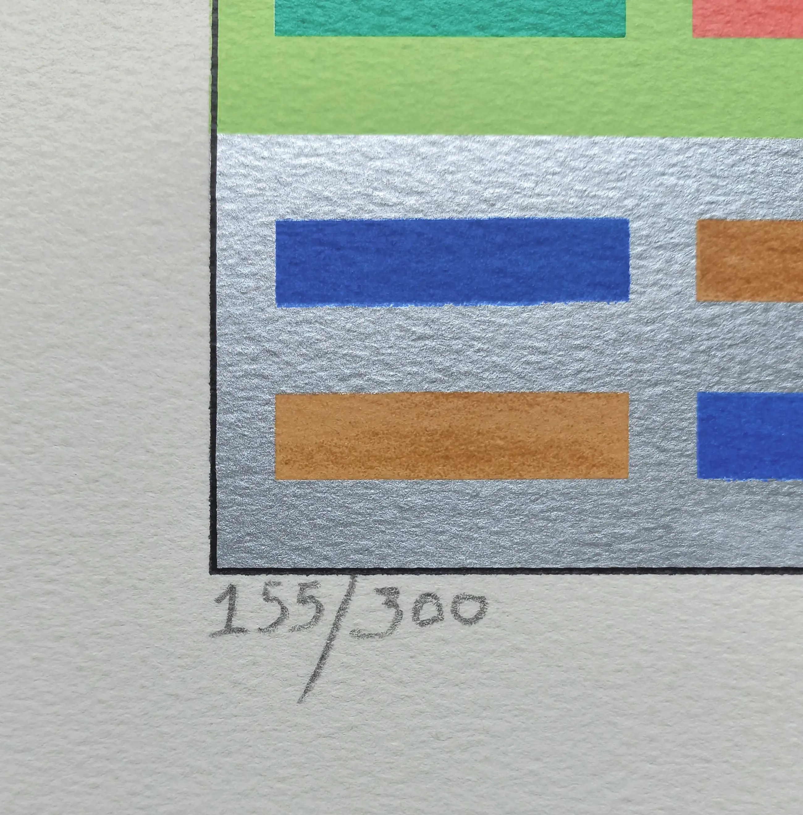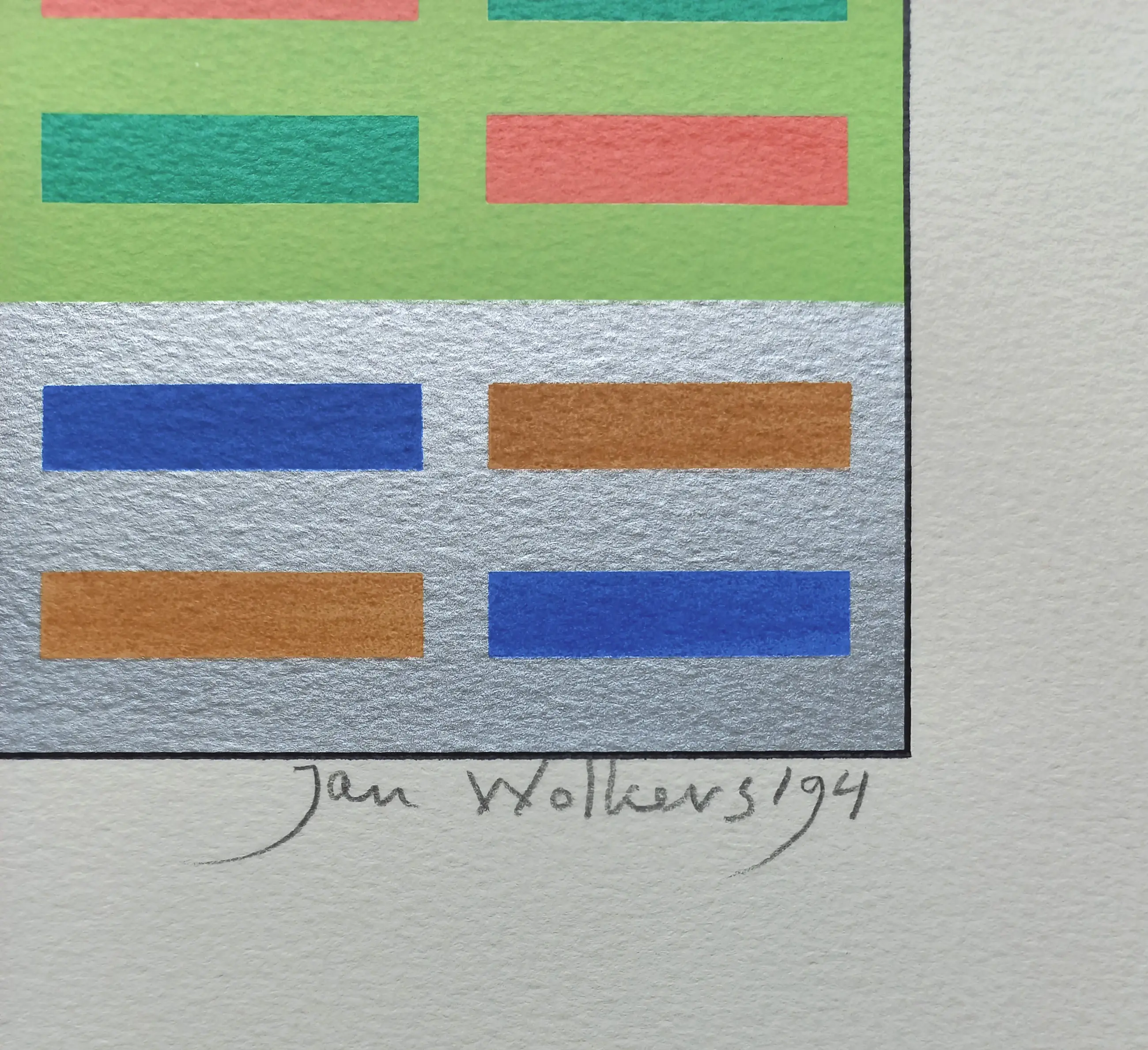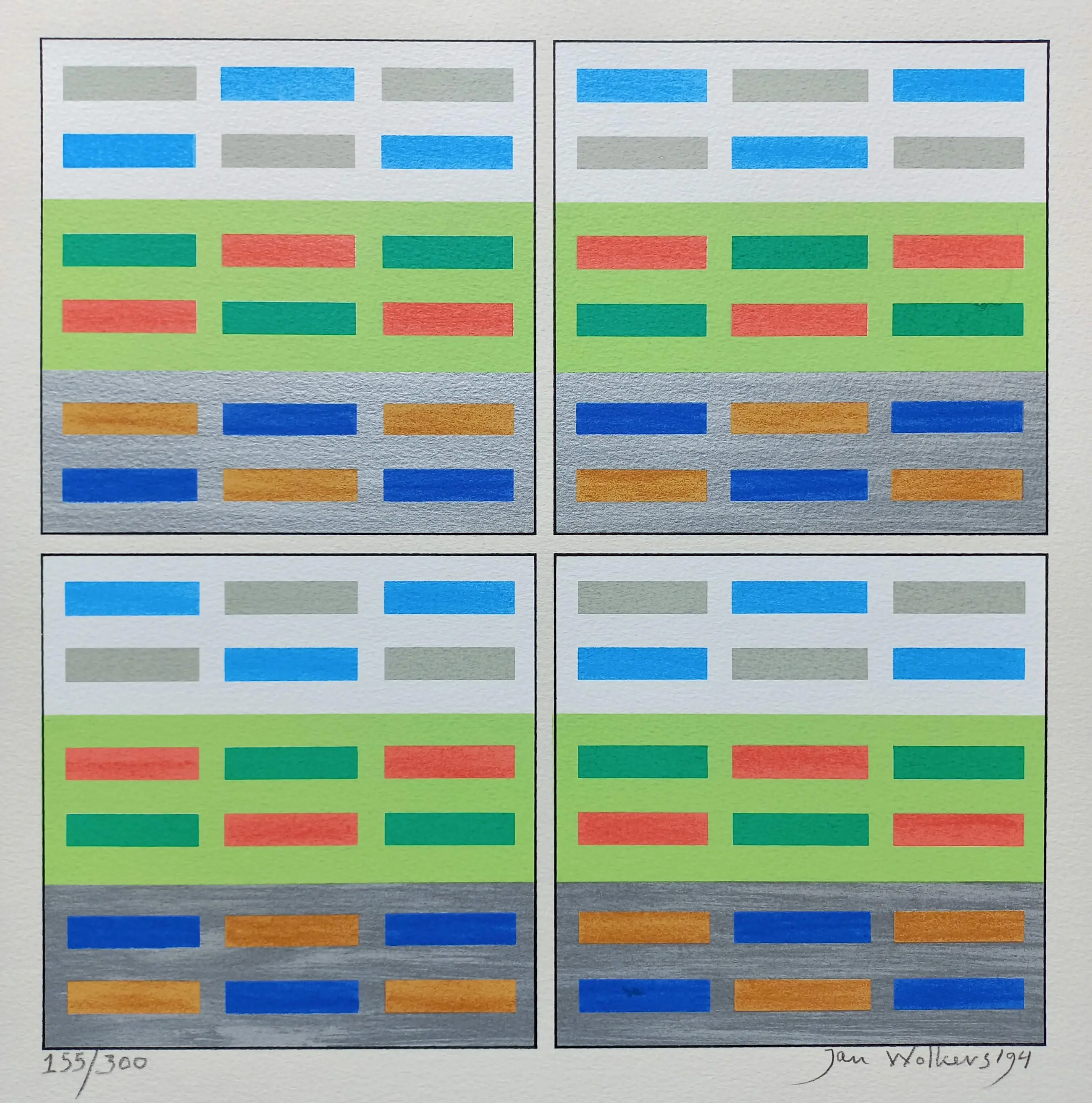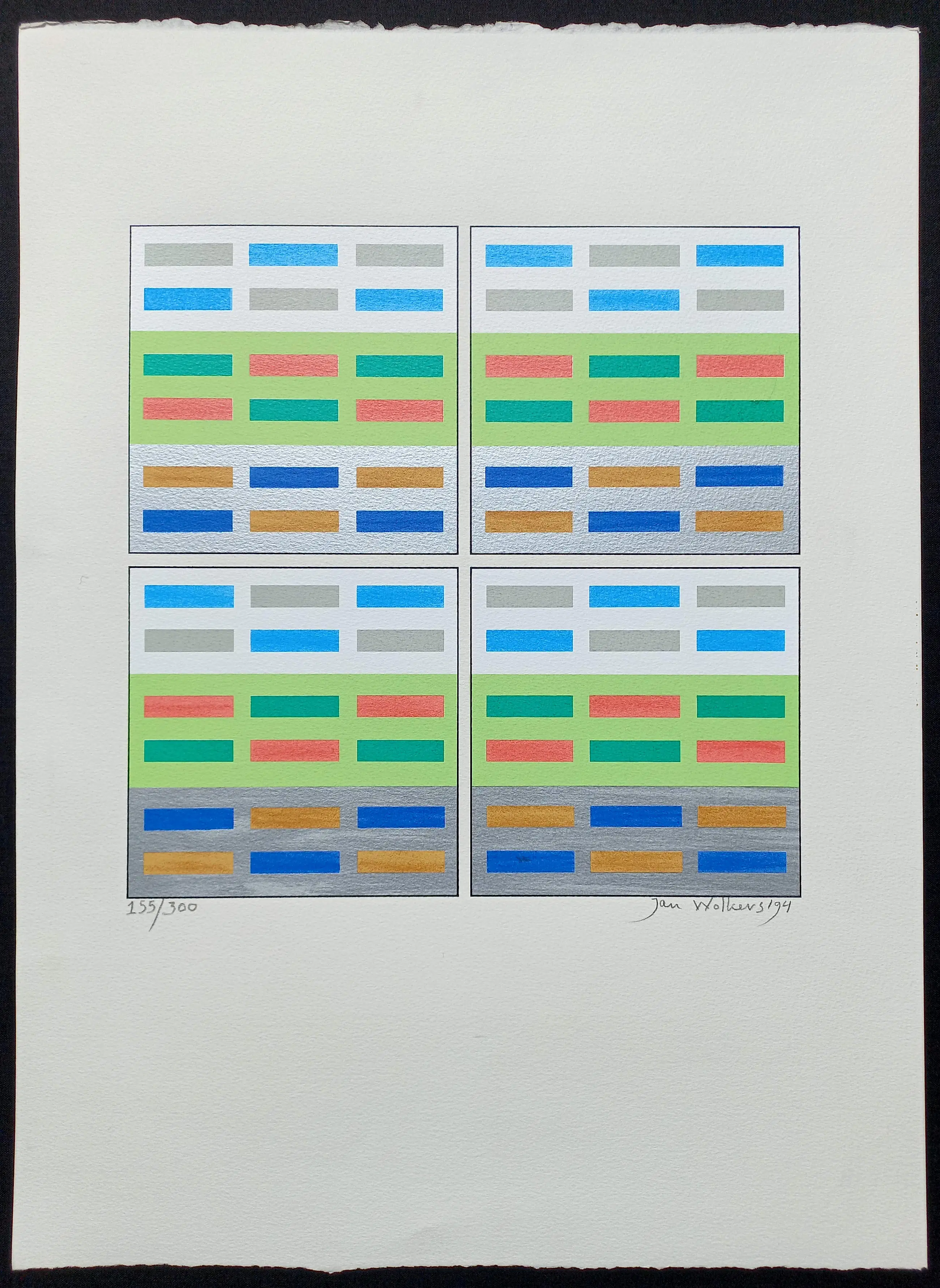 Schitterende geometrische compositie van Jan Wolkers uit 1994. Zeefdruk op geschept papier, met potlood gesigneerd, gedateerd en genummerd (55/300). In zeer goede conditie.