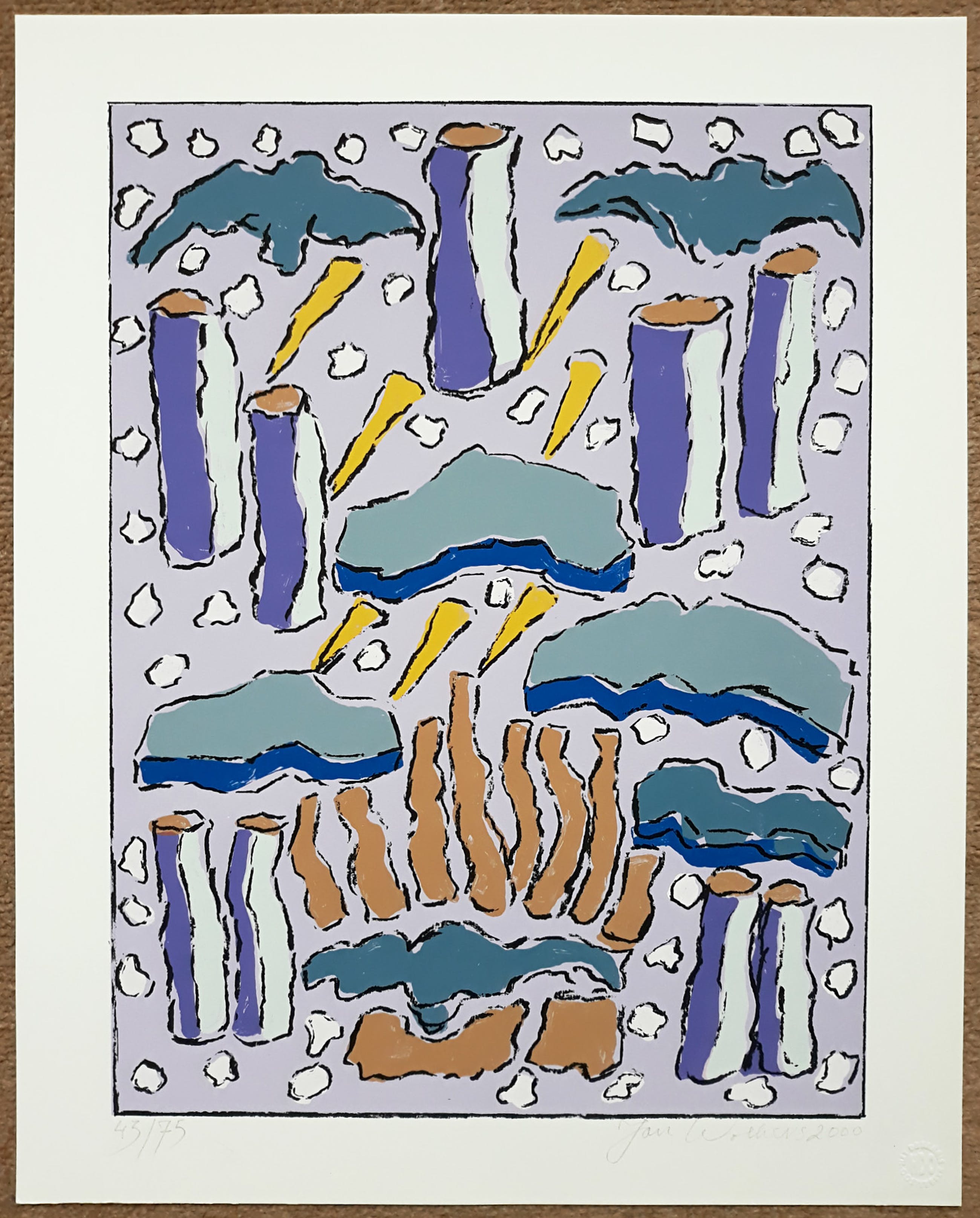 Prachtig werk van Jan Wolkers, uitgegeven ter gelegenheid van Wolkers’ 75e verjaardag. Zeefdruk op papier, met potlood gesigneerd, gedateerd (2000) en genummerd (43/75), en met blindstempel van “Het Drukhuis Oosterbeek”. In mint conditie.