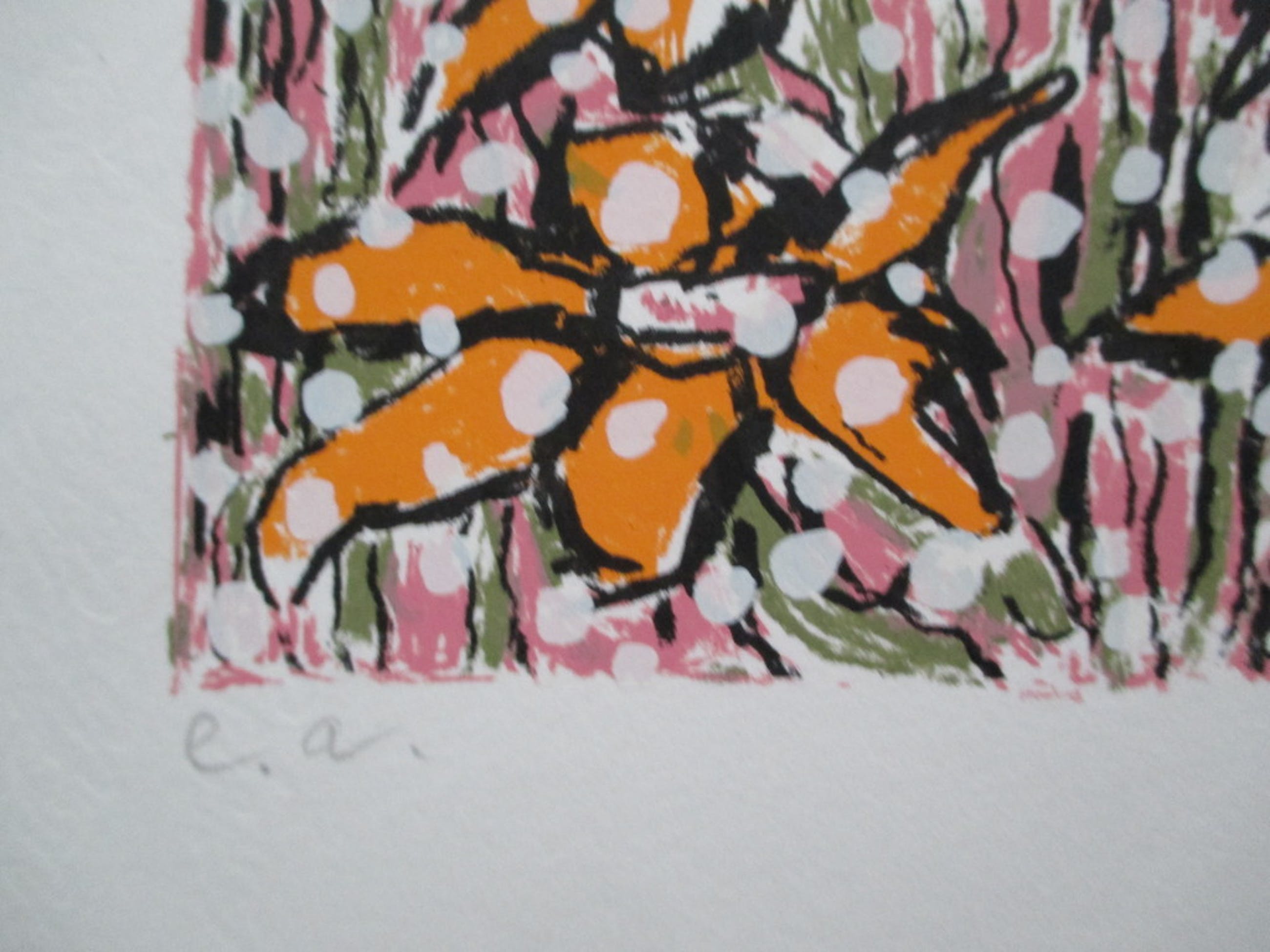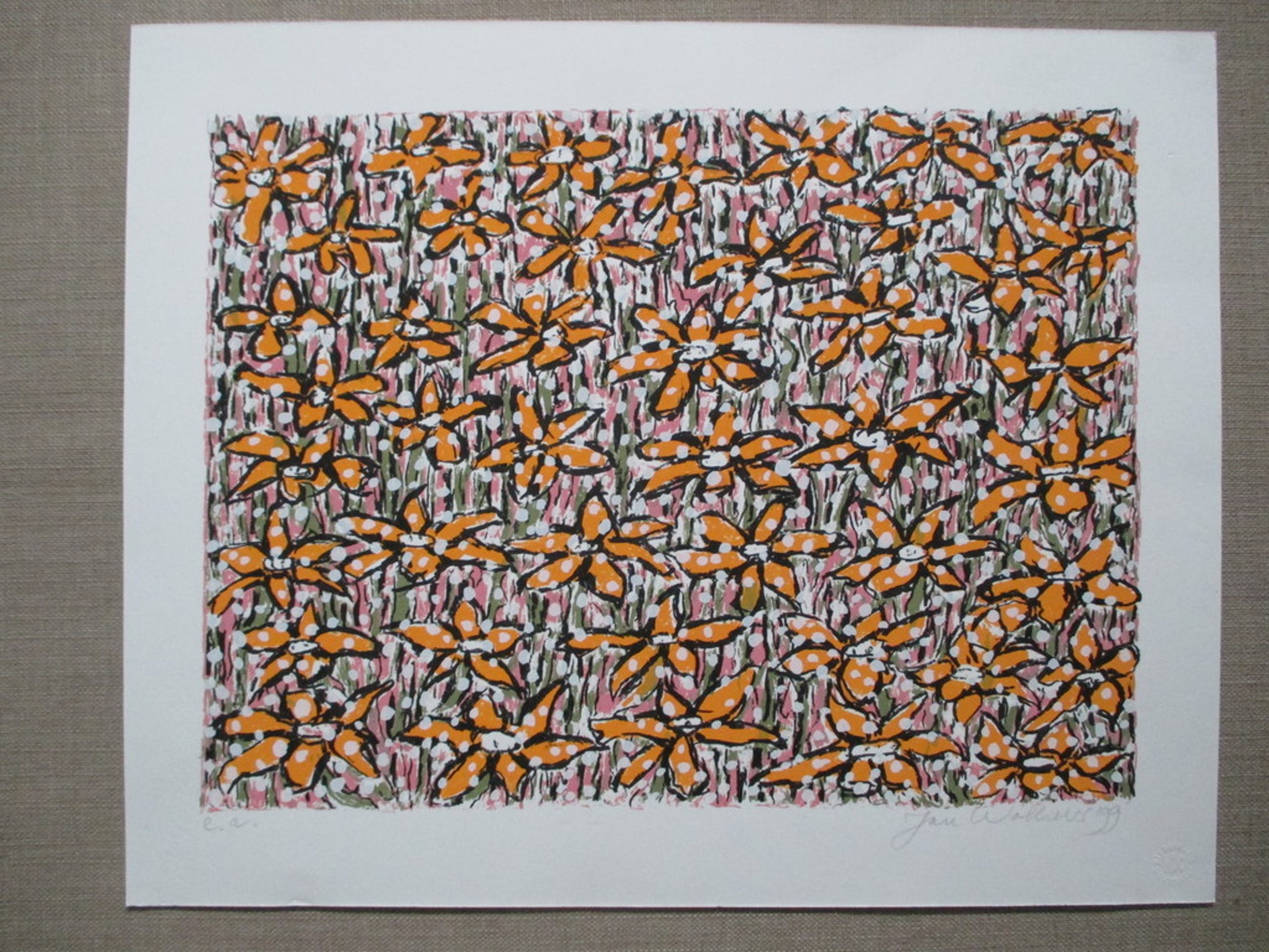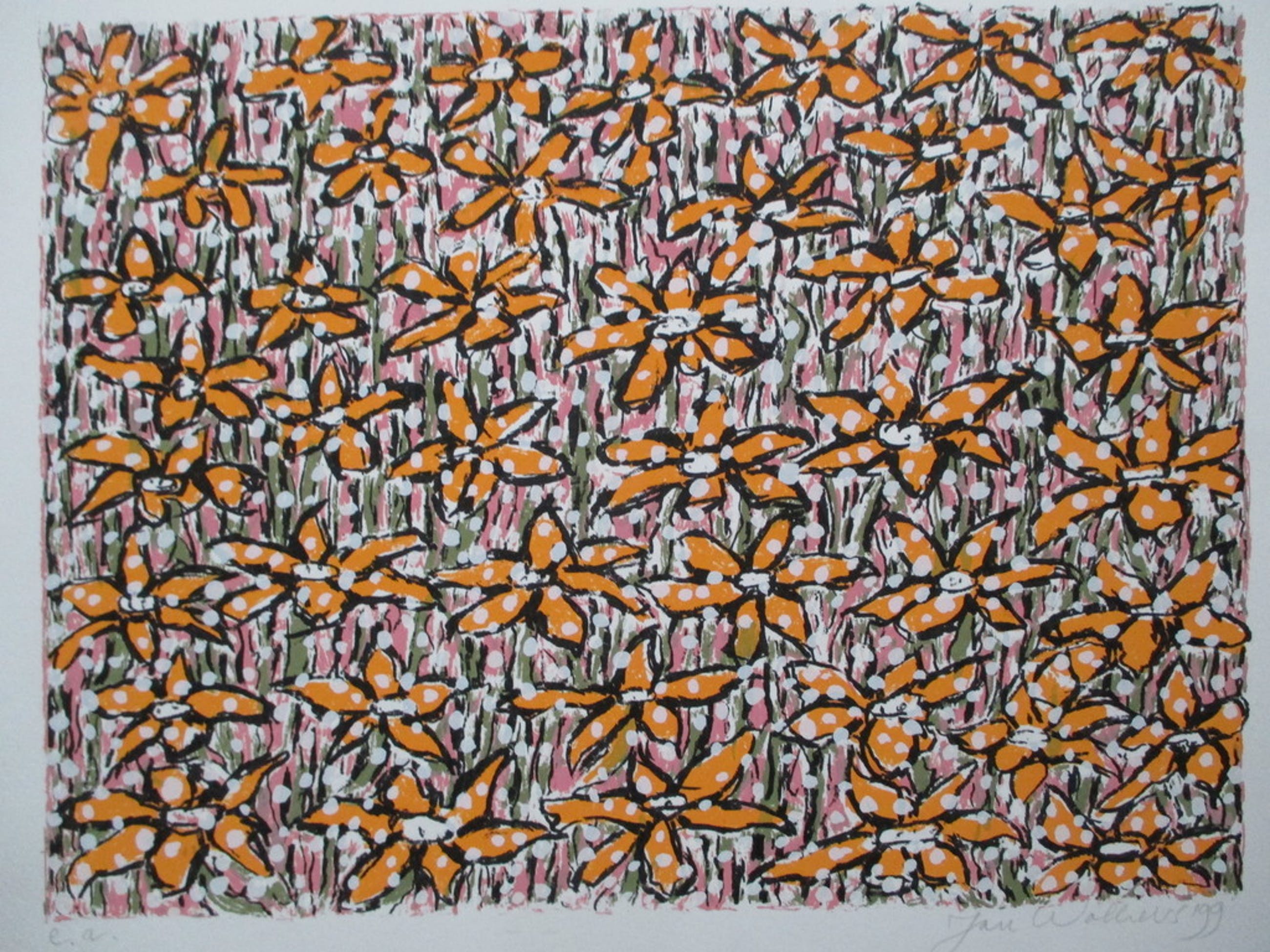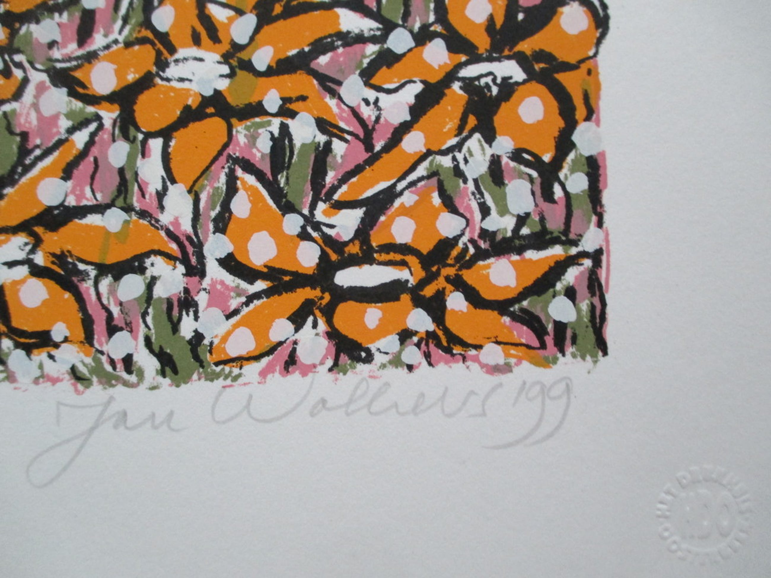 Zeefdruk van Jan Wolkers uit 1999, getiteld "Bloei in de sneeuw", r.o gesigneerd en gedateerd '99 in potlood, l.o E(preuve) A(rtiste) in potlood. Afm. blad 37,7 x 47 cm. In perfecte staat, nooit ingelijst geweest.